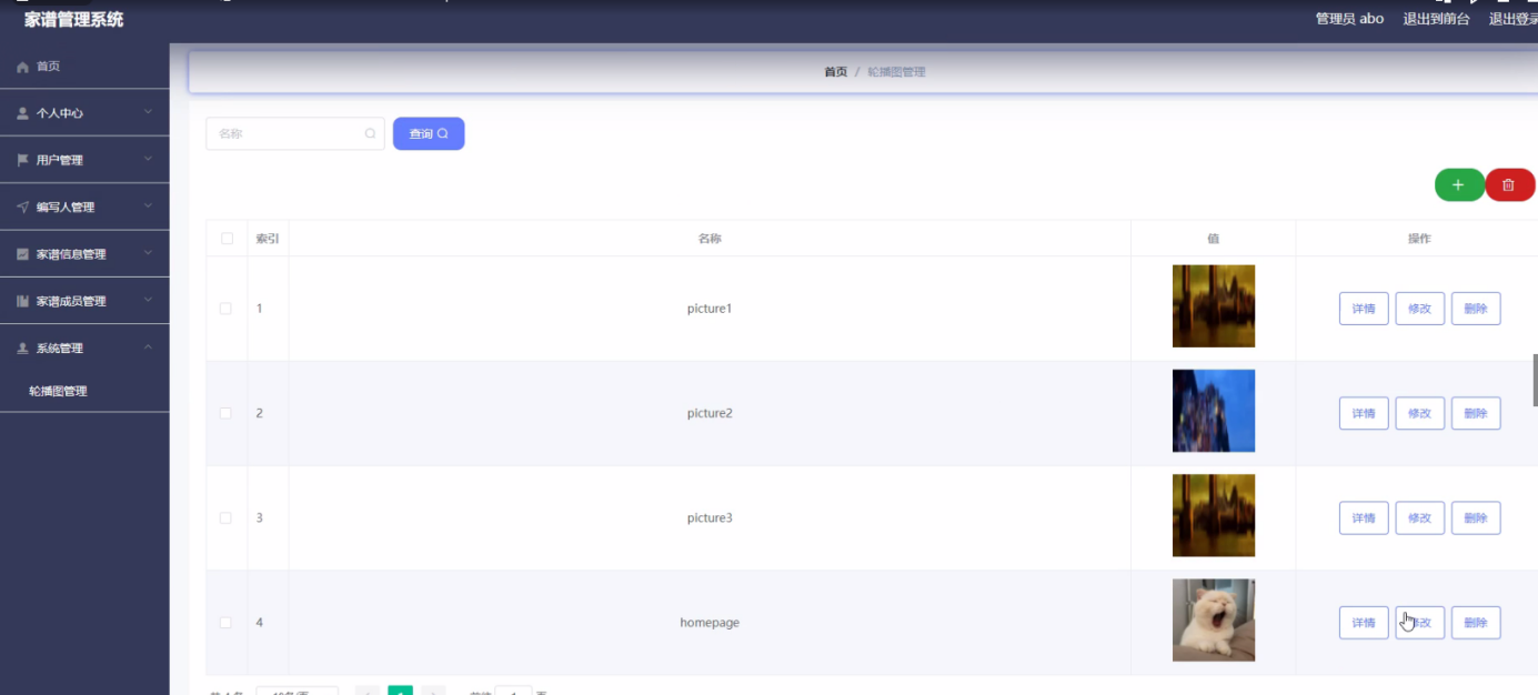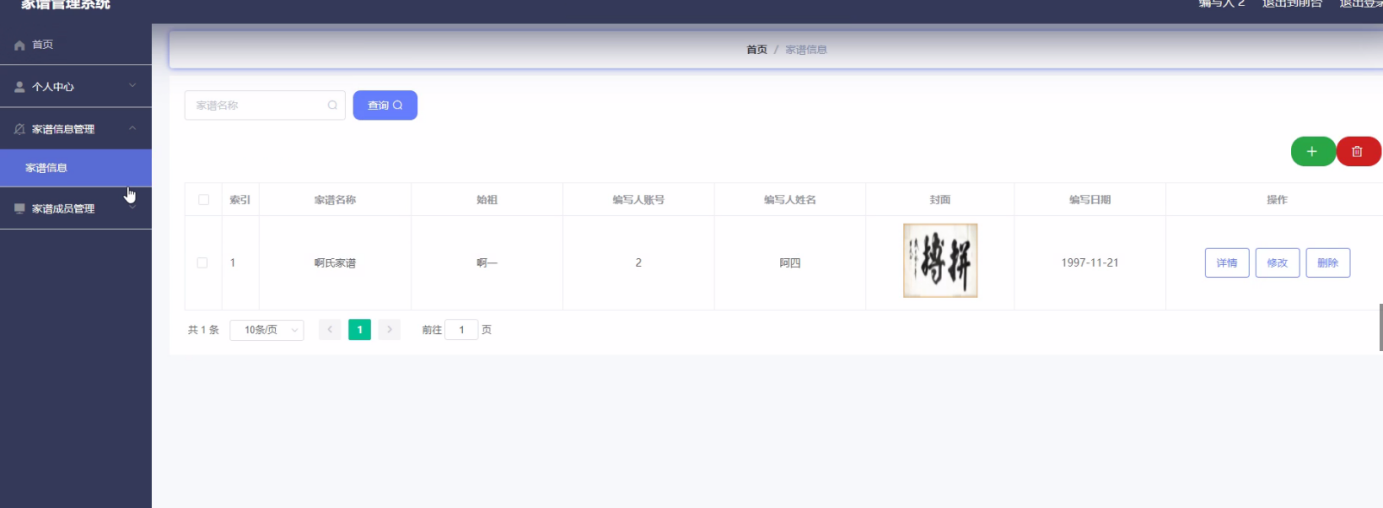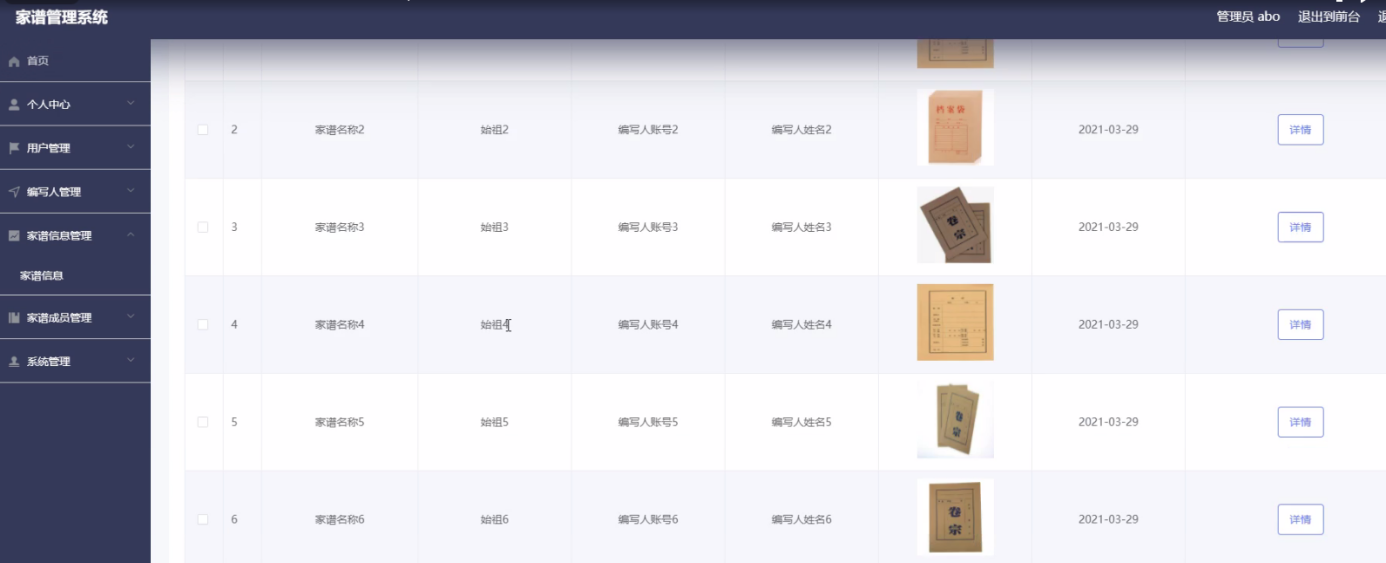 Chinese genealogy is mainly based on recorded names. Because of the complex surnames of genealogy, it is very difficult to save and query. The advantages and popularity of computer make the development of genealogy necessary. Genealogy management system is mainly with the help of computer, through the management of information. Reduce the administrator's work, but also convenient for the majority of users to query and manage personal information in time, followed by the management of a large amount of information, and finally a high degree of security, and easy to use, which makes the management and operation of genealogy management system very convenient.