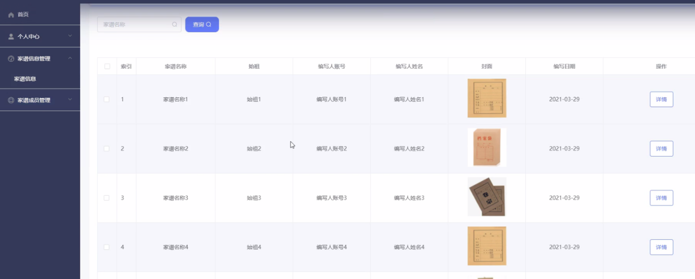 本论文对家谱管理系统的发展背景进行详细的介绍,并且对系统开发技术进行介绍,然后对系统进行需求分析,对家谱管理系统业务流程、系统结构以及数据都进行详细说明。用户可根据关键字进行信息的查找自己想要的家谱信息、家谱成员等。