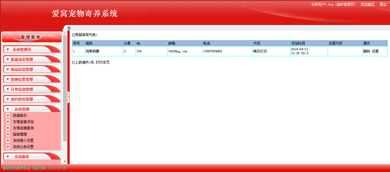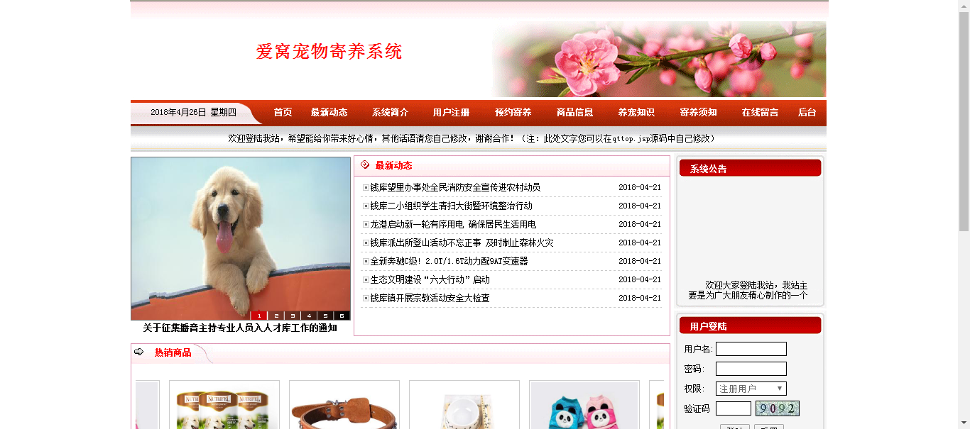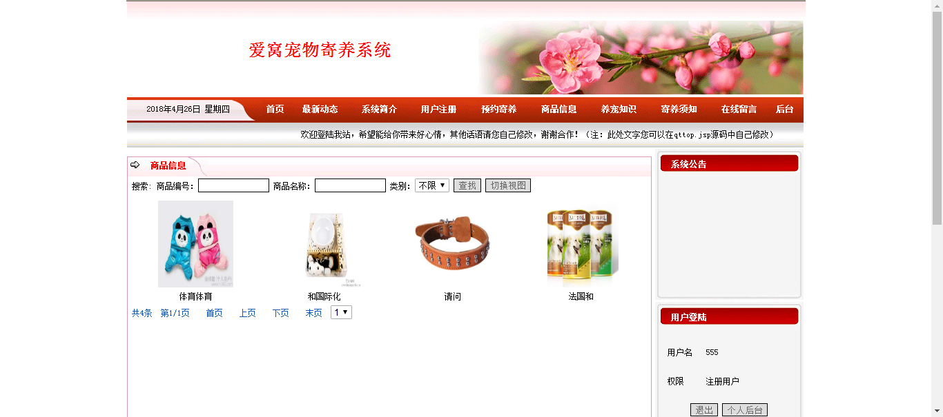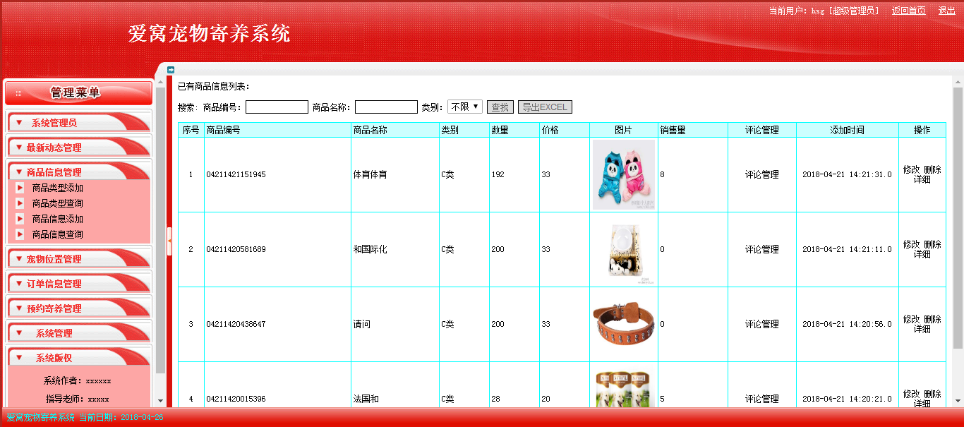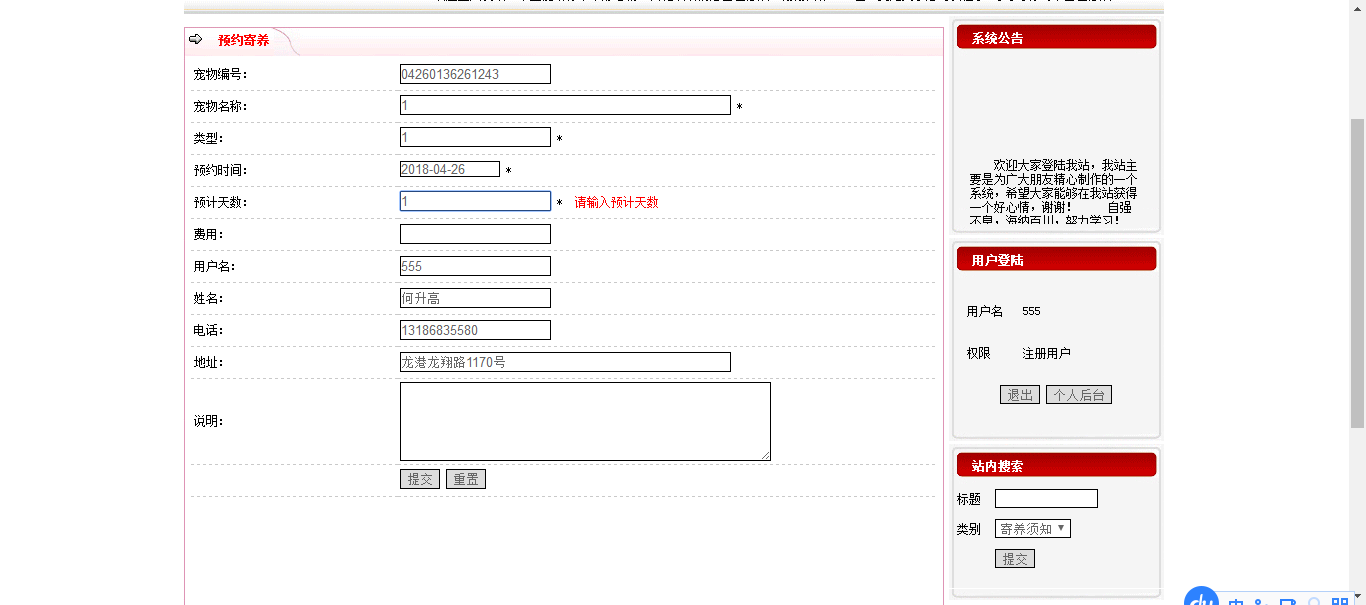 Nowadays, pet foster care system is a very important way in business trade, can put the liberation from the traditional entity model, online foster pets can provide great convenience for consumers. Using this system, users can choose their favorite products, place orders online, and get the final product. The main function of the system implementation are: user login and logout, the foreground of commodities to browse, search, purchase, pet foster care and the background of commodity category management, commodity information management, foster care management, order management, user management, etc. The system is divided into two kinds of user platforms: administrators and ordinary users. The pet foster system mainly USES MySQL as the database management system, and the development environment is Myeclipse, which is a B/S structure based on Web technology.