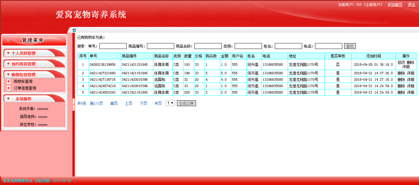 如今,宠物寄养系统是商业贸易中的一条非常重要的道路,可以把其从传统的实体模式中解放中来,网上寄养宠物可以为消费者提供巨大的便利。使用本系统,用户可以挑选自己喜欢的商品,在线下单,并得到最终的商品。本系统实现的主要功能有:用户的登录和注销,前台的商品浏览、商品搜索、商品购买、宠物寄养和后台的商品类别管理、商品信息管理、寄养管理、订单管理、用户管理等。本系统分为管理员、普通用户这二种用户平台。宠物寄养系统主要使用MySQL作为数据库管理系统,开发环境是Myeclipse,这是一个基于Web技术的B/S结构的商业系统。
