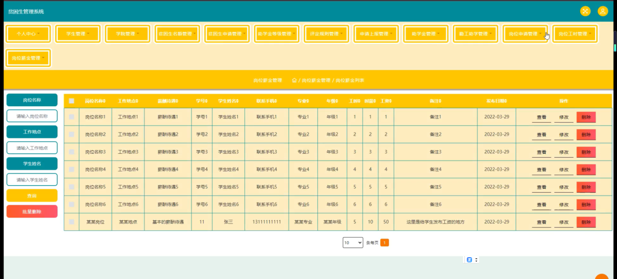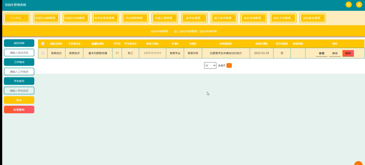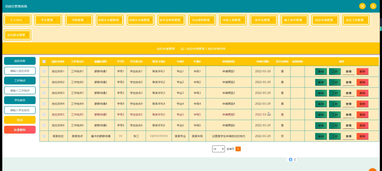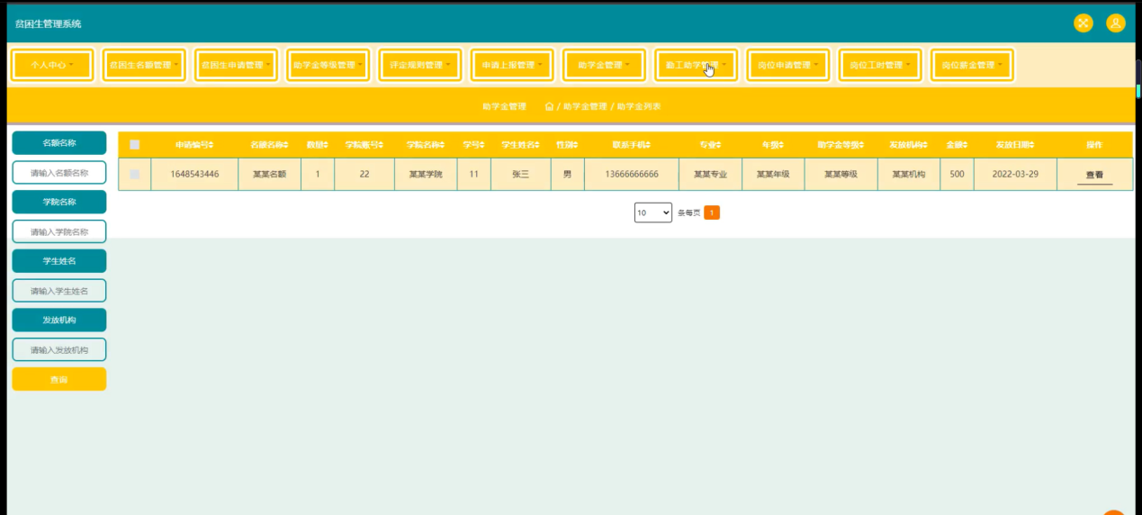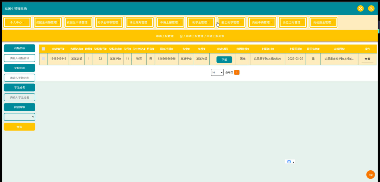 随着Internet的发展,人们的日常生活已经离不开网络。未来人们的生活与工作将变得越来越数字化,网络化和电子化。网上管理,它将是直接管理贫困生管理系统的最新形式。本论文是以构建贫困生管理系统为目标,使用 jsp技术制作,由管理员、学生和学院三大部分组成。着重论述了系统设计分析,系统主要包括主页、个人中心、学生管理、学院管理、贫困生名额管理、贫困生申请管理、助学金等级管理、评定规则管理、申请上报管理、助学金管理、勤工助学管理、岗位申请管理、岗位工时管理、岗位薪金管理等功能,以及后台数据库管理。从系统设计到详细实现都根据了系统的建设思想和mysql数据库的设计方法。