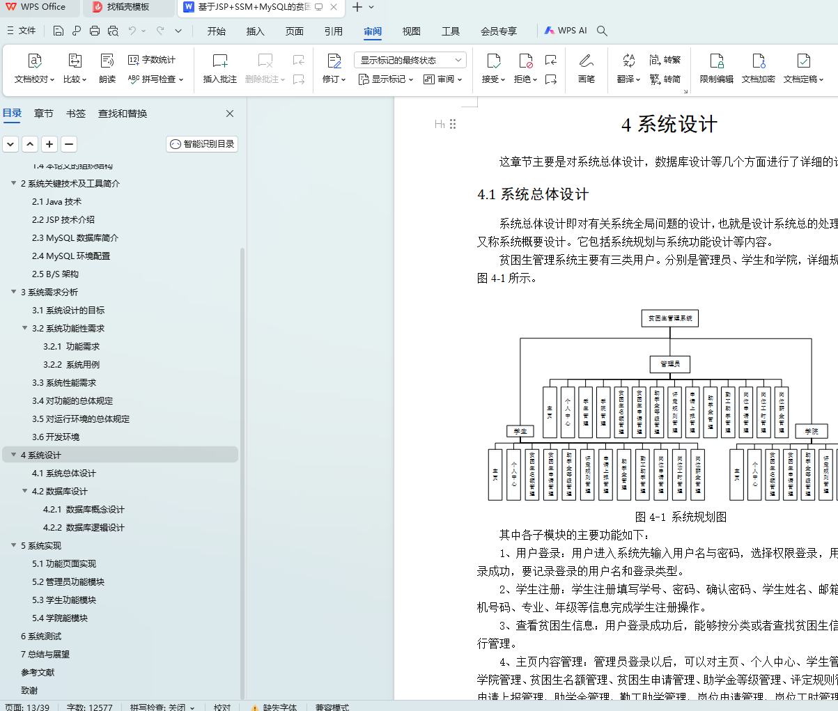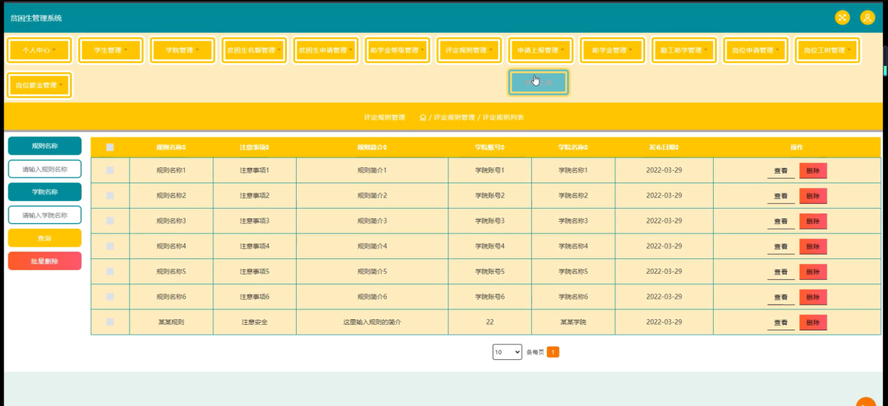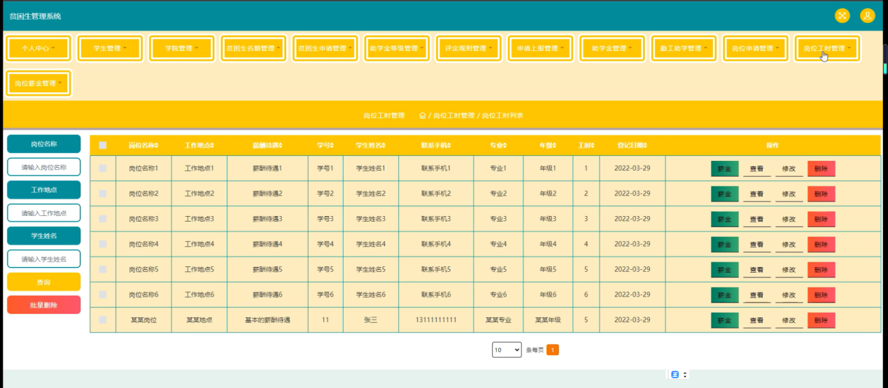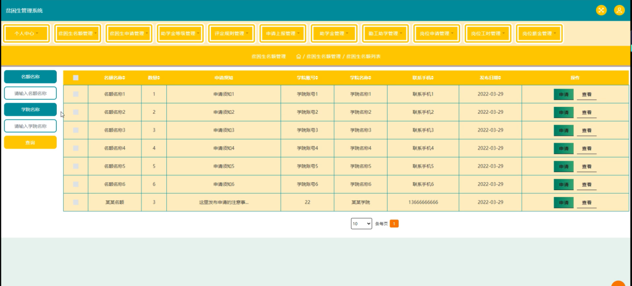 随着Internet的发展,人们的日常生活已经离不开网络。未来人们的生活与工作将变得越来越数字化,网络化和电子化。网上管理,它将是直接管理贫困生管理系统的最新形式。本论文是以构建贫困生管理系统为目标,使用 jsp技术制作,由管理员、学生和学院三大部分组成。着重论述了系统设计分析,系统主要包括主页、个人中心、学生管理、学院管理、贫困生名额管理、贫困生申请管理、助学金等级管理、评定规则管理、申请上报管理、助学金管理、勤工助学管理、岗位申请管理、岗位工时管理、岗位薪金管理等功能,以及后台数据库管理。从系统设计到详细实现都根据了系统的建设思想和mysql数据库的设计方法。