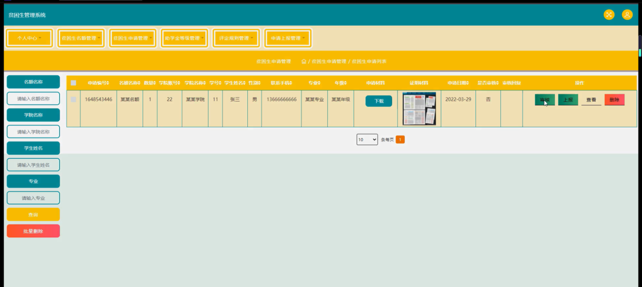 The application of this system can reduce the labor intensity of managers, improve work efficiency and management level, has great value. It can make the poor students management system simple operation, high success rate, so that the management of the online poor students management system to a higher level forward.