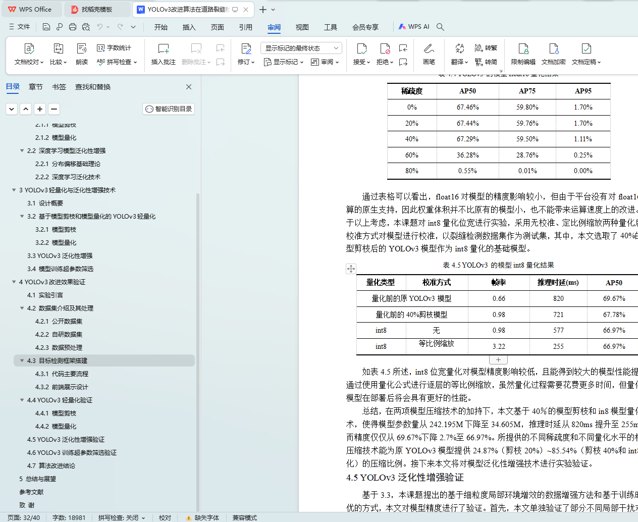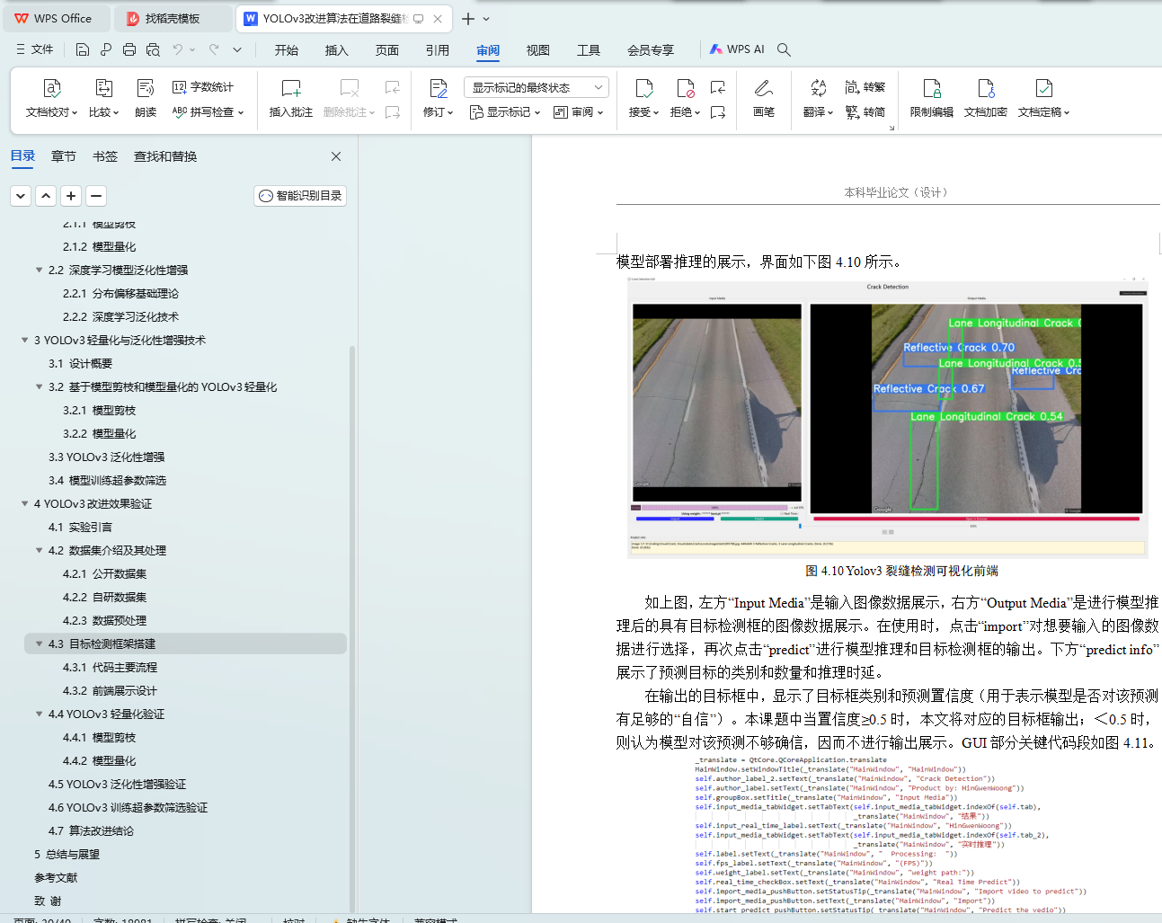 本课题利用Python编程语言和Pytorch深度学习框架,基于YOLOv3算法模型对道路裂缝检测进行检测,进行正确的识别。并从模型剪枝和模型量化以及数据增强技术,对YOLOv3模型进行改进,联合部分训练超参数配置的筛选优化,在提升模型精度的同时减少了模型参数量和计算量。最后使用Python编程语言和PyQt5库进行了简要的可视化前端搭建。
