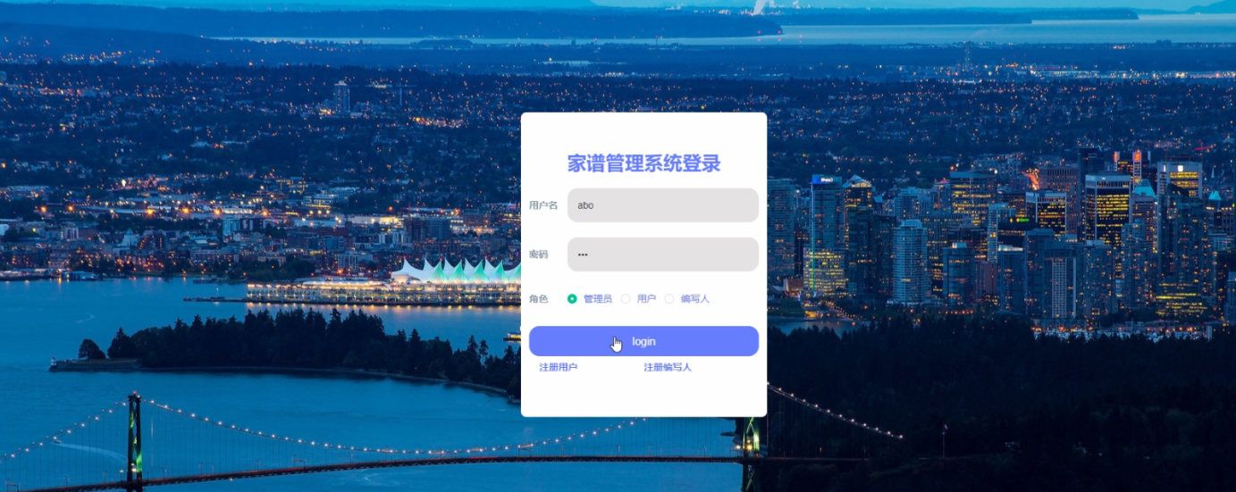 族谱管理系统的开发过程中,采用B / S架构,主要使用Java技术进行开发,中间件服务器是Tomcat服务器,使用Mysql数据库和Eclipse开发环境。该族谱管理系统包括用户、编写人和管理员。其主要功能包括管理员:首页、个人中心、用户管理、编写人管理、族谱信息管理、族谱成员管理、系统管理;编写人:首页、个人中心、族谱信息管理、族谱成员管理;用户:首页、个人中心、族谱信息管理、族谱成员管理;前台首页;首页、族谱信息、个人中心、后台管理等功能。