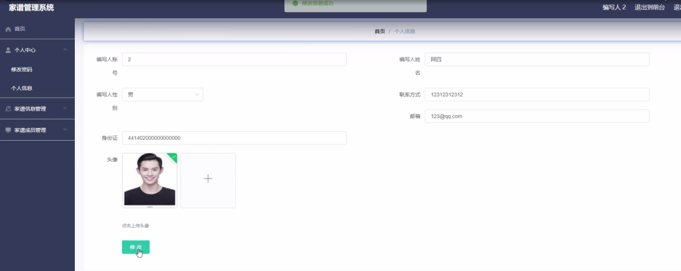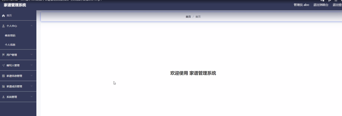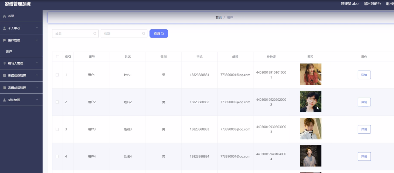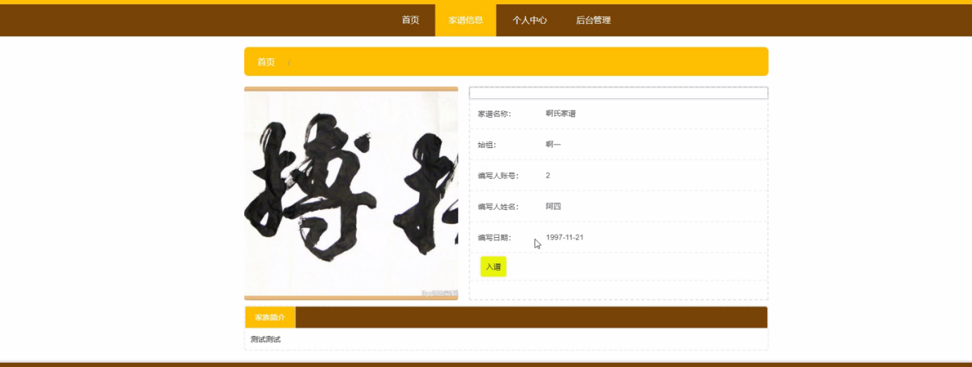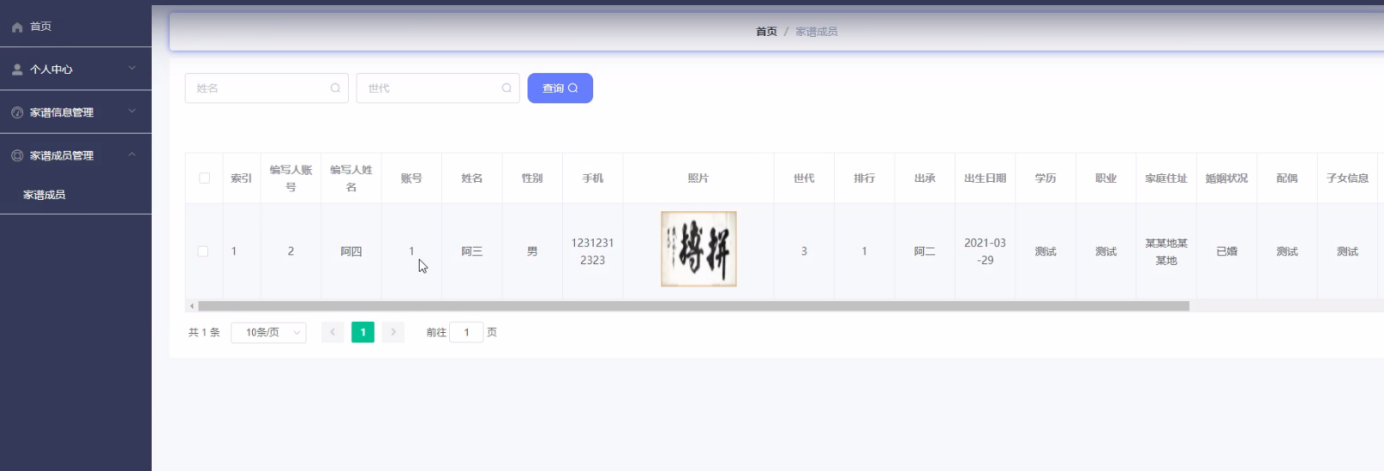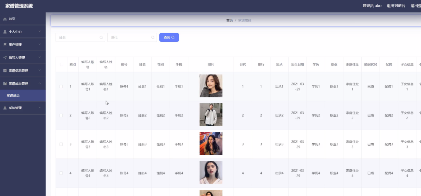 Chinese genealogy is mainly based on recorded names. Because of the complex surnames of genealogy, it is very difficult to save and query. The advantages and popularity of computer make the development of genealogy necessary. Genealogy management system is mainly with the help of computer, through the management of information. Reduce the administrator's work, but also convenient for the majority of users to query and manage personal information in time, followed by the management of a large amount of information, and finally a high degree of security, and easy to use, which makes the management and operation of genealogy management system very convenient.