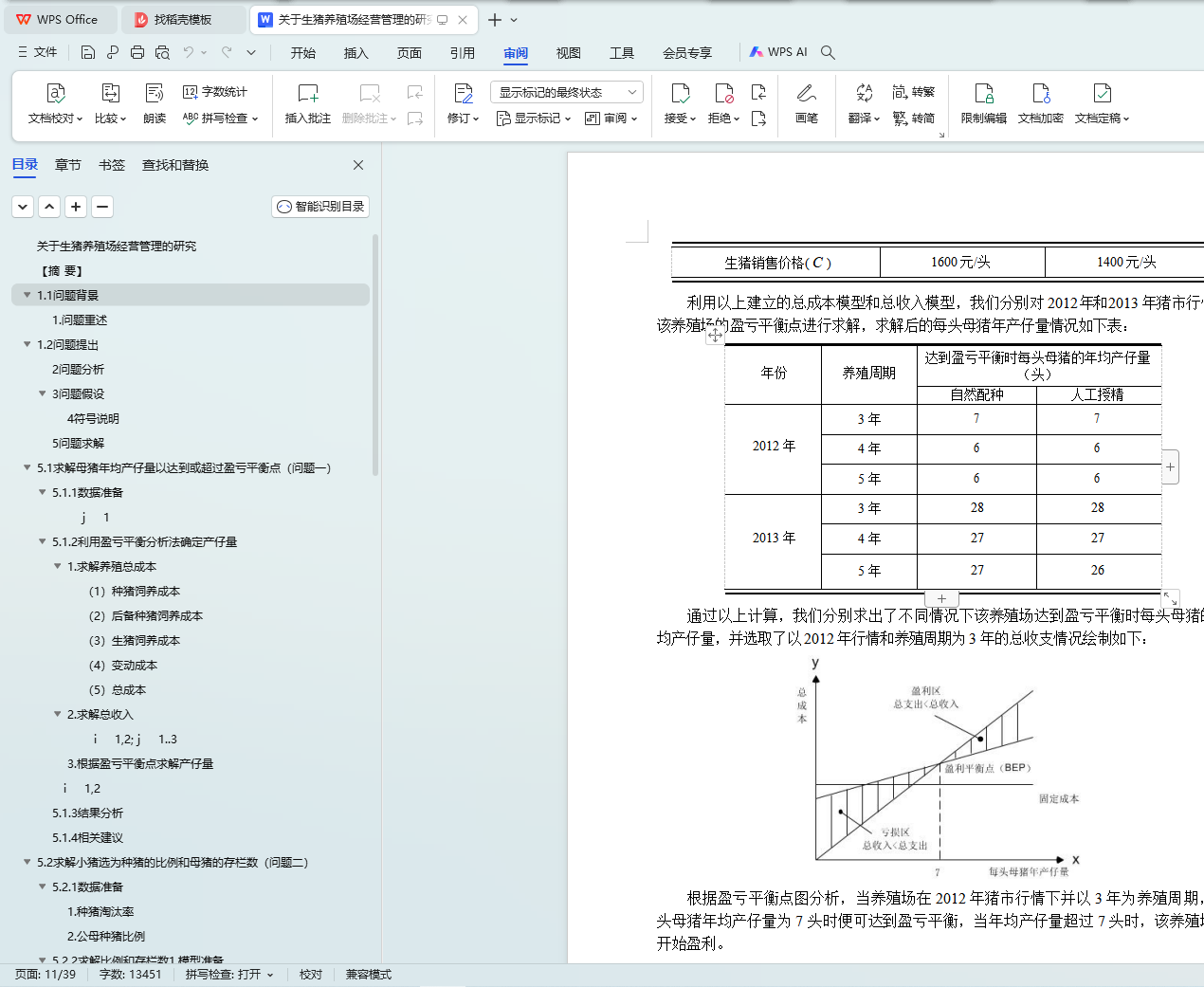 在问题一中,以达到或超过盈亏平衡点为条件,研究每头母猪的平均年产仔量。结合盈亏平衡方程,以种猪养殖成本、肉猪养殖成本及变动成本的总和与所卖肉猪的总收入相等为目标,运用多元函数建立计算模型,求解得到在 2014 年市场价格的情况下不存在盈亏平衡,而在 2012、2013 年要达到盈亏平衡,养殖周期为三年的母猪在人工授精条件下平均年产仔量为 7 头(其他数据见正文)。