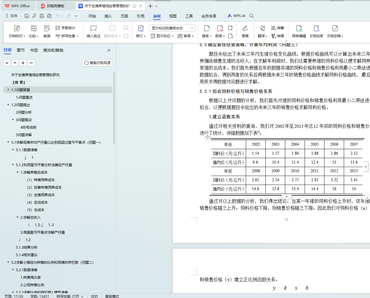 在问题三中,通过调查,运用最小二乘法对猪肉价格与粮食价格的关系进行拟合, 得到两者间的函数关系。结合问题二中的数据,以总盈利最大为目标,以两次生产间隔不少于 180 天,两次肉猪出栏的间隔不少于 150 天,同一批肉猪生产与出栏的时间间隔不少于 150 天为约束条件,建立优化模型,利用 lingo 软件求得在母猪数量不发生变化情况下的生产时间和出栏时间(见正文)。