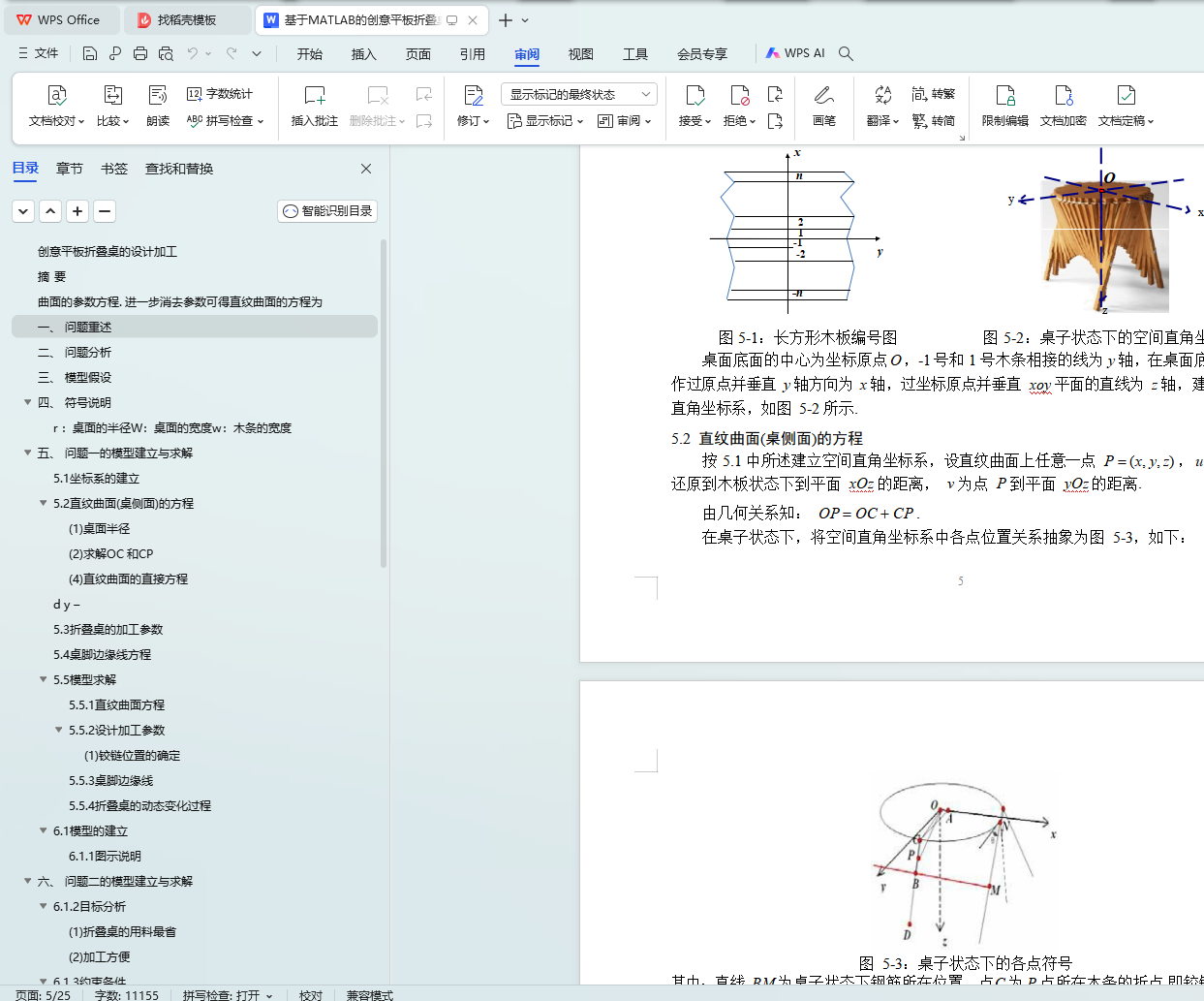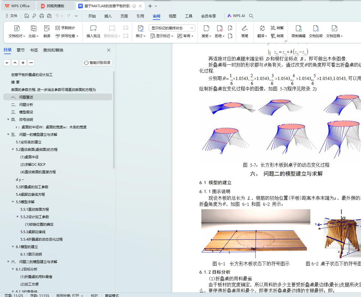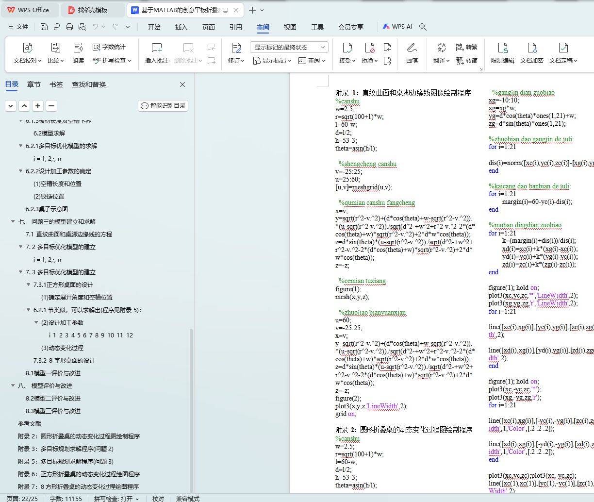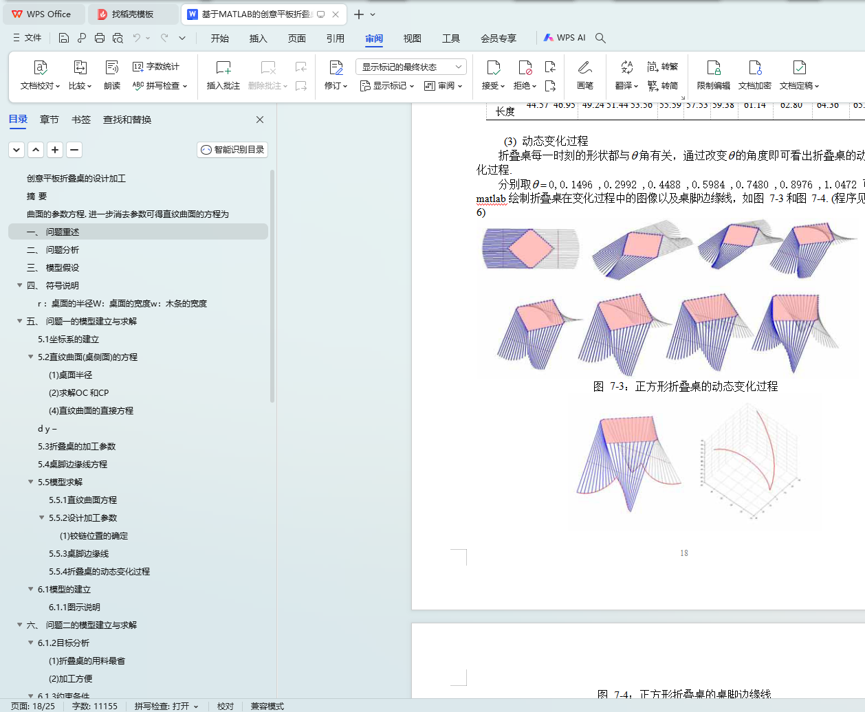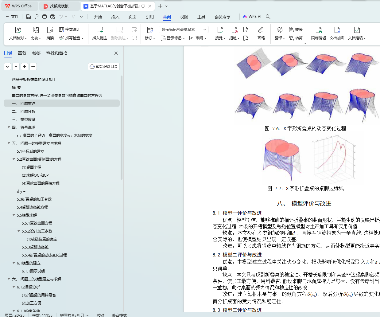 针对问题三,先将圆形折叠桌的侧面直纹曲面和桌脚边缘线的方程推广到一般形状桌面和一般形状板材,然后利用多目标优化模型设计了两种特殊形状的折叠桌:非长方形板材的正方形折叠桌和 8 字形折叠桌. 通过改变木条的旋转角度分别画出了这两种形状折叠桌的动态变化示意图,并给出了具体的设计加工参数.