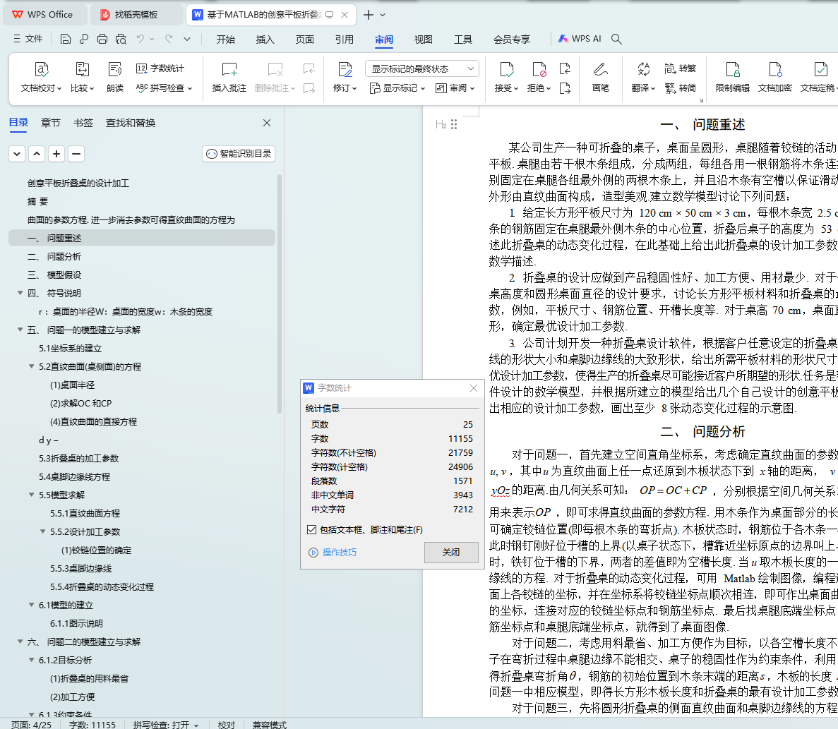 针对问题二,以用料最省(板材最短)、加工方便(总开槽长度最短)为目标,各木条开槽下界不能超出木条、桌子状态下桌腿边缘不能相交、中间所有木条的桌腿不能沾地, 以及桌子的稳固性作为约束条件,建立多目标优化模型. 利用 Matlab 编程,求得最优结果为:折叠桌弯折角q 为 1.0605(弧度),钢筋的初始位置到桌腿底端的距离s 为 43.80cm, 木板的长度 L 为 158.56cm.