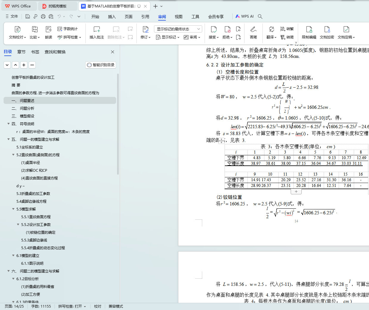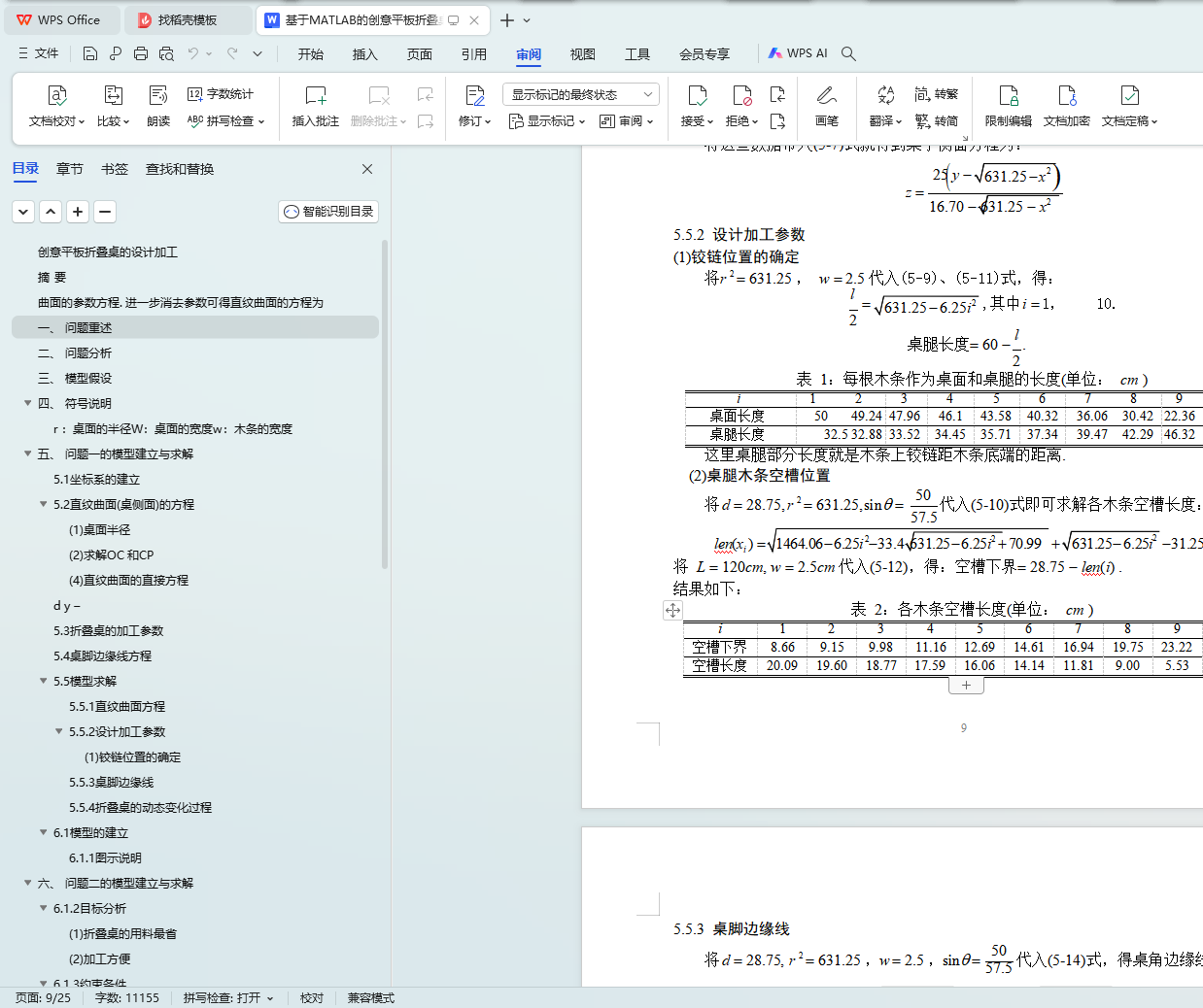 令u = L /2 ,就可得到桌脚边缘线的方程(5-12)或(5-13). 进一步可以确定设计加工参数, 如从中间到两边的木条空槽长度分别为 20.09,19.60,18.77,17.59,16.06,14.14,11.81,9.00, 5.53(cm).