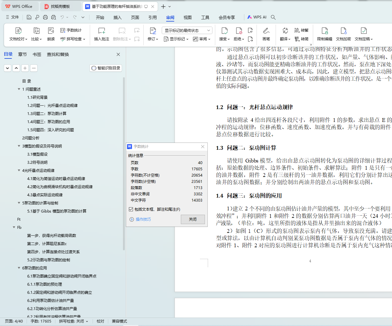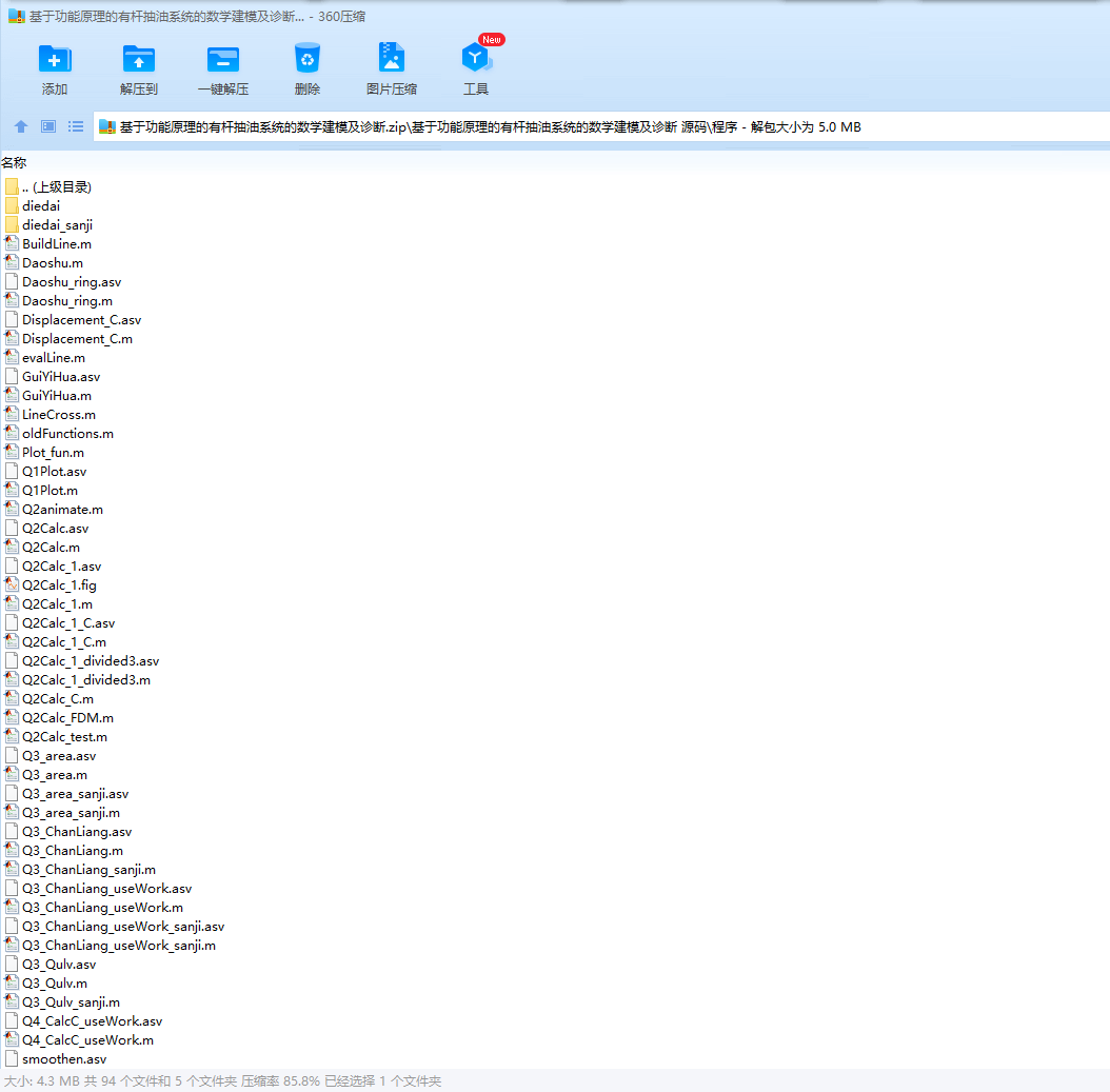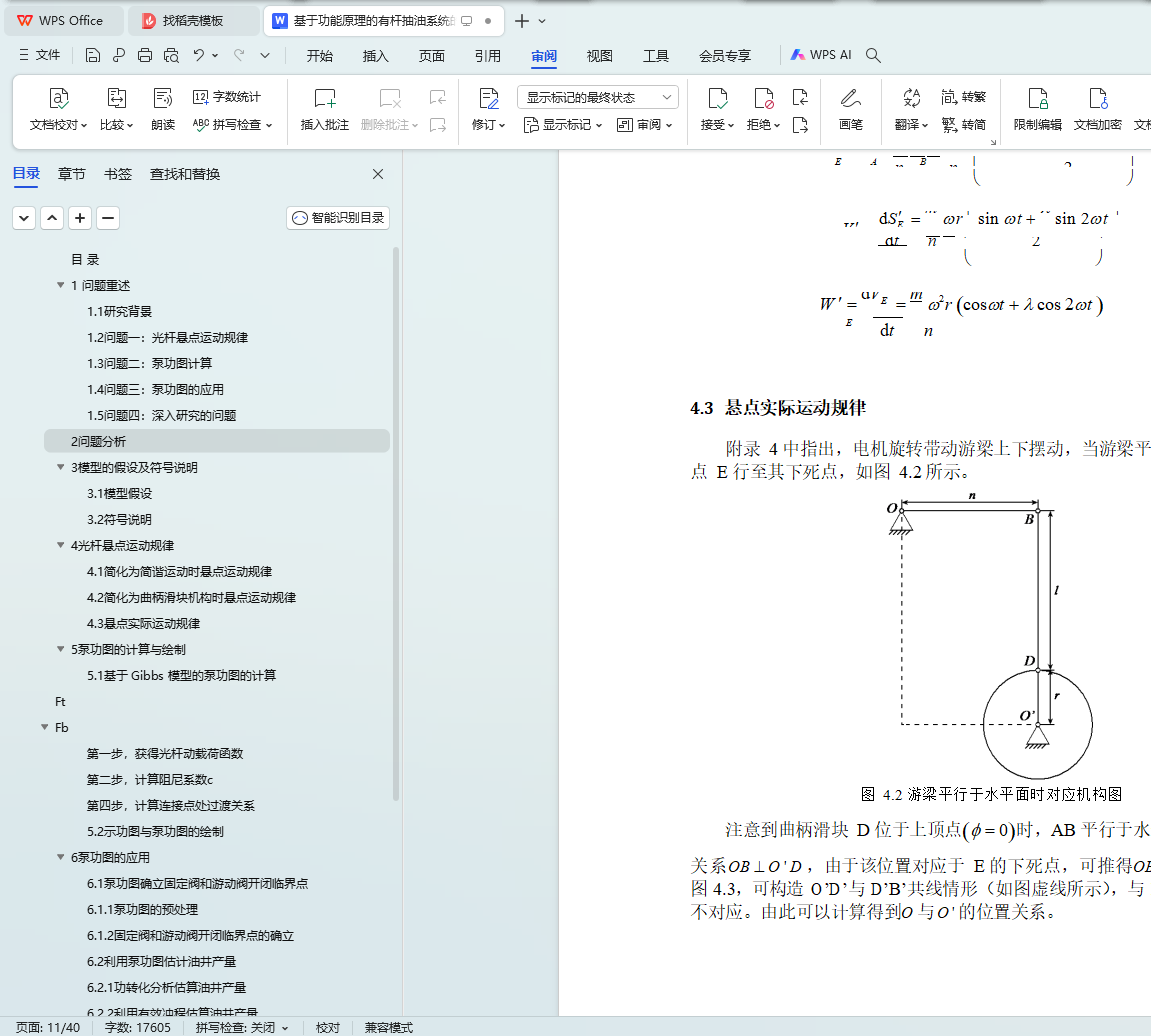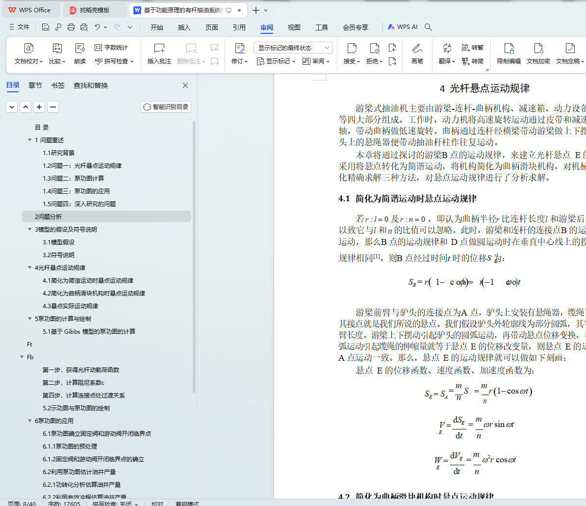 针对问题一,本文基于驴头圆周运动弧长与悬点上下运动位移的等量关系, 得到了悬点位移与游梁旋转角度之间的函数关系,确立了悬点运动的精确规律, 进而得到了悬点运动的速度和加速度函数。