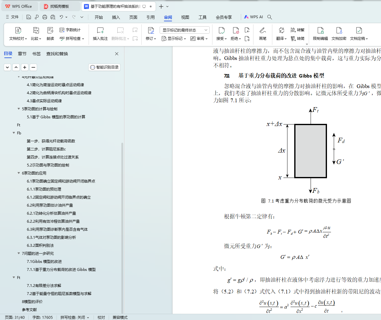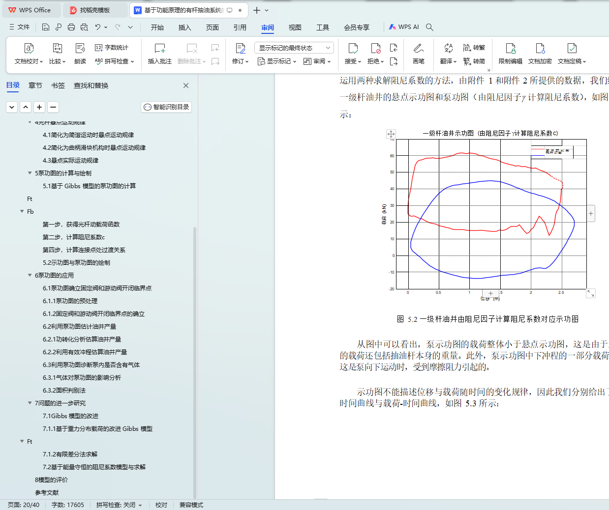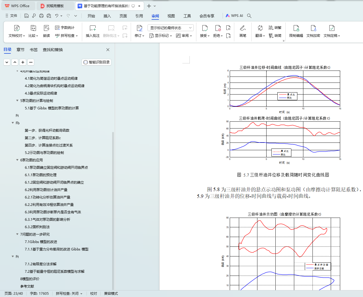 针对问题二,基于微元体受力分析推导了 Gibbs 波动方程模型,并应用文献[3]中原始数据、边界条件、初始条件的处理方法,采用傅里叶级数展开与分离变量法进行 Gibbs 波动方程的求解,实现了由悬点示功图计算一级杆和三级杆的泵功图,并分析了级数项数的高频滤波的物理意义。其中阻尼系数的计算, 本文采用了直接读取阻尼因子[3]和利用摩擦功[5]两种方法,并针对两种方法计算得到的泵功图进行了对比(图 5.2-5.9)。