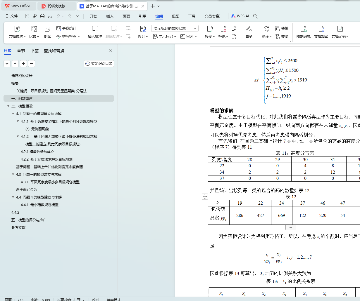 针对问题三,我们将平面总冗余度,与行间距类型最小作为目标,在以药柜给定规格为约束条件下,建立双目标规划模型。在问题二的基础上,我们通过对分布分析法,先按照比列均衡的思想确定药柜一行放置76个药槽,在此基础上为了尽量减少平面冗余,我们按照高相近归类方法,得到药柜至少需要26行,并且计算出高大致需要以下9类。