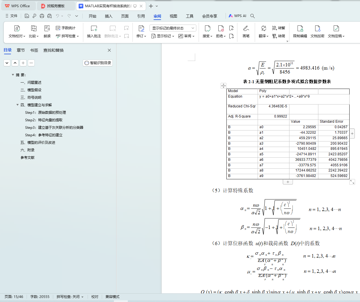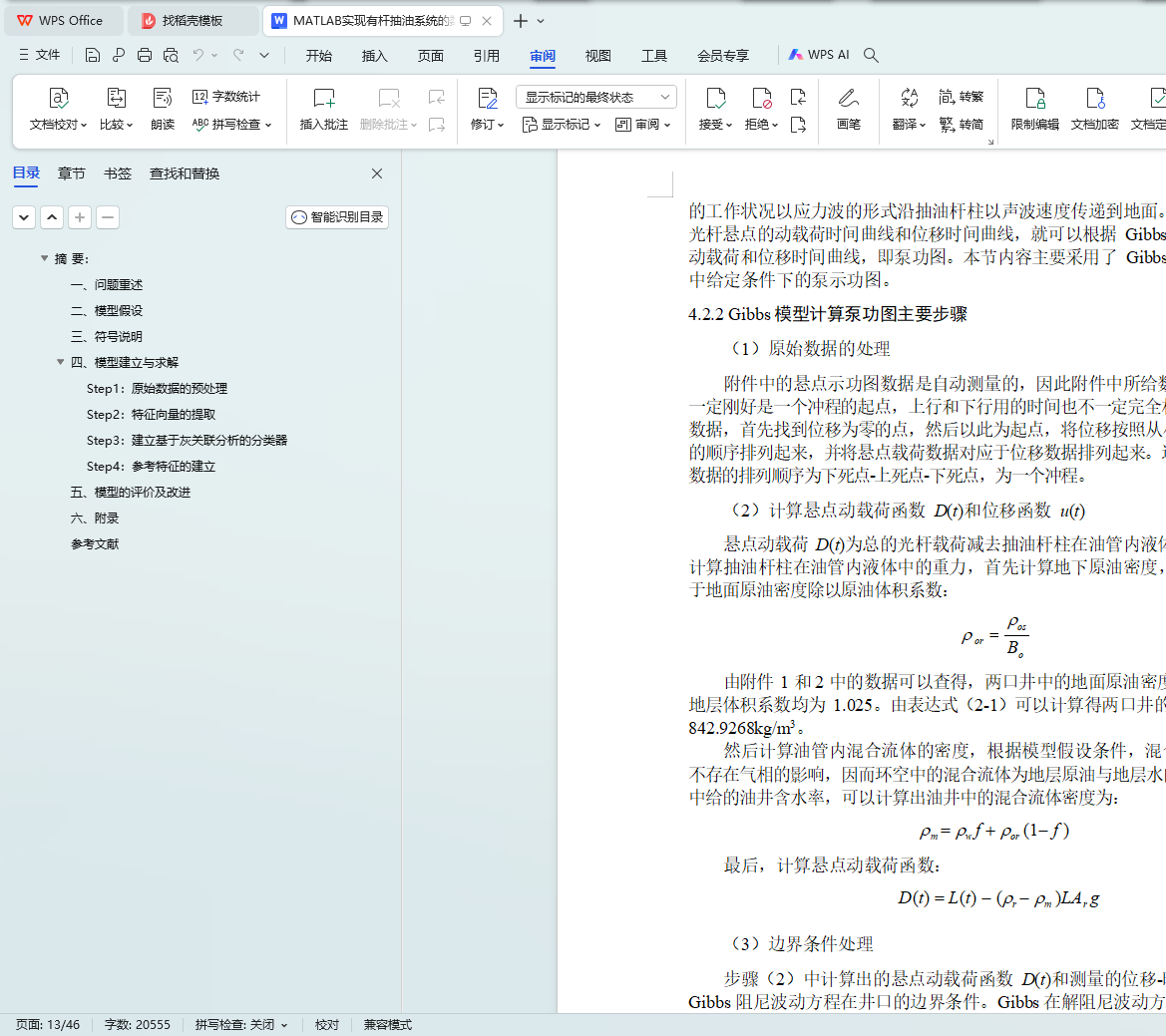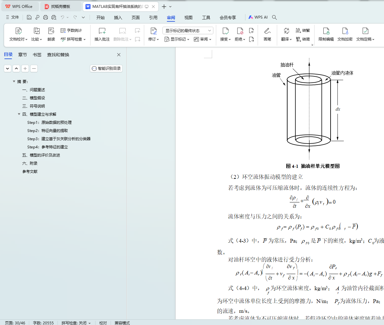 问题四,本文通过研究发现 Gibbs 模型的不足:Gibbs 一维模型只研究了抽油杆柱的纵向振动问题,忽略了油管柱和油管内液柱的振动,液柱的影响且仅限于粘滞阻力。针对于 Gibbs 模型的不足,本文建立了同时考虑抽油杆振动和油管内液柱振动的二维振动模型,分析了抽油杆柱的阻尼影响因素,给出了考虑接箍粘滞阻力的阻尼系数计算方法。