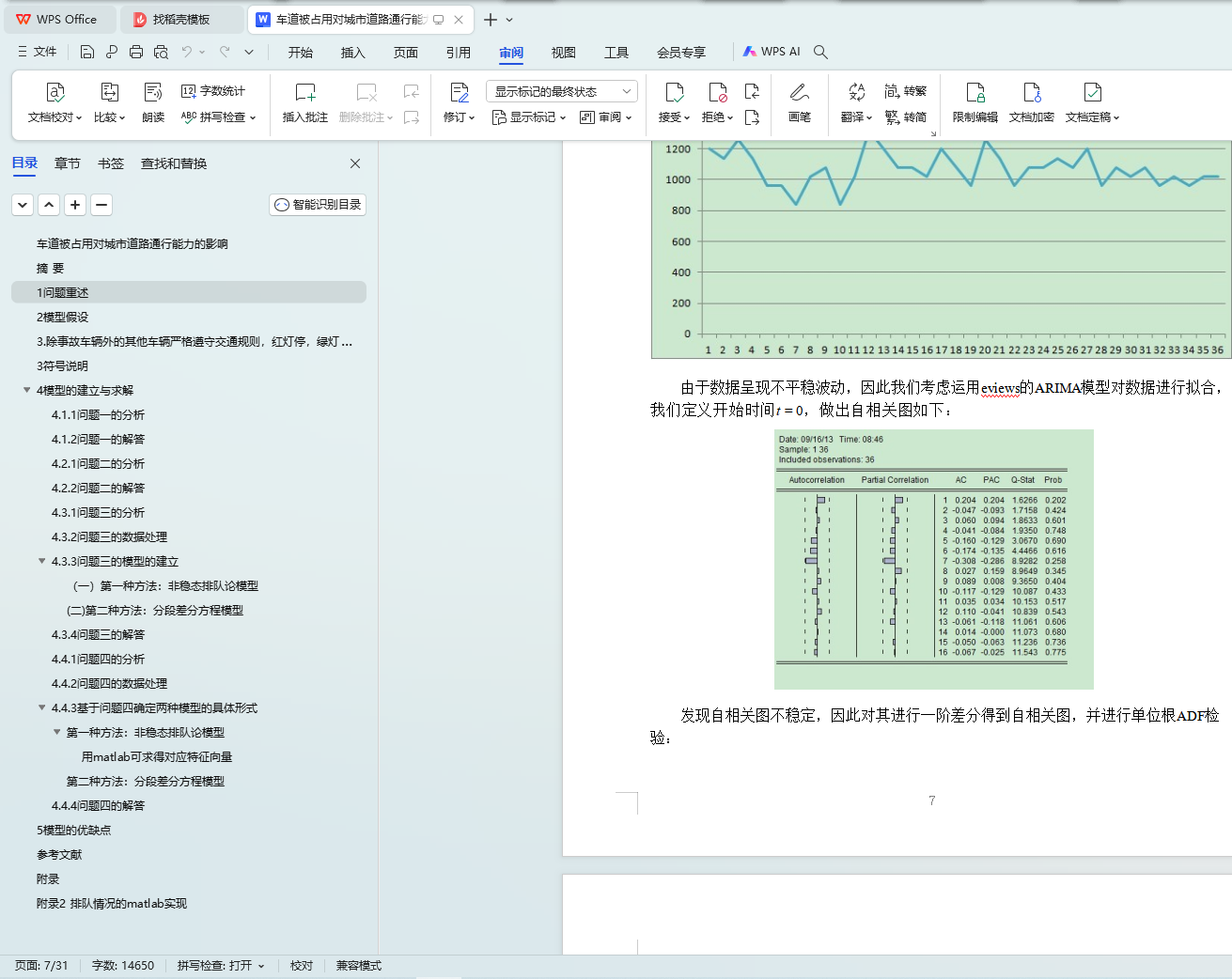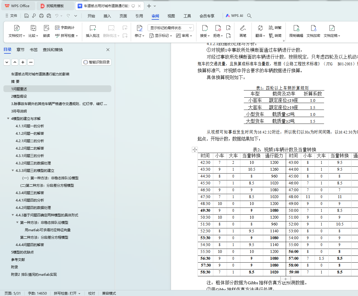 针对问题一,通过对视频1中交通事故发生至撤离期间,各种数据的采集,确定了事故横断面实际通行能力,运用Gibbs 抽样仿真方法,通过excel软件解决数据缺失问题,并用eviews进行ARMA模型拟合,发现实际通行能力的变化过程为yt = −2.0232+ϵt−0.7243ϵt−1−