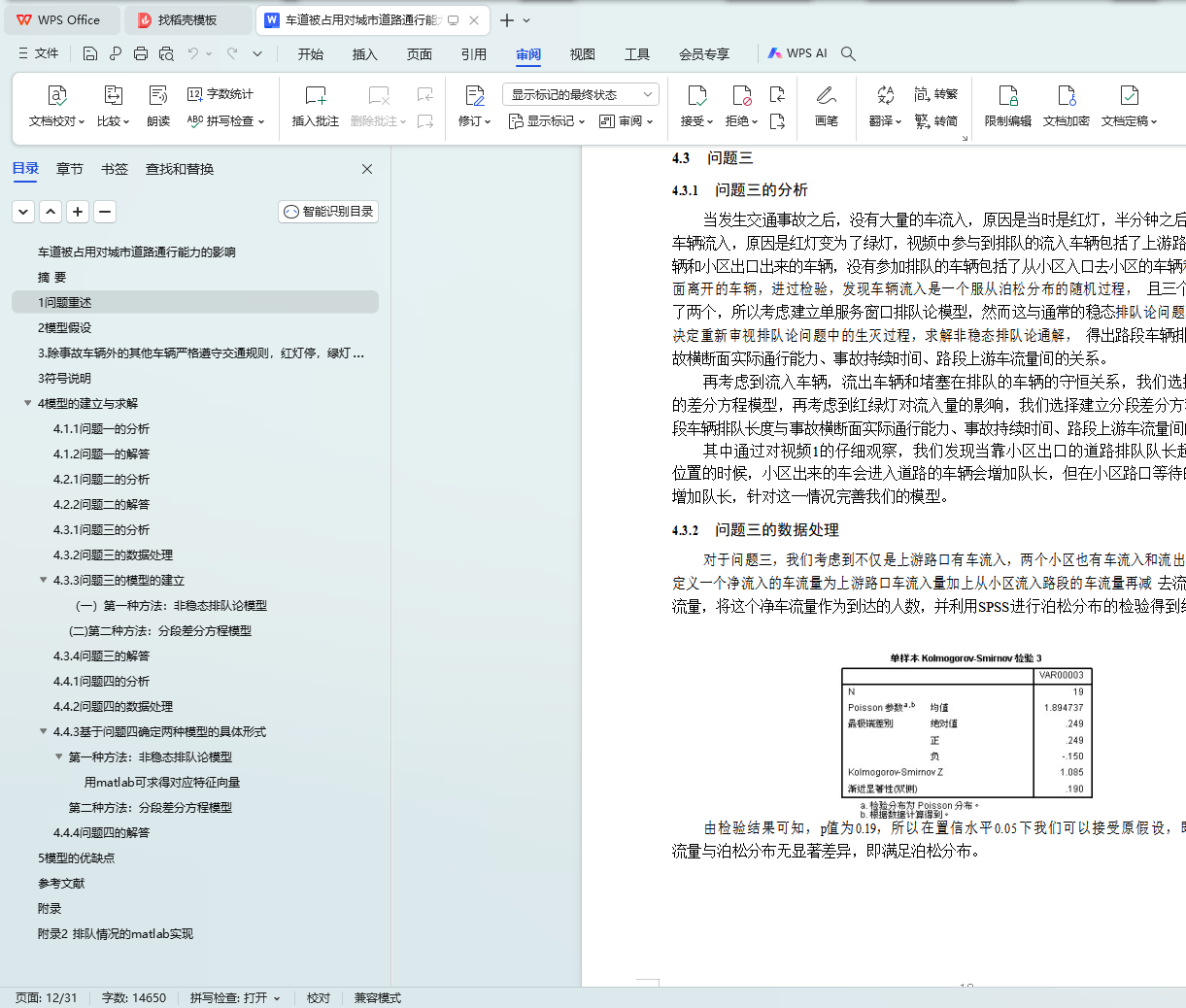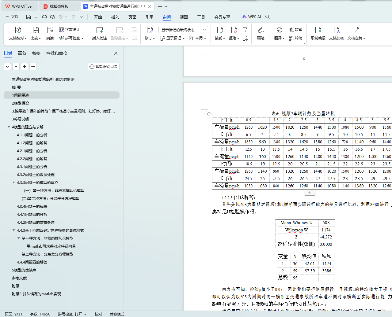 针对问题二,我们结合视频1,采用与问题一同样的方法对视频2进行数据采集和分析,得到了横断面的实际通行能力,并将视频1和视频2仔细对比,通过视频1和视频2中对 交通事故发生至撤离期间,事故所处横断面实际通行能力,运用SPSS软件进行两独立样本 的曼―惠特尼U检验,再根据路段附近交通设置,车辆流向比例,司机心理,周围地形等 因素,分析出产生差异的原因是主要是在不同车道车辆流量的比例。