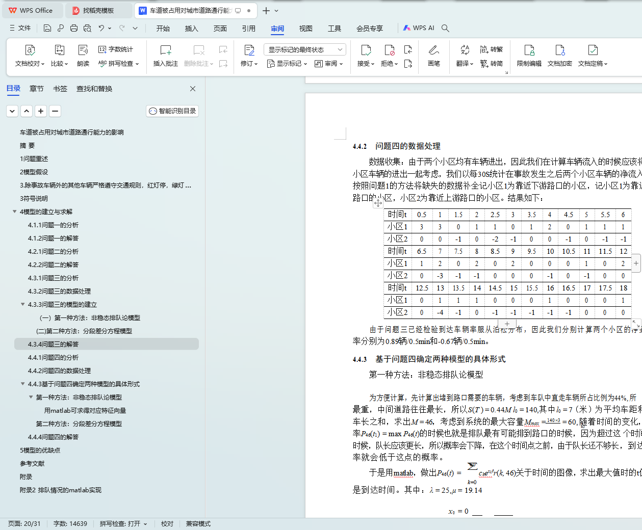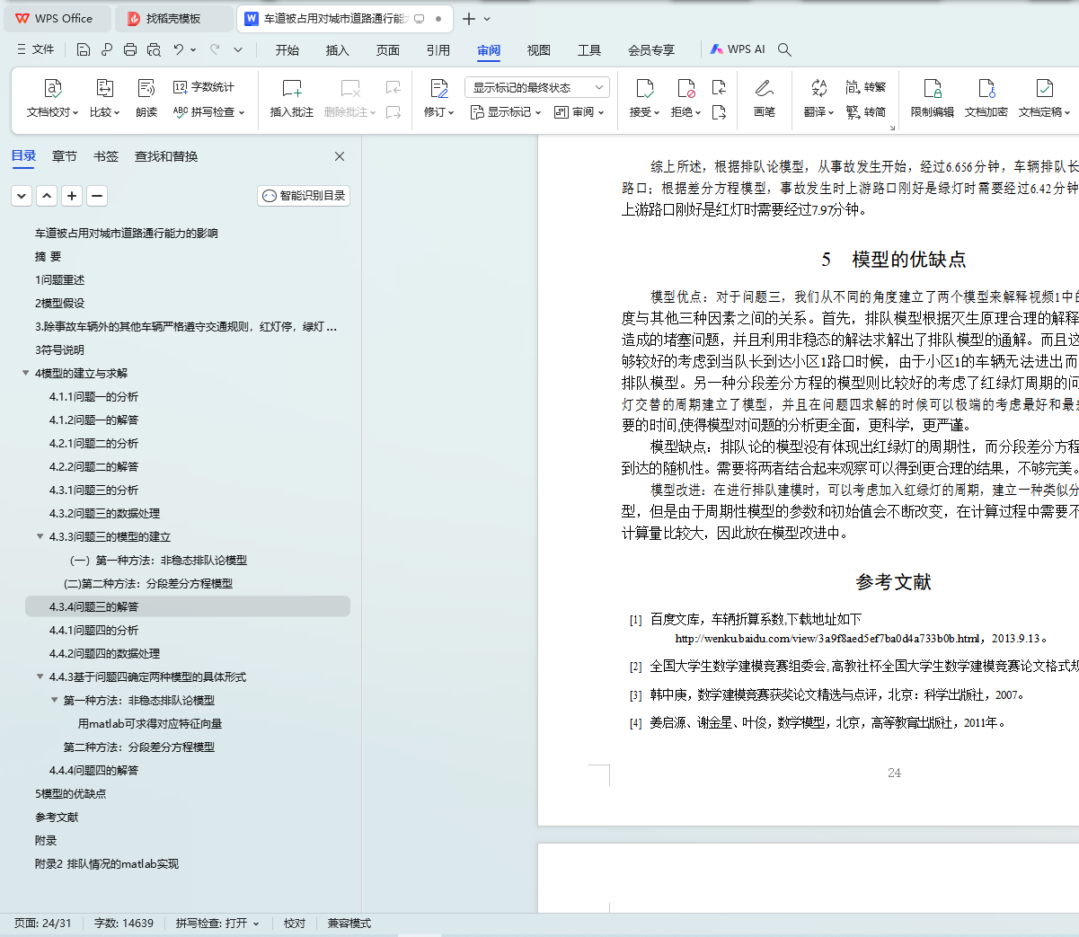 针对问题四,利用问题三所建立的模型和题目所给数据,如果采用非稳态排队论模型,运用matlab软件求解,得出从事故发生开始,经过6.656分钟,车辆排队长度将到达上游路口;如果通过分段差分方程模型,事故发生时上游路口刚好是绿灯时需要经过6.42分钟,事故发生时上游路口刚好是红灯时需要经过7.97分钟,与上一模型所得结果相吻合。说明两模型有很高的合理性和实用性。