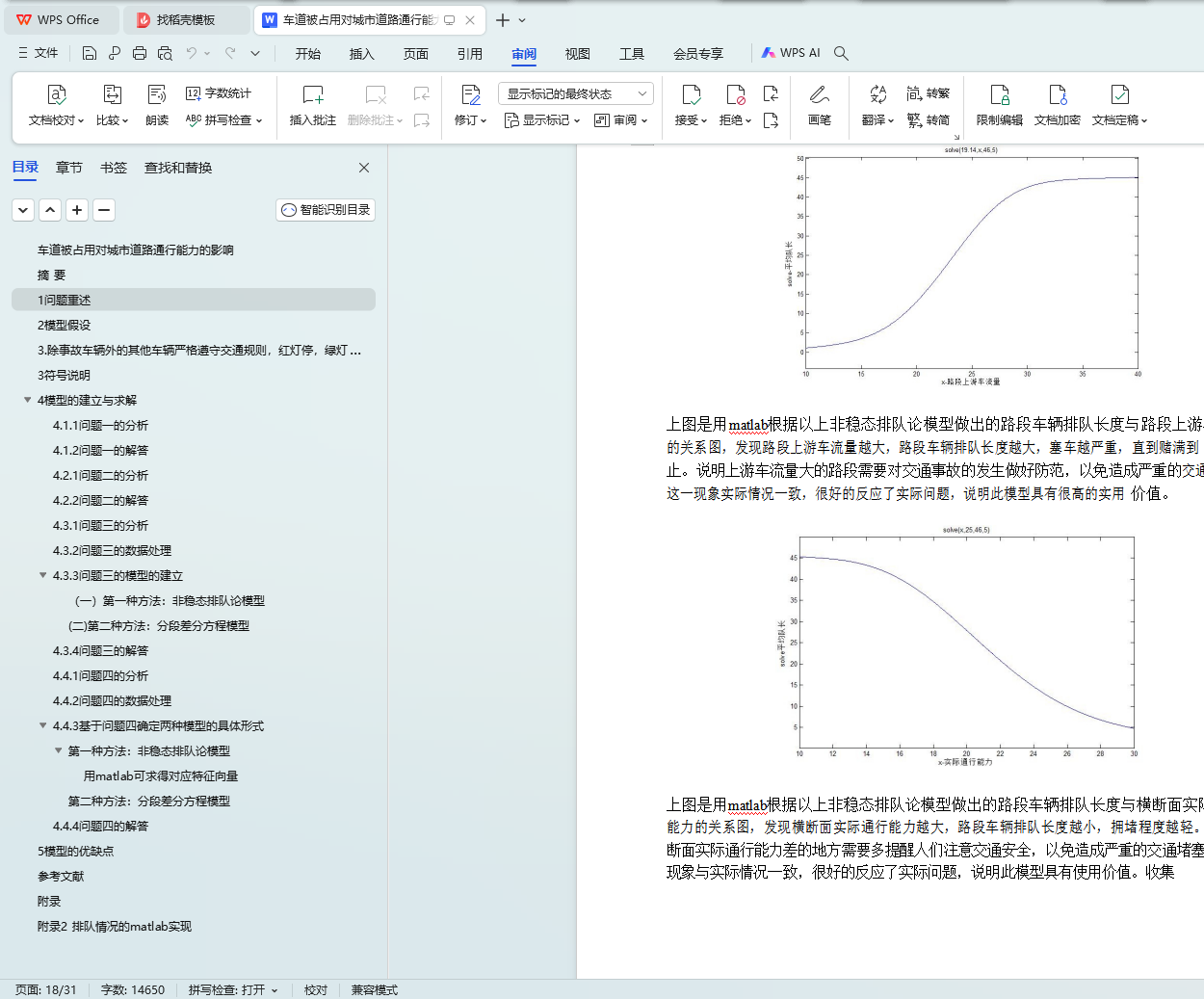 针对问题三,通过分析视频1塞车情况,分别建立非稳态排队论模型和分段差分方程 模型,并运用matlab软件编程绘制图像,解释出视频1中路段车辆排队长度与事故横断面实际通行能力、事故持续时间、路段上游车流量间的关系为:实际通行能力越大交通事故 所影响的路段车辆排队长度越小,或者说路段车辆排队长度增长越慢;路段上游车流量越大交通事故所影响的路段车辆排队长度越大,或者说路段车辆排队长度增长越快;事故持续时间越长,交通事故所影响的路段车辆排队长度越大。