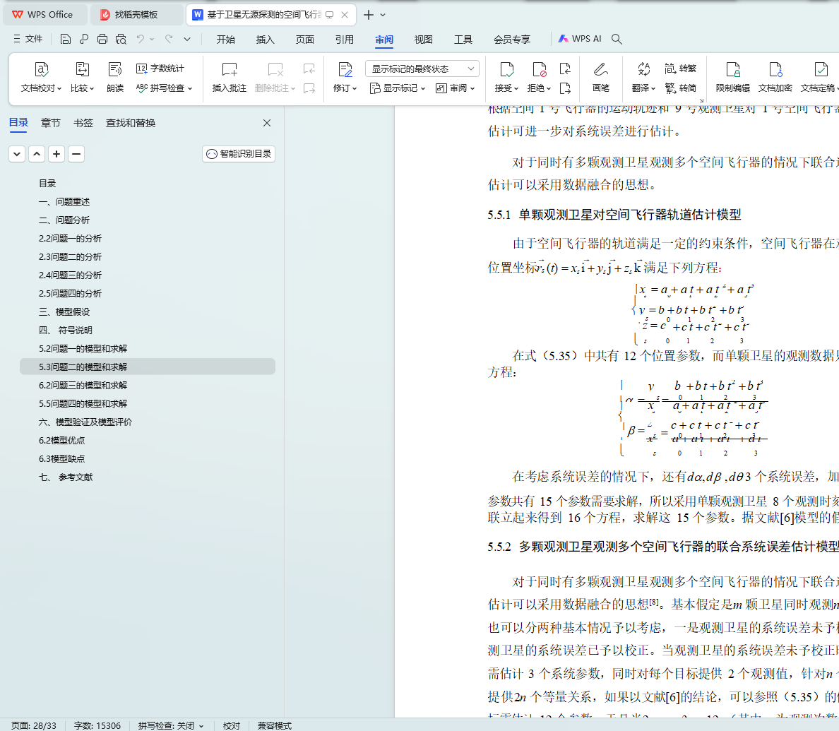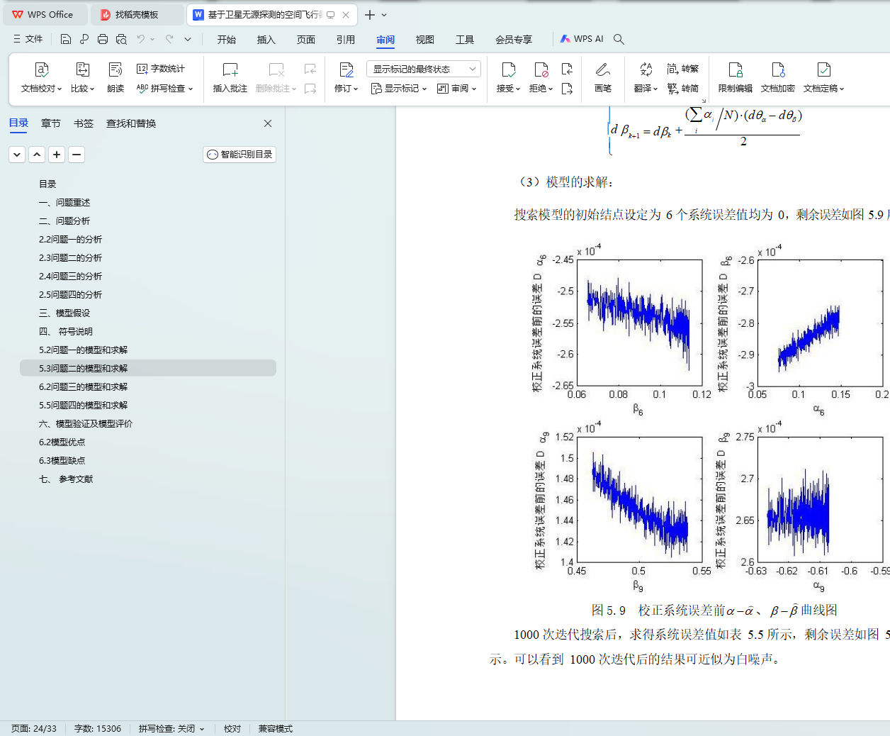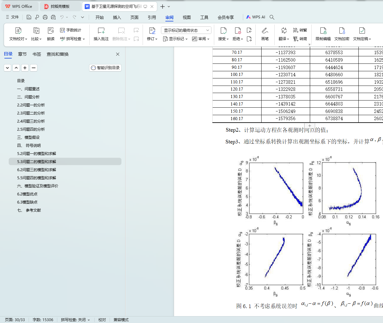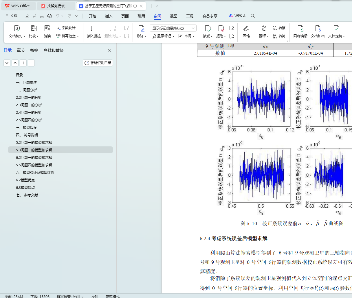 针对问题三,在考虑观测卫星的系统误差时,利用双星多点观测数据联立求解目标位置参数和系统误差参数,论文采用启发式搜索算法进行系统误差和轨道估计,分别计算出 6 号卫星的三轴指向误差为-4.845´10-4 , -7.872´10-4 ,