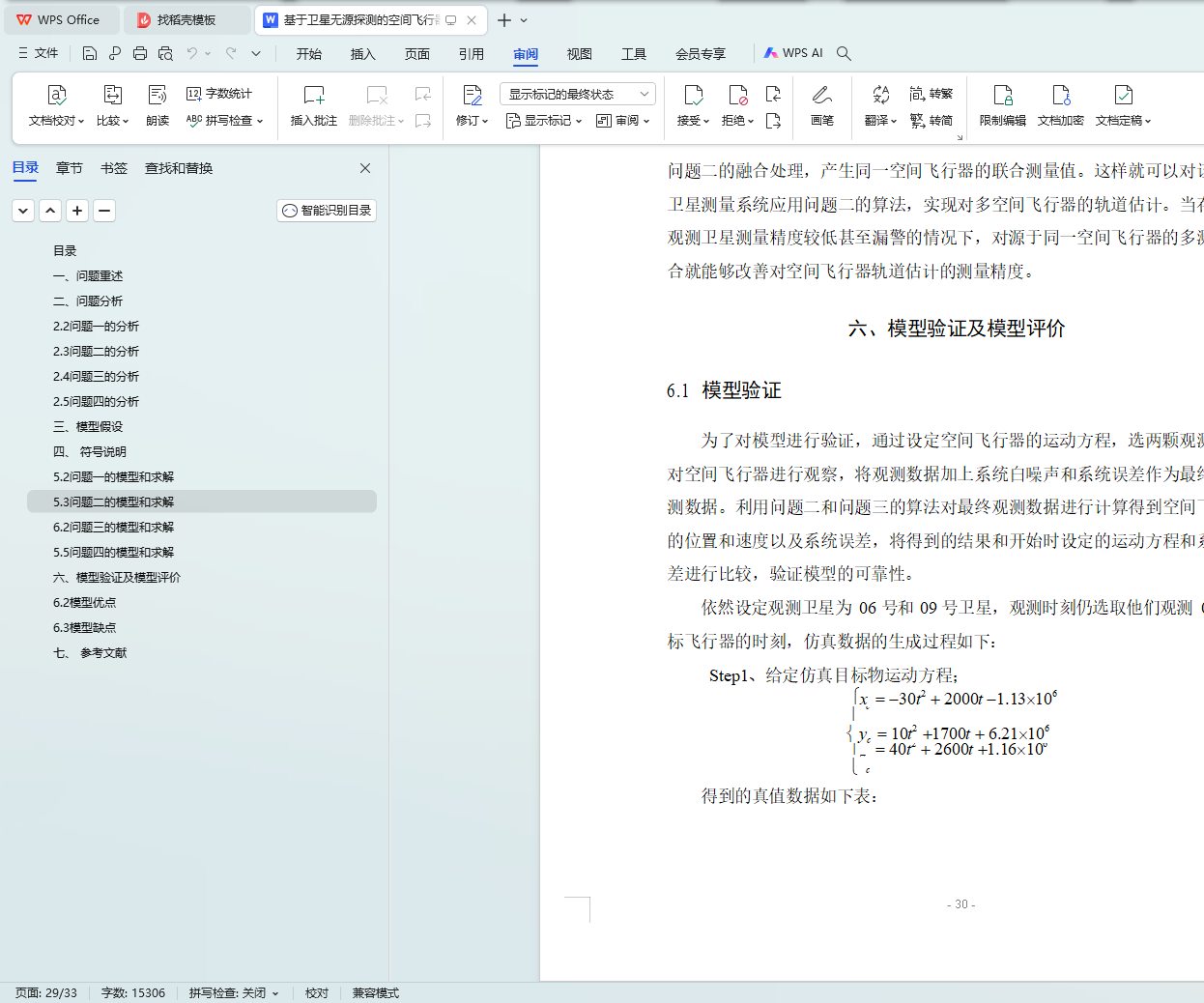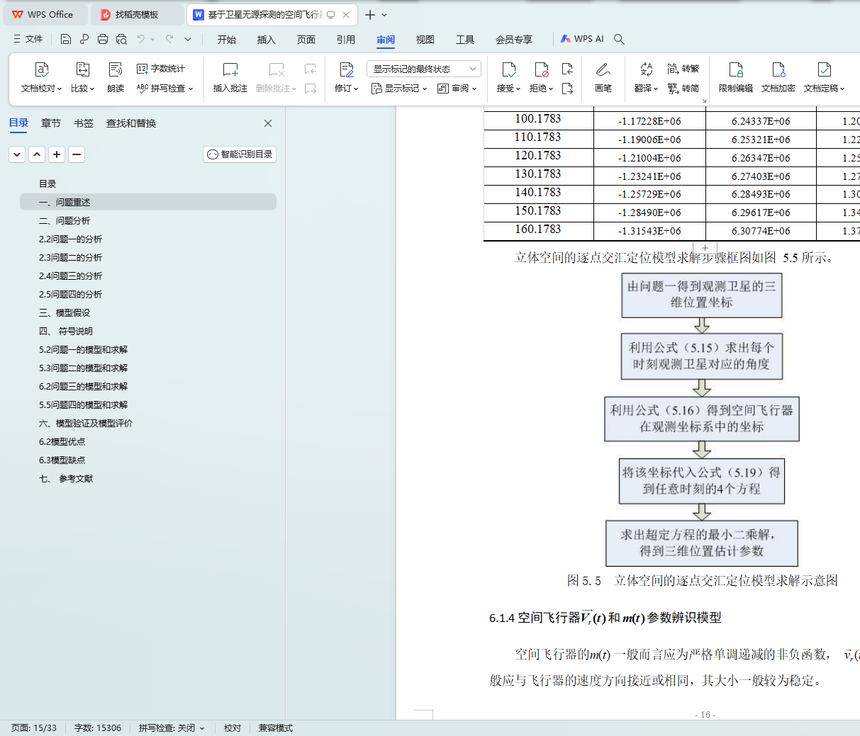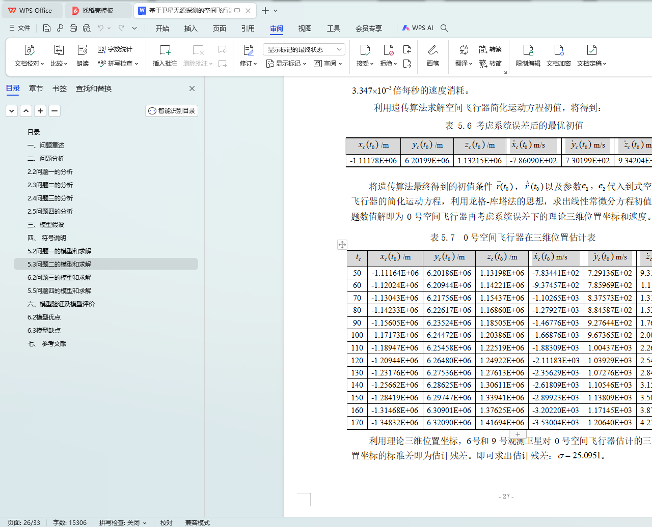 针对问题三,在考虑观测卫星的系统误差时,利用双星多点观测数据联立求解目标位置参数和系统误差参数,论文采用启发式搜索算法进行系统误差和轨道估计,分别计算出 6 号卫星的三轴指向误差为-4.845´10-4 , -7.872´10-4 ,