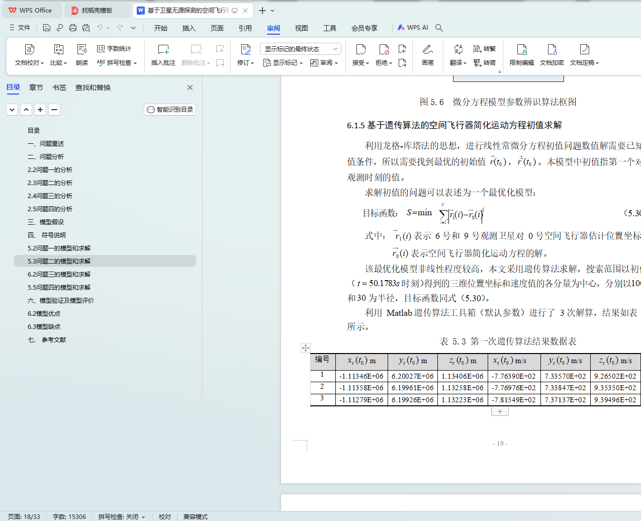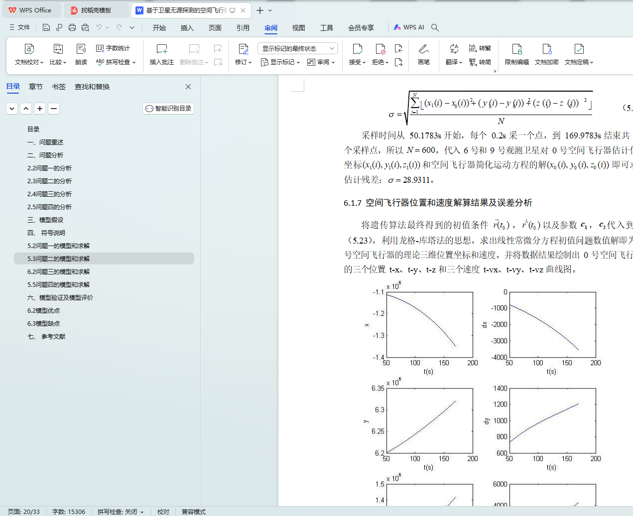 针对问题二,首先基于问题一各卫星不同时刻的计算结果,采用三次样条插值函数完成对观测数据的时间对齐;然后就双星对目标交叉定位观测数据的空间结构进行分析,按照逐点交汇定位思路建立一个超定线性方程组,求该超定方程组的最小二乘解,完成 06 与 09 号卫星对 0 号空间飞行器的逐点定位, 并对结果数据的异常值进行了分析。通过选取适当的vr (t) 和m(t) 的模型形式, 将空间飞行器的运动方程转化为差分形式后,利用多项式拟合得到vr (t) 和m(t) 的参数。最后以估计残差最小为优化目标,利用遗传算法求出最优的初值,从而求出 0 号空间飞行器的理论三维位置坐标和速度,与逐点交汇定位结果比较, 得到估计残差(标准差)为28.9311。
