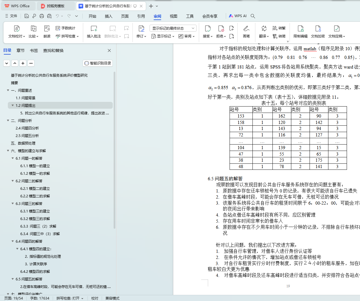 针对问题四:根据前三个问题的统计结果,结合公共自行车服务指南,确定评价公共自行车服务系统站点设置和锁桩数量的配置的主要指标有:借车频数、还车频数、可借比例、可还比例、锁桩数目,建立了基于灰色关联分析法和聚类分析的公共自行车服务评价模型,得到评价结果:180个站点分成有优劣之分的三个类(见表十五)。