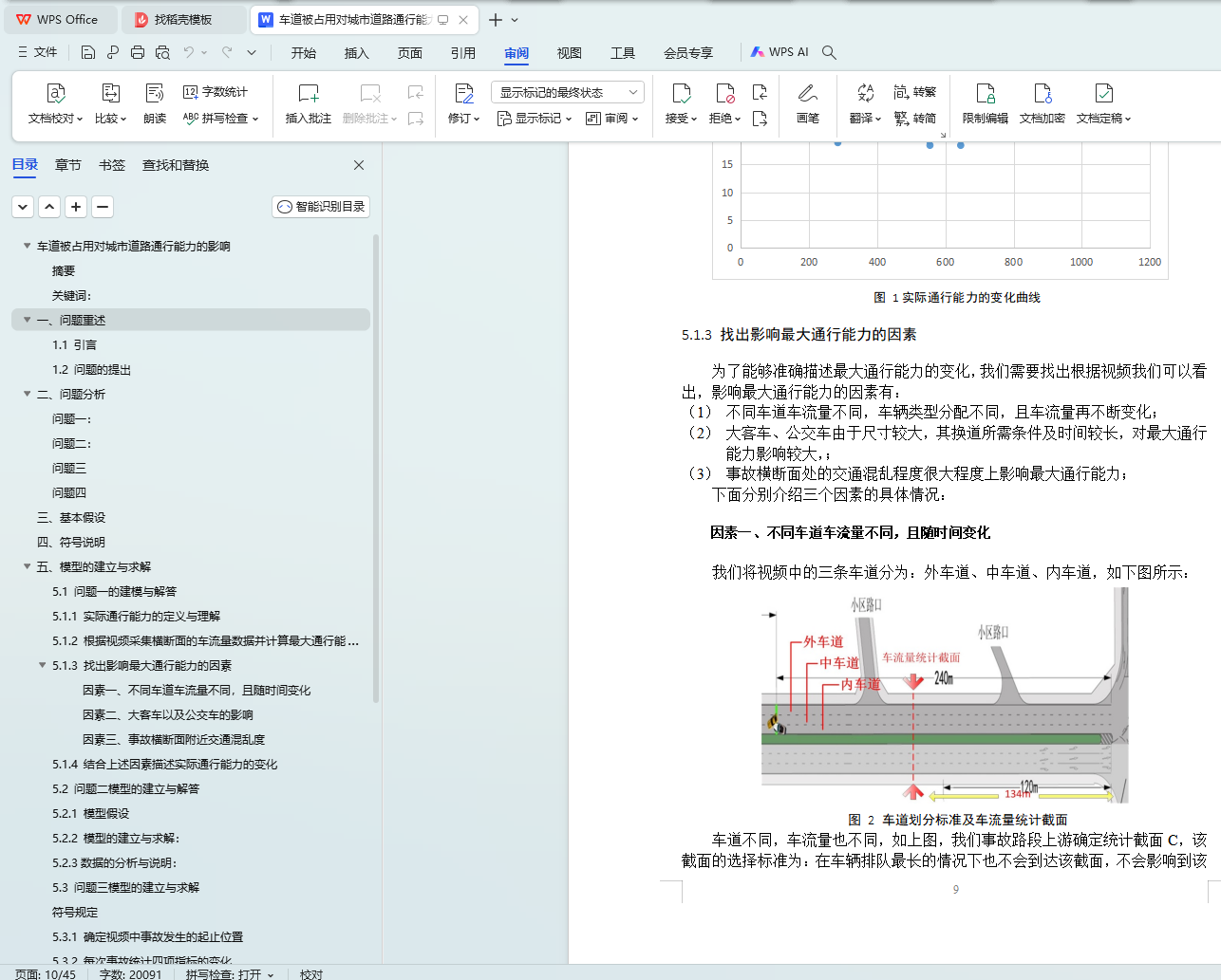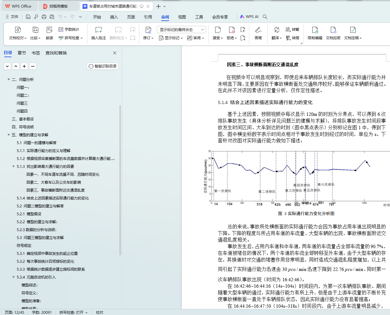 本文针对车道占用对城市交通能力影响的评估与预测问题,以题目所给视频为基础进行大量的数据挖掘,利用排队论、多元回归、元胞自动机为理论基础进行了完整的建模工作。首先,我们处理得到事故所处横断面实际最大通行能力,结合各方面因素分段描述了其变化情况;在此基础上结合视频2,借鉴排队论模型,从本质上分析并说明了占用不同车道对实际通行能力的影响差异;建立了多元回归分析模型和元胞自动机模型来共同描述排队长度与其他指标的联系;最后对模型加以检验后应用于问题四,估算出了大约5.5~7.5min后车辆排队长度将达到上游路口。