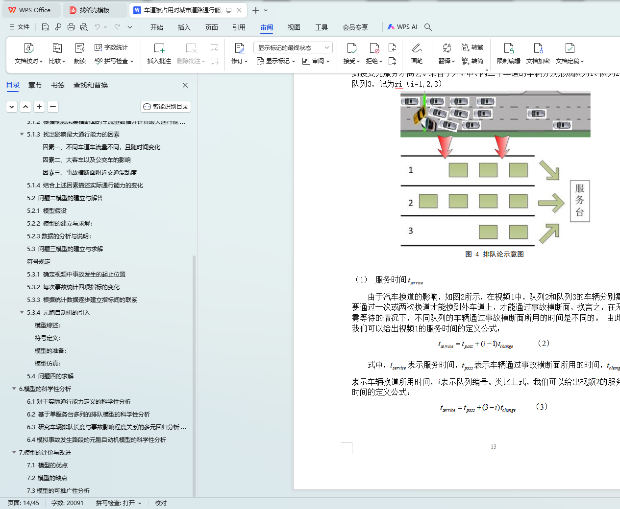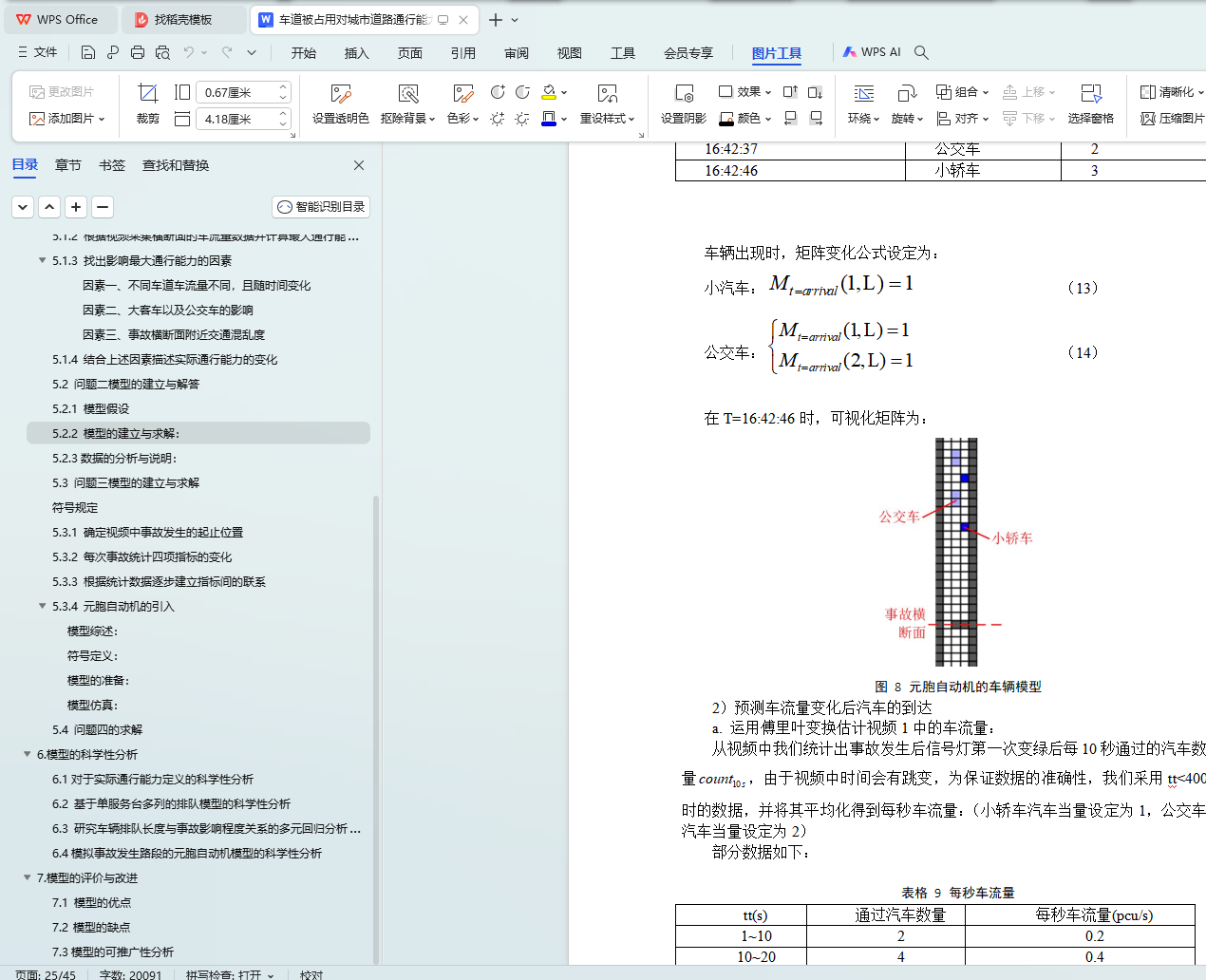 针对问题四,首先利用视频1的车流量统计数据对车流量进行建模,利用该模型预测此问题中1500pcu/h的车流量在空间(不同车道)和时间上的分配情况,在问题三的元胞自动机模型基础上,得到真实反映问题四所述情况的元胞自动机模型,多次运行该模型后,估算得到一个合理的时间范围为5.5min~7.5min(330s~450s)。