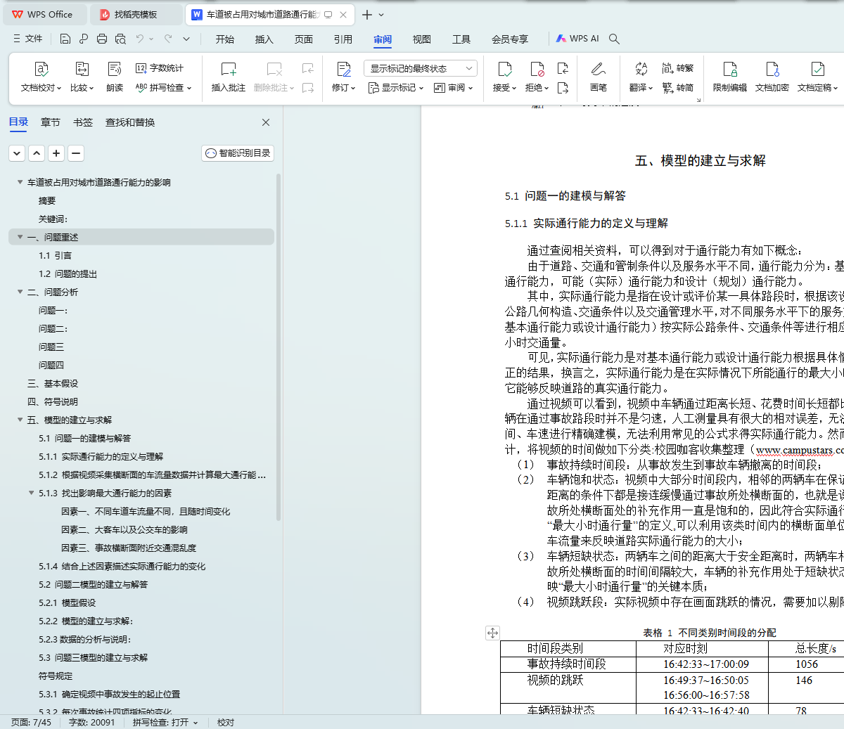 针对问题一,结合实际最大通行能力的本质,考虑到视频1中事故横断面的交通绝大部分处于饱和的特点,将事故横断面处在车辆饱和状态下的单位时间车流量作为其实际最大通行能力。通过对视频数据的采集与分析,得到了实际最大通行能力的变化规律以及主要影响因素。以视频1中的6次车辆排队事故为分段,结合主要影响因素完备地描述了实际最大通行能力的变化。