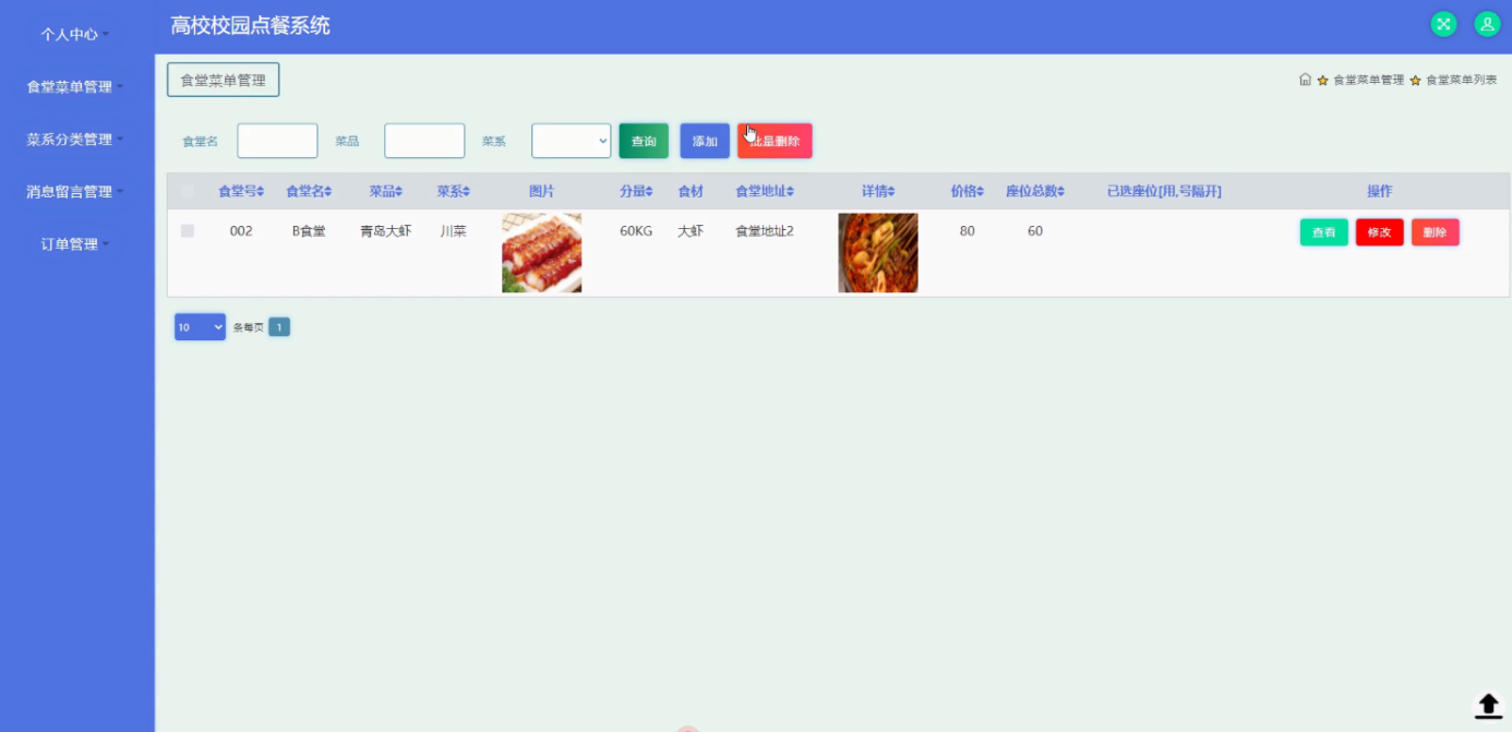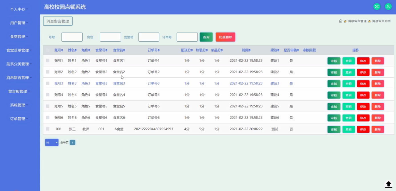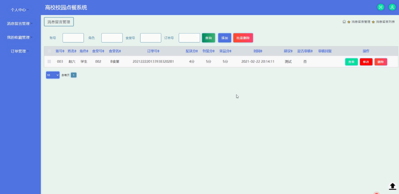 本文以Java为开发技术,实现了一个高校校园点餐系统。高校校园点餐系统的主要使用者分为管理员;个人中心、用户管理、食堂管理、食堂菜单管理、菜系分类管理、消息留言管理、留言板管理、系统管理、订单管理,用户;个人中心、消息留言管理、我的收藏管理、订单管理,食堂;个人中心、食堂菜单管理、菜系分类管理、消息留言管理、订单管理,前台首页;首页、食堂菜单、新闻资讯、留言反馈、我的、跳转到后台、购物车等功能。通过这些功能模块的设计,基本上实现了整个高校校园点餐系统的过程。