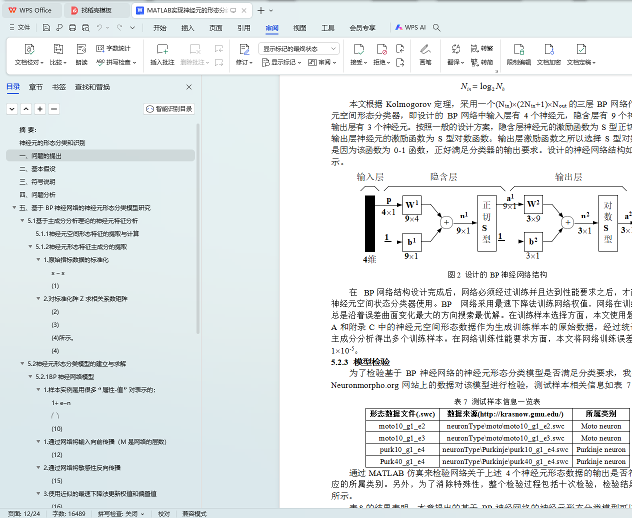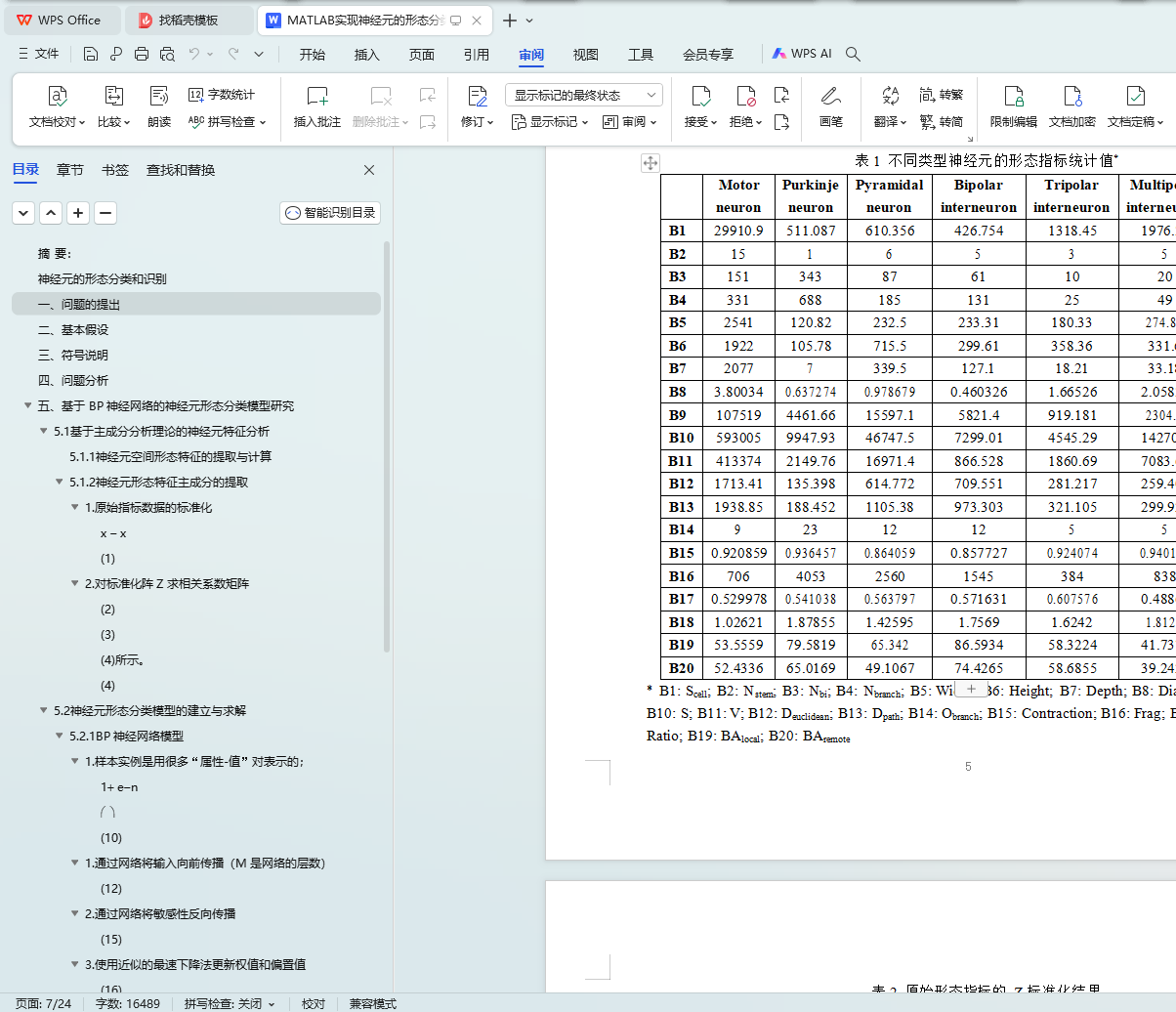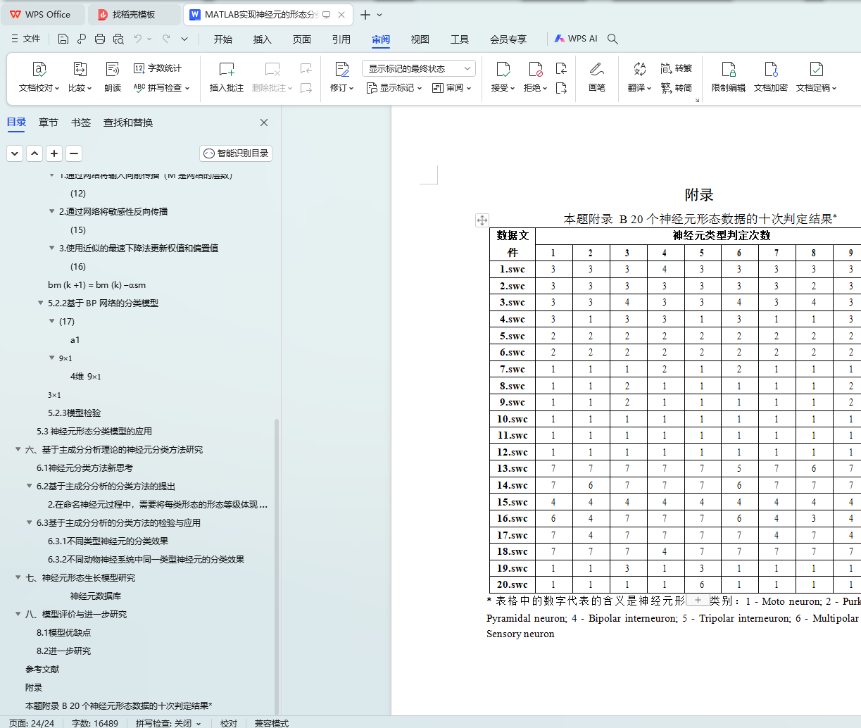 首先,对于问题一,采用 20 个形态参数描述神经元的形态特征,利用主成分分析理论将其降维,获得 4 个综合性主成分特征。在此基础上建立了一个基于 BP 神经网络的形态分类模型,并通过网站上的测试样本检验该模型的正确性;针对问题二,使用该分 类模型对本题附录 B 中神经元进行分类,分类结果如下:编号 7、8、9、10、11、12、