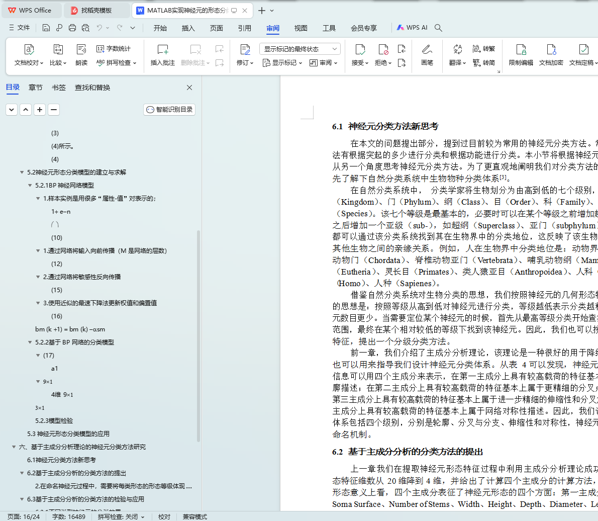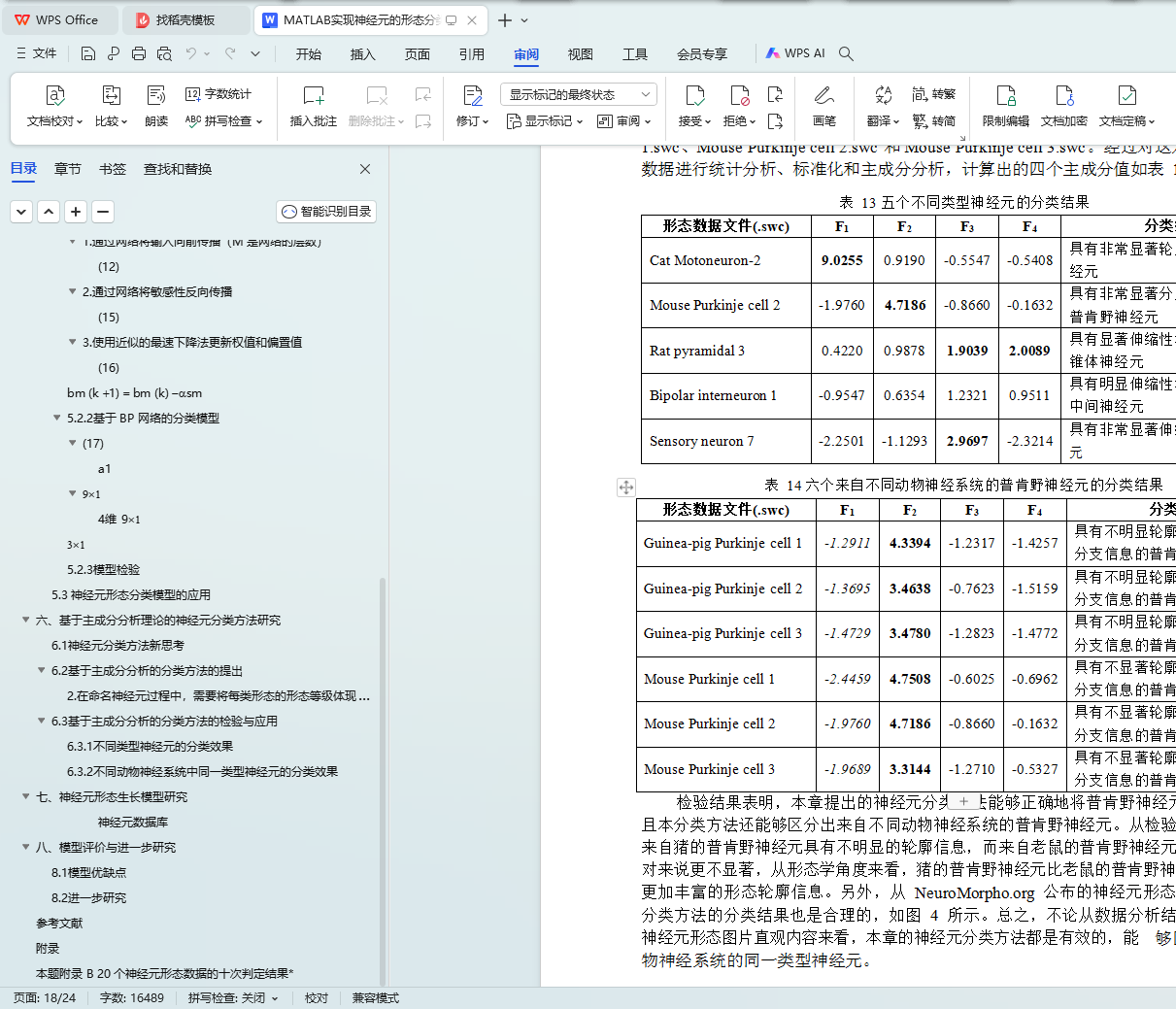 其次,对于问题三,参考自然分类系统中生物物种分类体系,根据前面获得的 4 个综合性形态特征的物理含义,提出了一种基于主成分分析理论的神经元分类方法;设计 了四级分类体系,分别是轮廓、分叉与分支、伸缩性和对称性;给出了神经元的多级命 名建议。多个具体实例的检验结果表明该分类方法能够正确地将具有不同形态特征的神 经元进行分类,并且提供形态特征显著性评价,为神经元的命名提供数据支撑。检验结 果还表明本分类方法能够区分来自不同动物神经系统的同一类型神经元,能够很好的区 分附件 A 中猪和鼠的普肯野神经元。