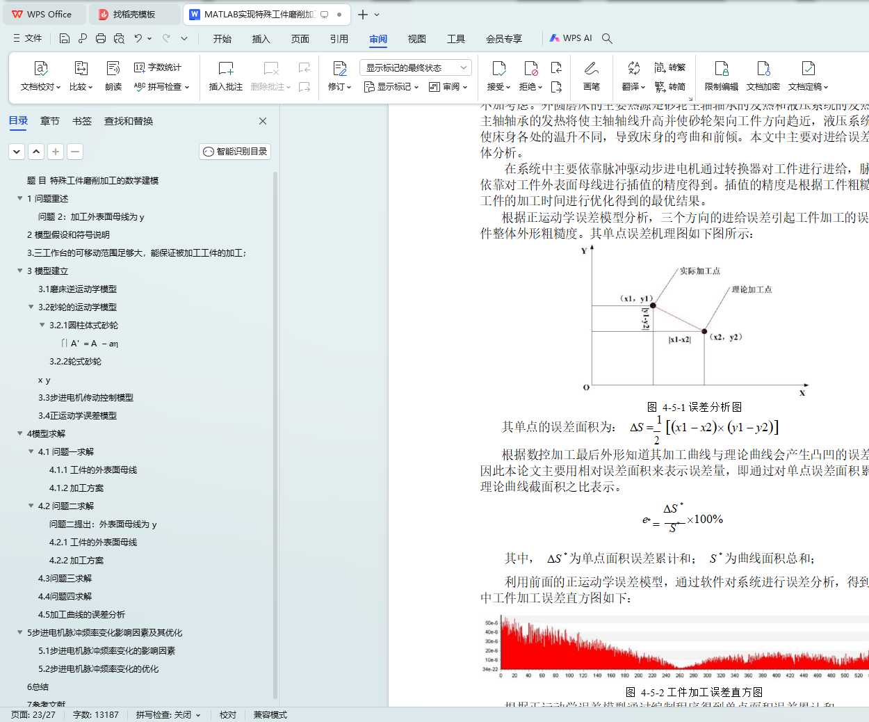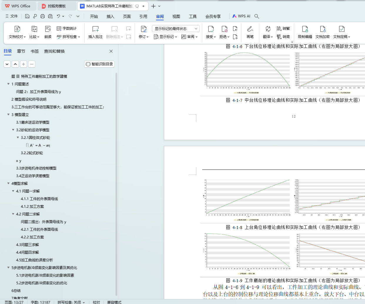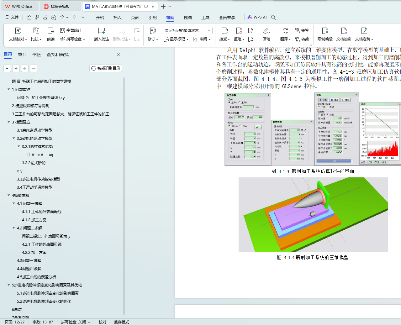 针对该类型问题的求解,在所建立的模型基础上,采用 Delphi 软件开发出一套磨床加工仿真软件。通过在工件表面取一定数量的离散点来模拟磨削加工的动态过程,得到加工的磨削轨迹和各工作台的运动轨迹。分析题中四个问题得到其加工误差值分别为: 0.000115% , 0.000122% , 0.000116% , 0.000170% 。