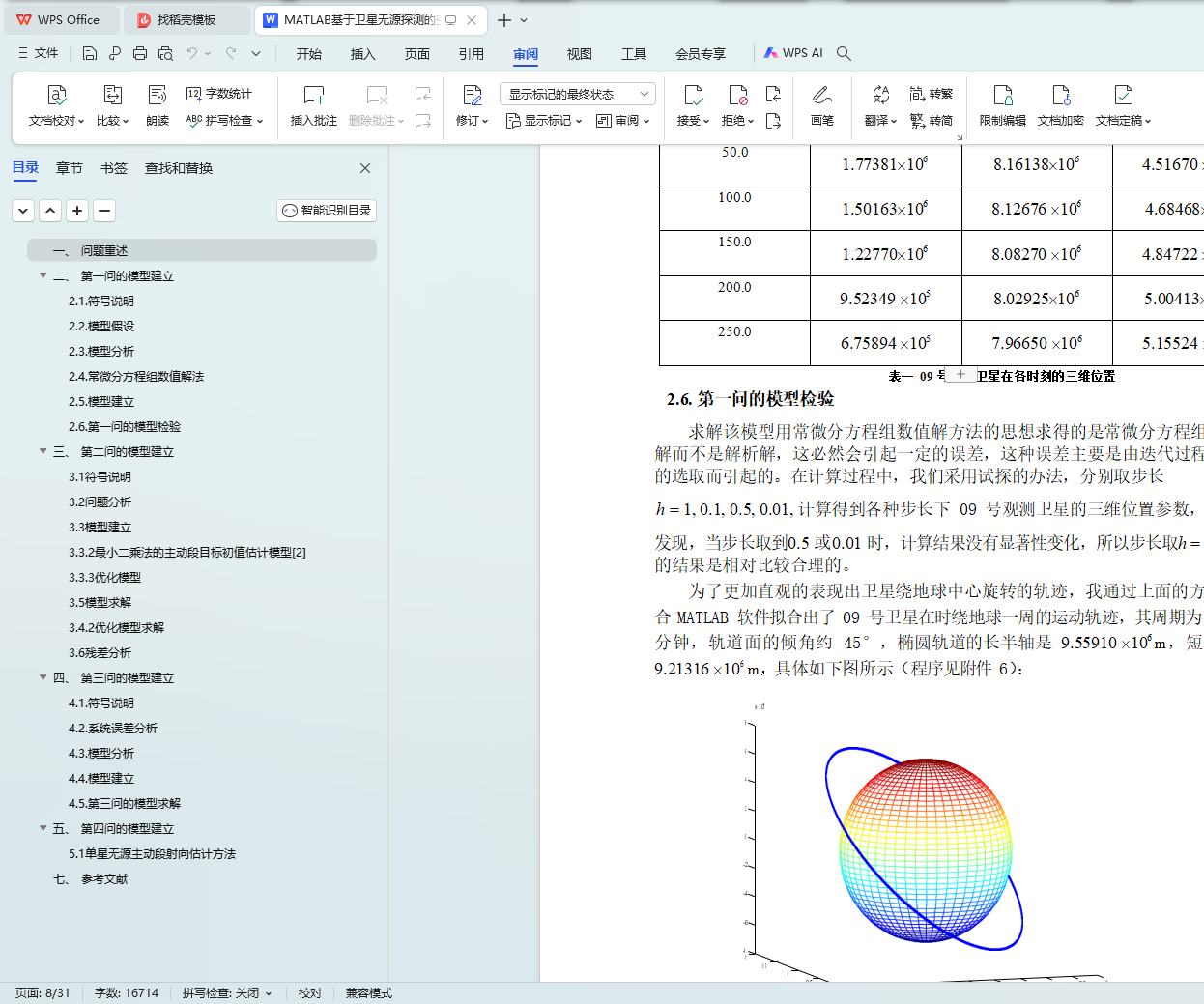 针对问题一,文中用微分方程数值解法给出了 09 号观测卫星在给定时刻的三维位置,以 50.0s 为例,该时刻下 09 号观测卫星的三维位置是(1.77381´106 , 8.16138´106 , 4.51670 ´106 )。此外,还绘制了 09 号观测卫星运动轨道的图像。