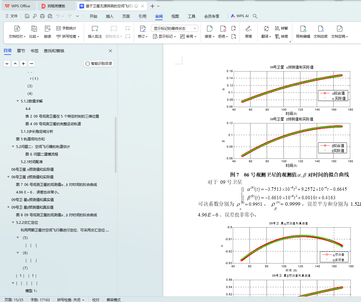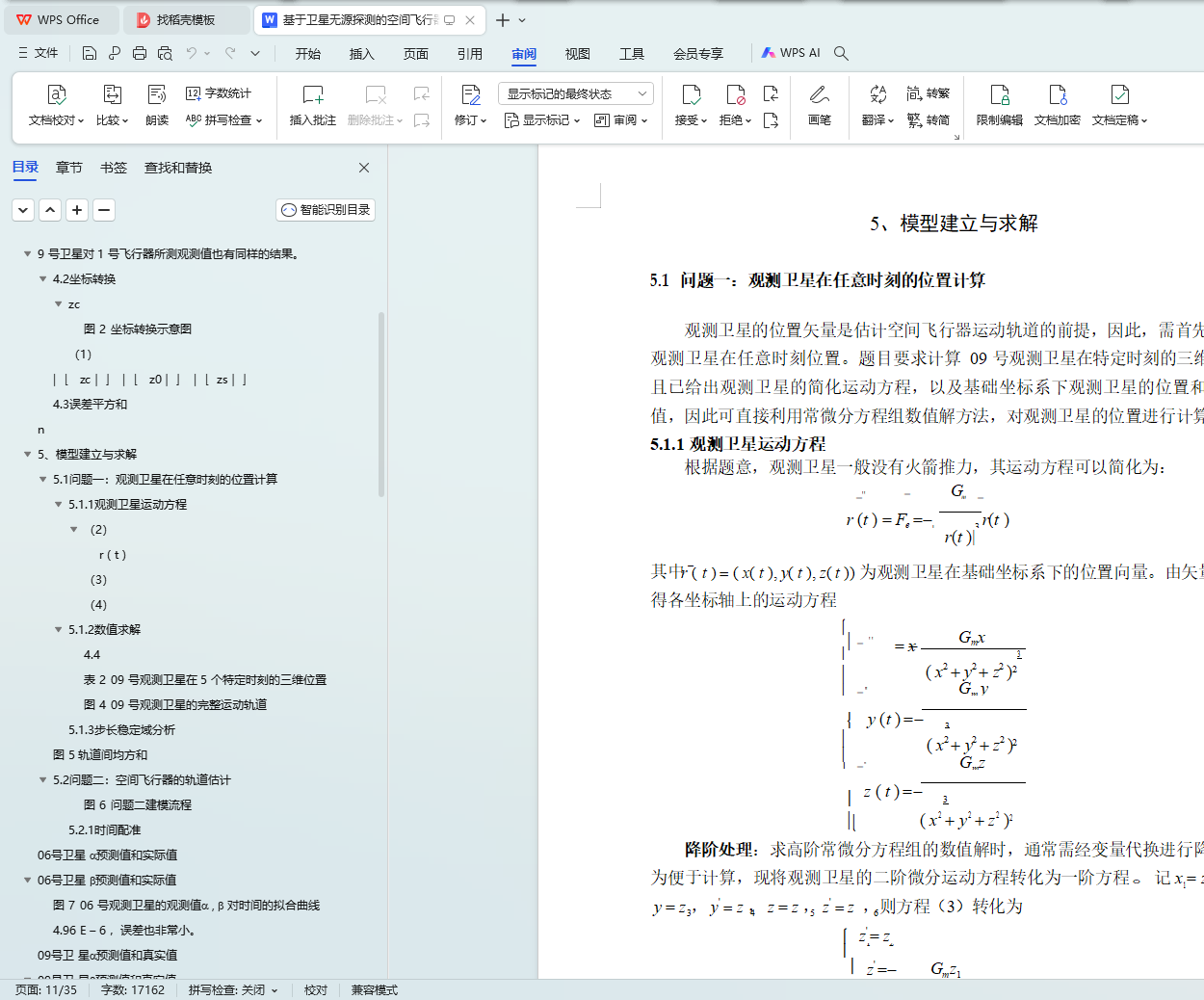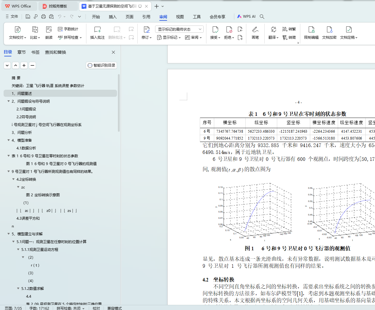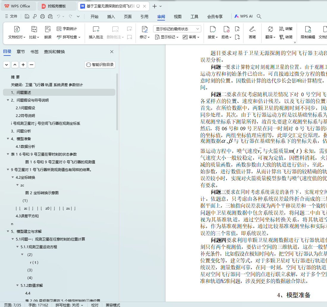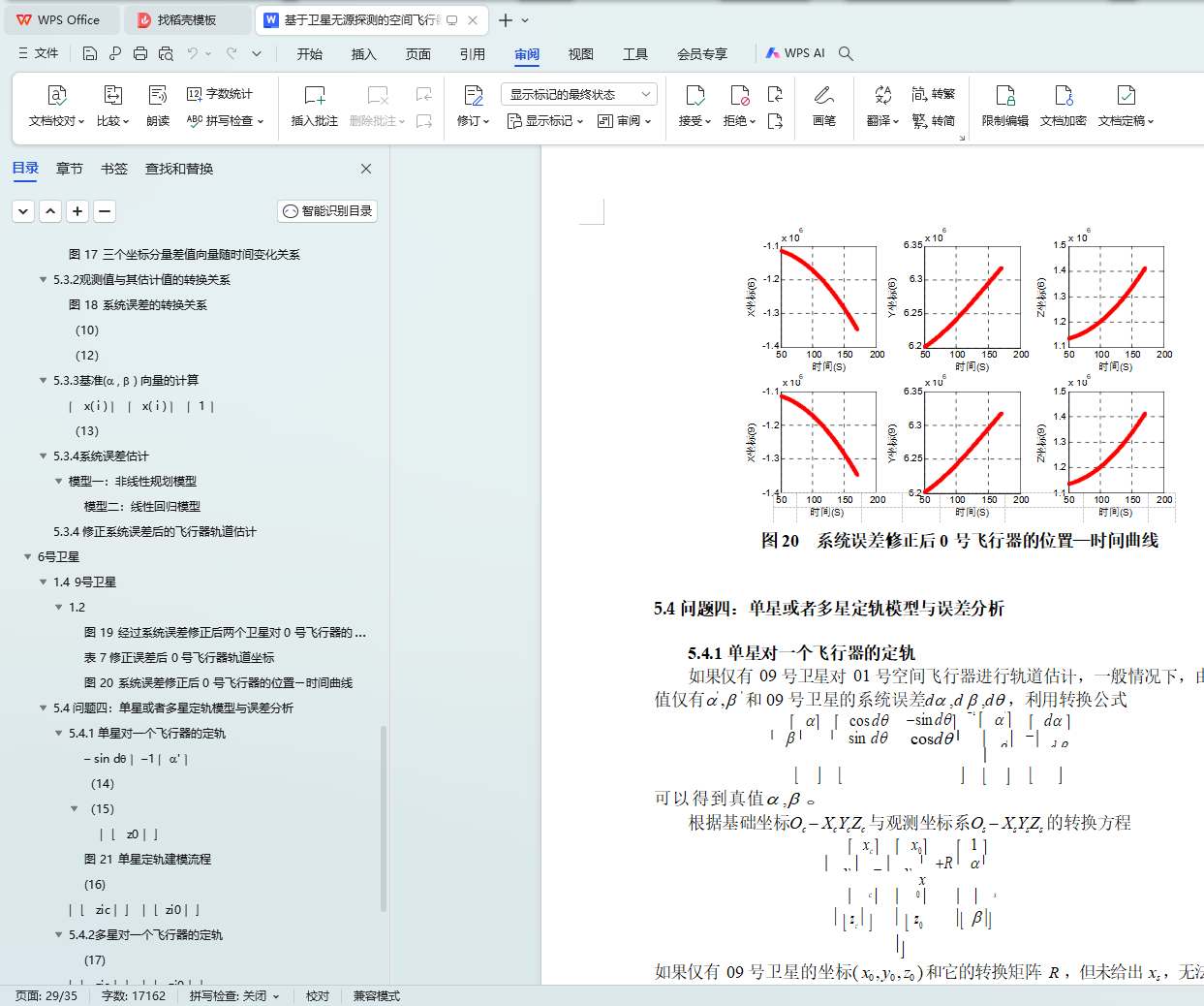 针对问题四:对单星、单飞行器定轨情况,提出了一个合理的假定,建立了优化模型,并对 01 号飞行器的轨道进行了估计,得到了相应结果;对多星、单飞行器定轨情况,提出了一个定轨的最小二乘优化模型;对多星、多飞行器的定轨情况提出了首先要研究的两个难点,才能联合进行系统误差估计。