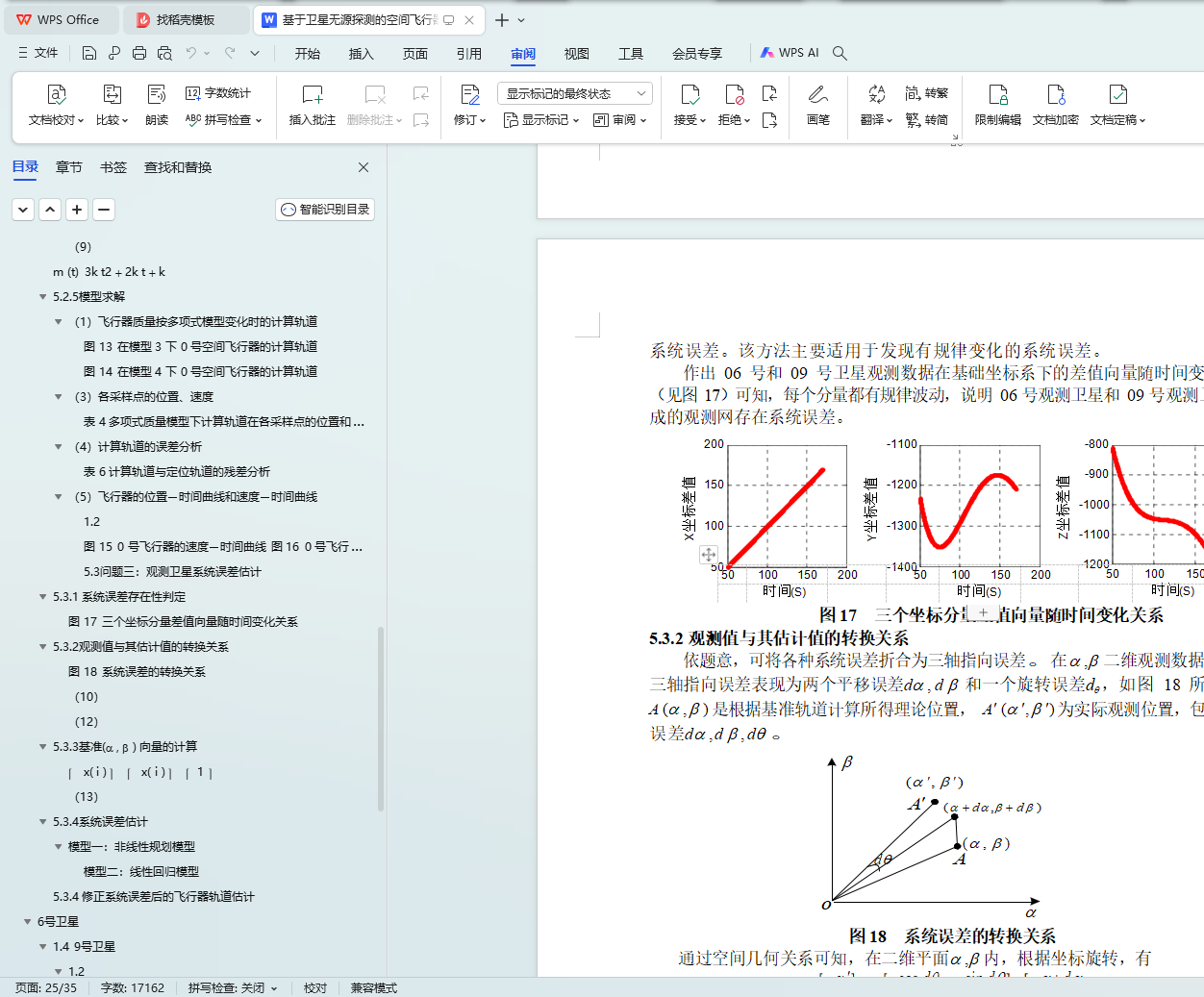 行器计算轨道视为基准轨道,通过坐标转换,得出它在测试坐标系下的坐标;最后通过系统误差的转换公式,建立了最小二乘优化模型,用 Matlab 求解得到了 06 号和 09 号卫星的系统误差,并通过误差修正了原基础坐标,对轨道重新估计,误差
