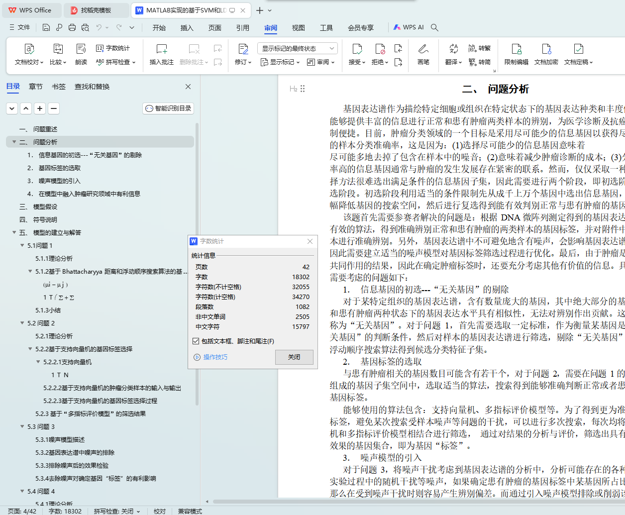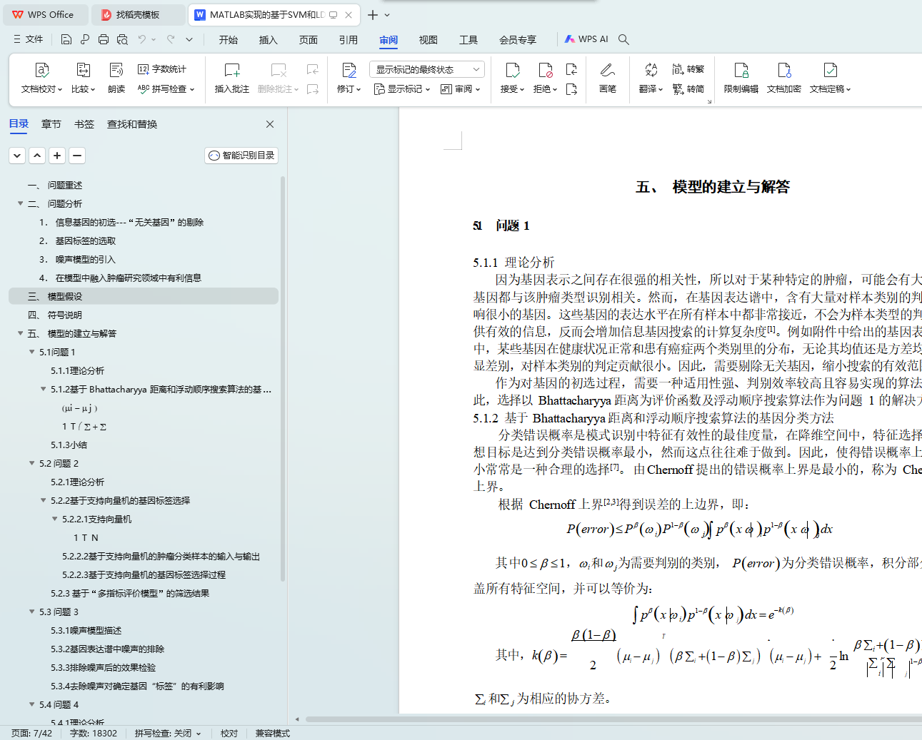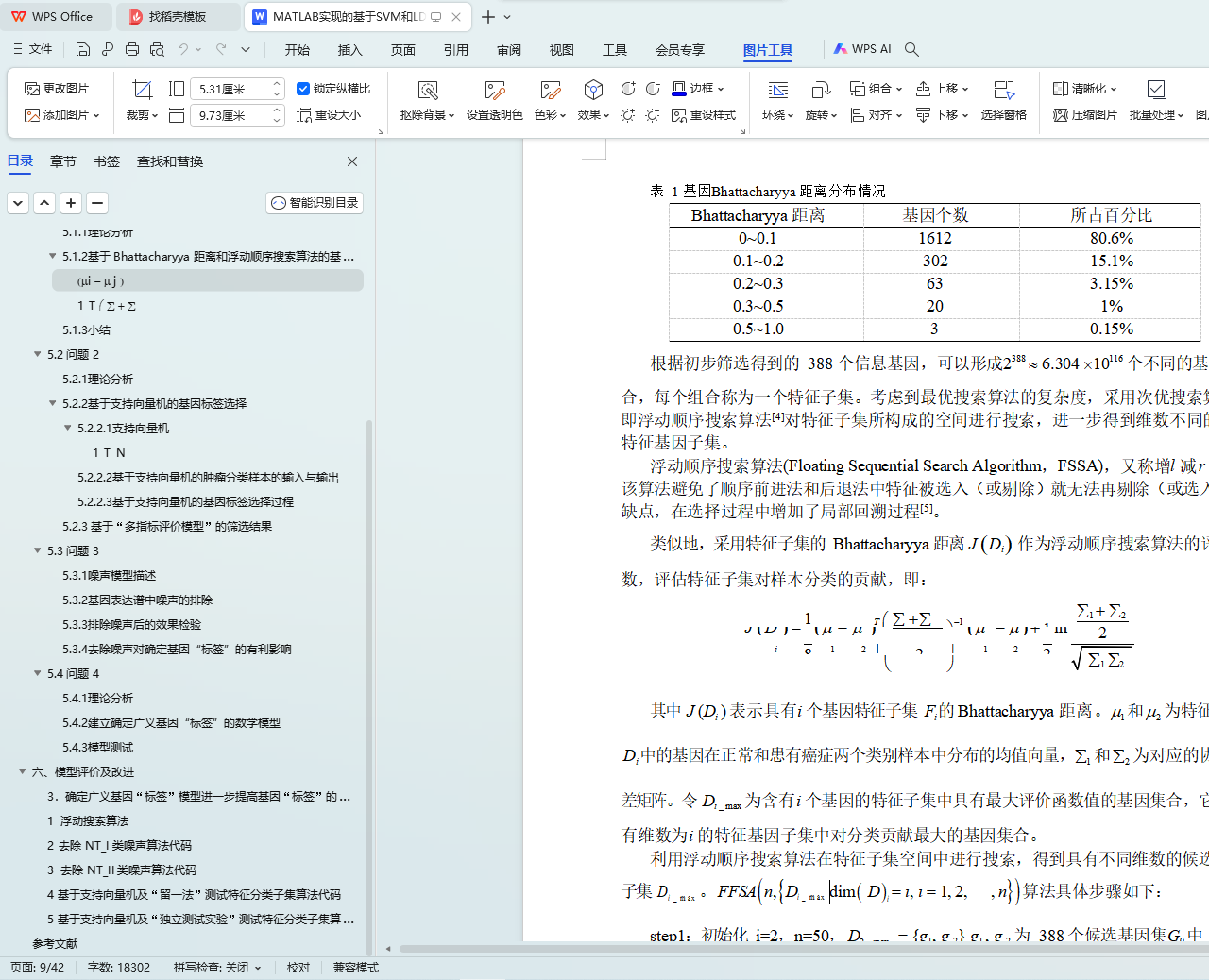 针对问题 1,首先以 Bhattacharyya 距离为评价函数,对样本中 2000 个基因进行无关基因的剔除,得到 388 个信息基因;然后,在信息基因集合中,根据浮动顺序搜索算法搜索得到 35 个候选分类特征子集,为问题 2 中基因标签的筛选提供必要条件。
