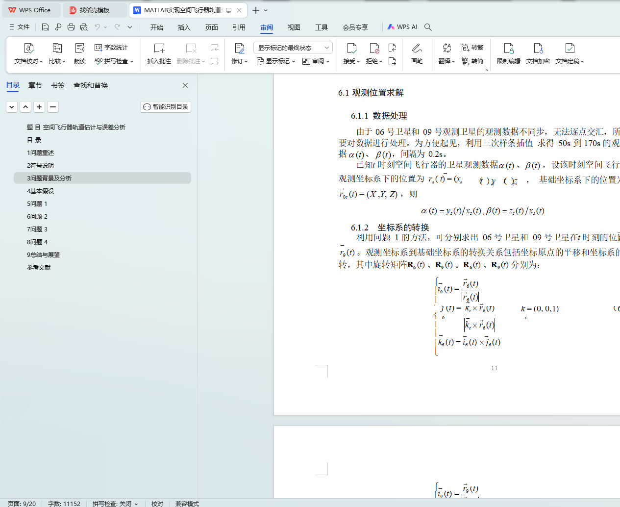 对于问题二,利用逐点交汇的思路,将 0 号空间飞行器在 06、09 号卫星观测坐标系下的坐标转换到基准坐标系下,由于误差的存在,转换后的点并不交汇, 于是通过最小二乘法求解飞行器在惯性系下的近似交汇位置。随后使用差分法求解飞行器在惯性系下的速度和加速度。在差分过程中,由于从观测量所得的飞行器位置信息含有随机误差,所以通过拟合的方法将其中的随机误差进行消除,防