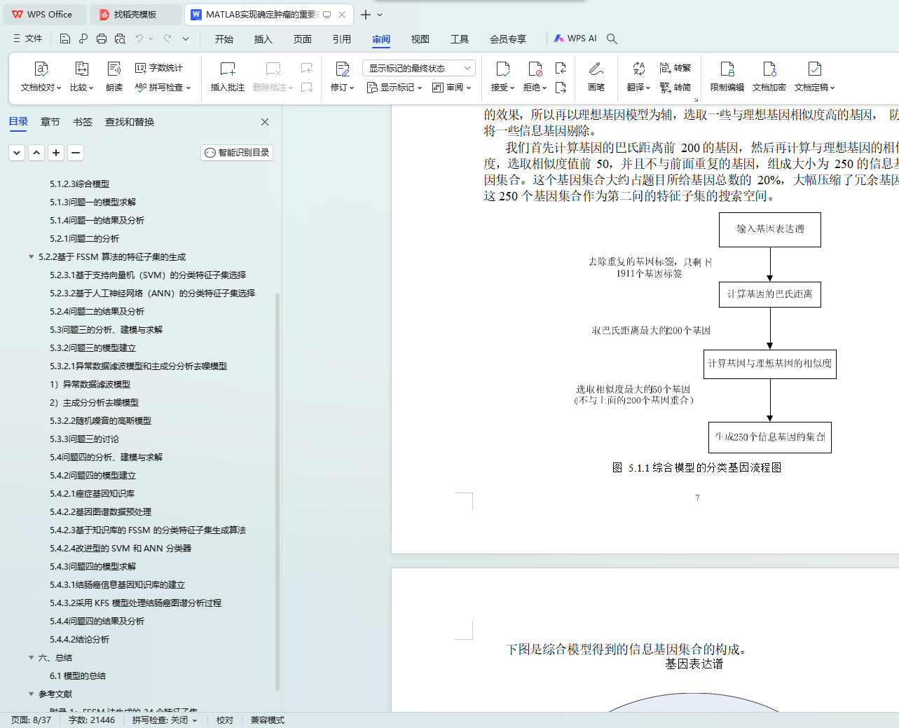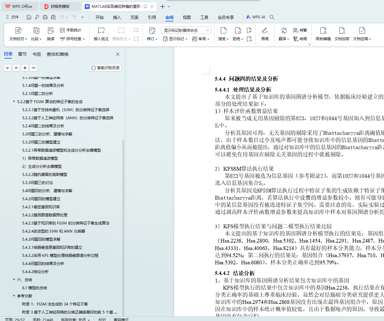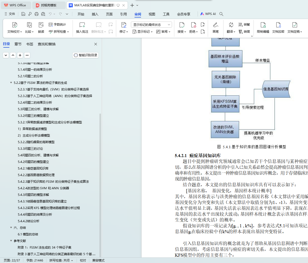 第四问,提出基于知识库的基因图谱分析模型 KFS 模型,该模型在引入信息基因知识库的基础上,对基因图谱进行去噪处理、样本评价函数增益、剔除无关基因,并采用基于知识库的 KFSSM 算法获得特征子集,最后分别采用 SVM 及 ANN 方法获取信息基因集合。本文最后对已知临床经验的结肠癌数据进行处理得到一组信息基因组合,样本分类正确率达到 94.52%。