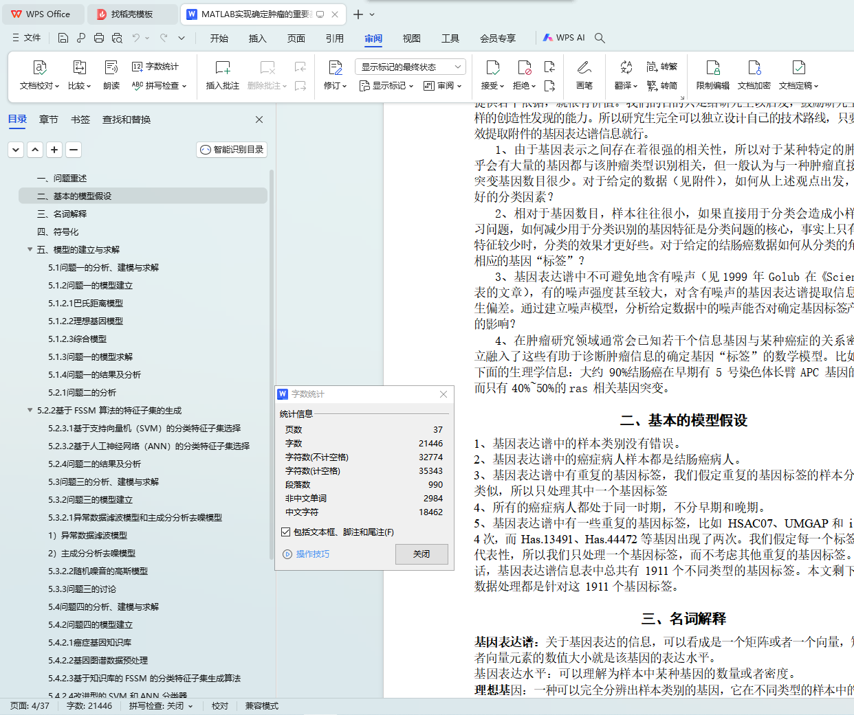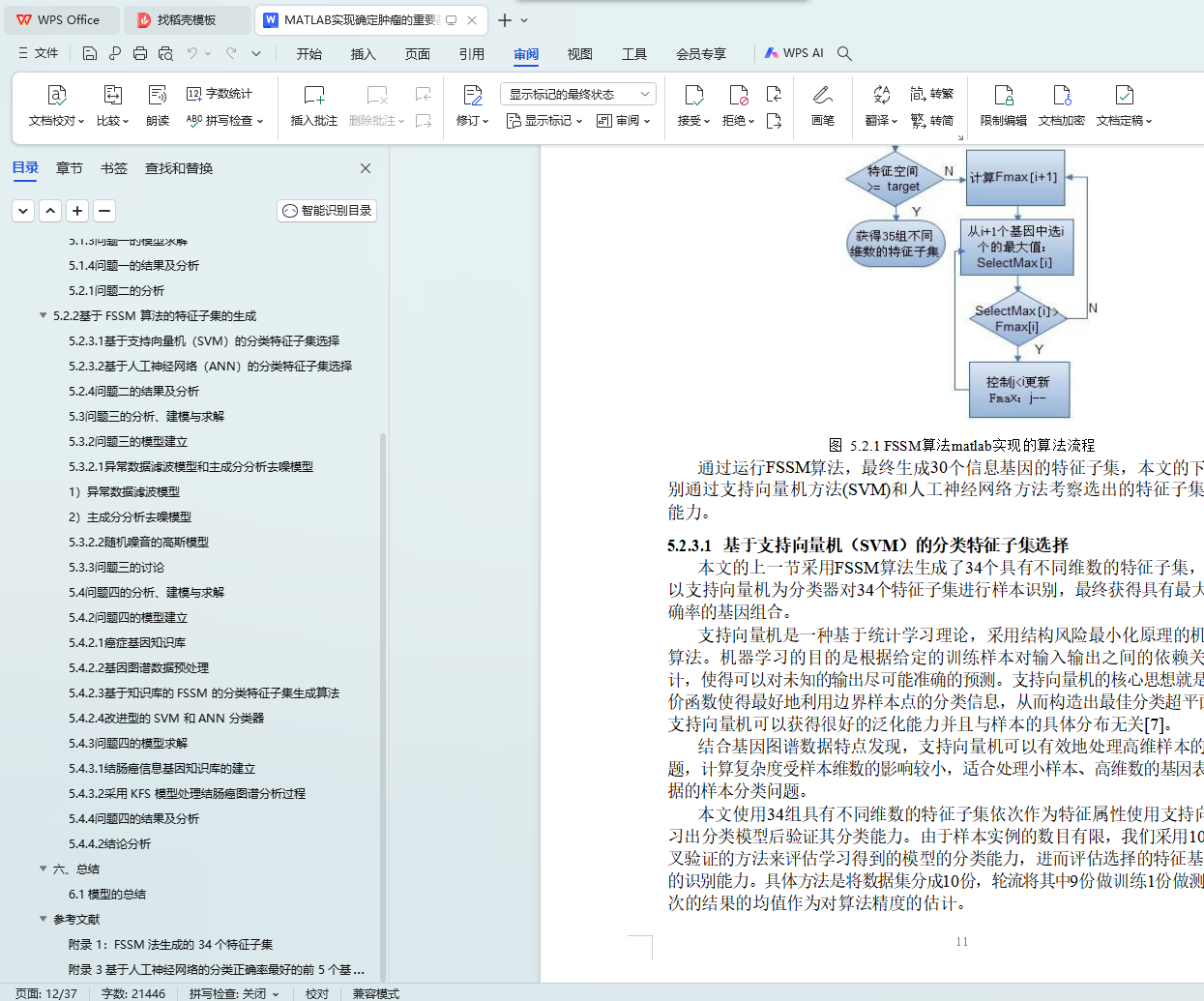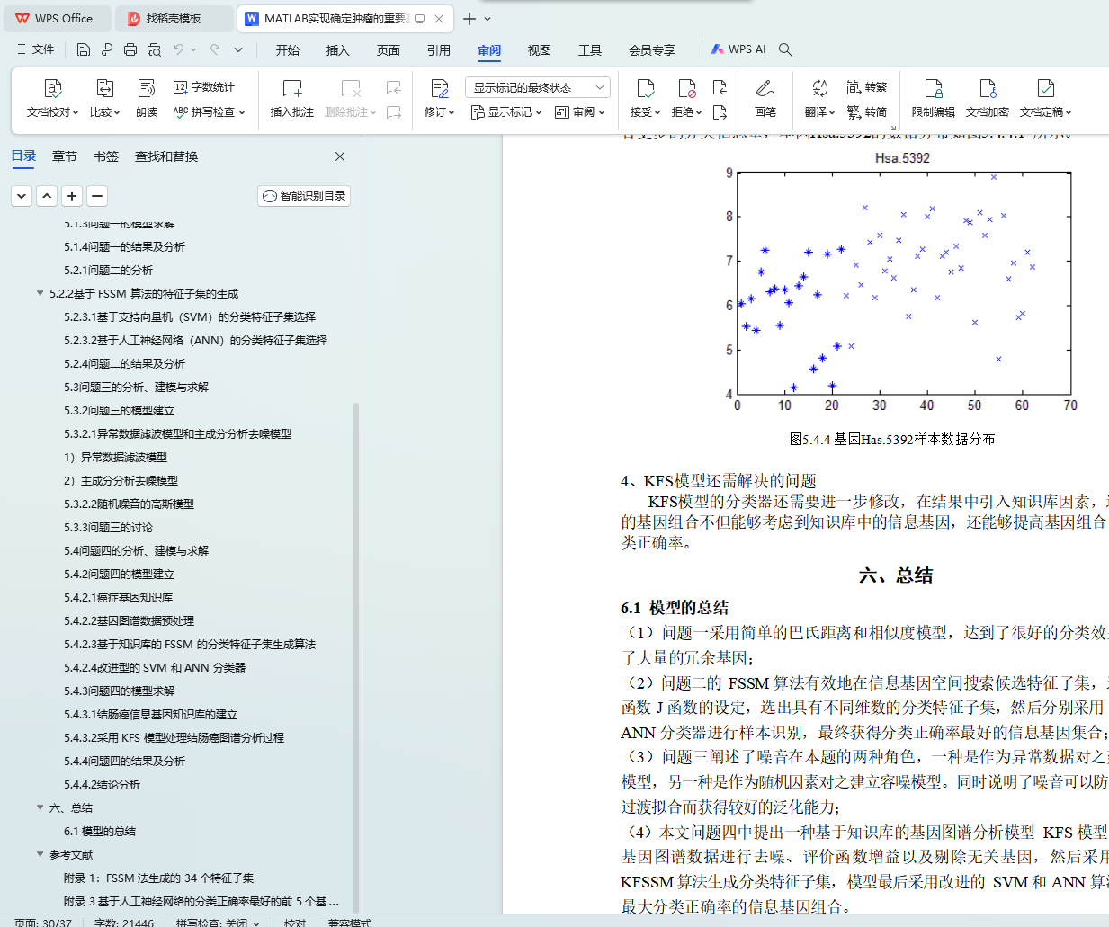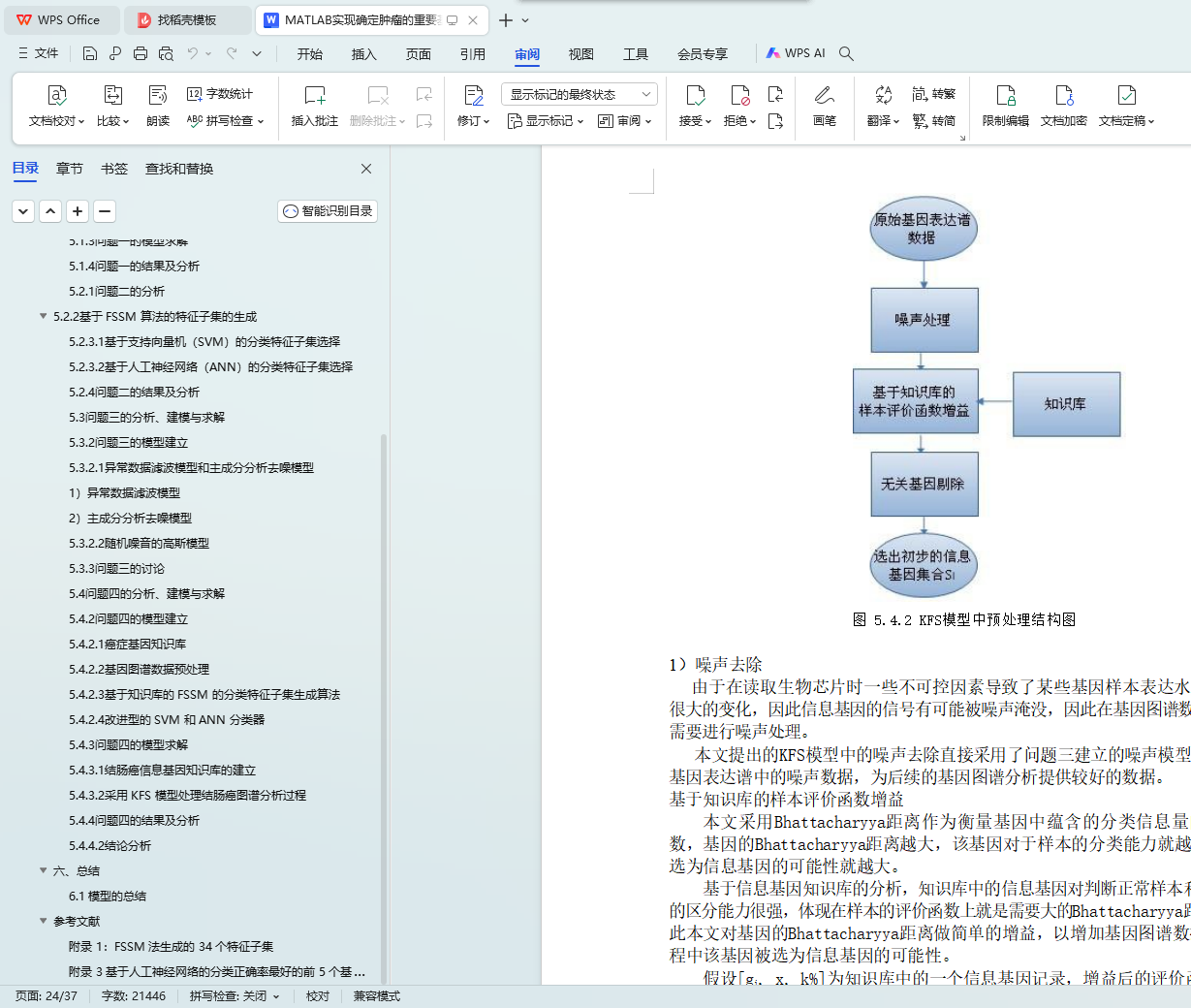 第四问,提出基于知识库的基因图谱分析模型 KFS 模型,该模型在引入信息基因知识库的基础上,对基因图谱进行去噪处理、样本评价函数增益、剔除无关基因,并采用基于知识库的 KFSSM 算法获得特征子集,最后分别采用 SVM 及 ANN 方法获取信息基因集合。本文最后对已知临床经验的结肠癌数据进行处理得到一组信息基因组合,样本分类正确率达到 94.52%。