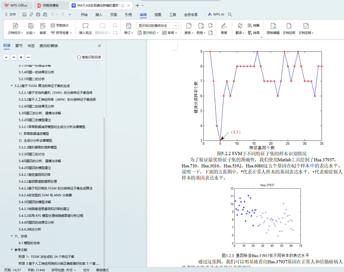 第二问,使用 FSSM 算法在信息基因空间里寻找出候选特征子集,然后将样本划分为训练集和测试集,使用支持向量机 SVM 和人工神经网络,对 FSSM 搜索出来的特征子集的分类能力进行判定。本文得到由 5 个信息基因组成的特征子集,样本分类正确率达到 95.79%。