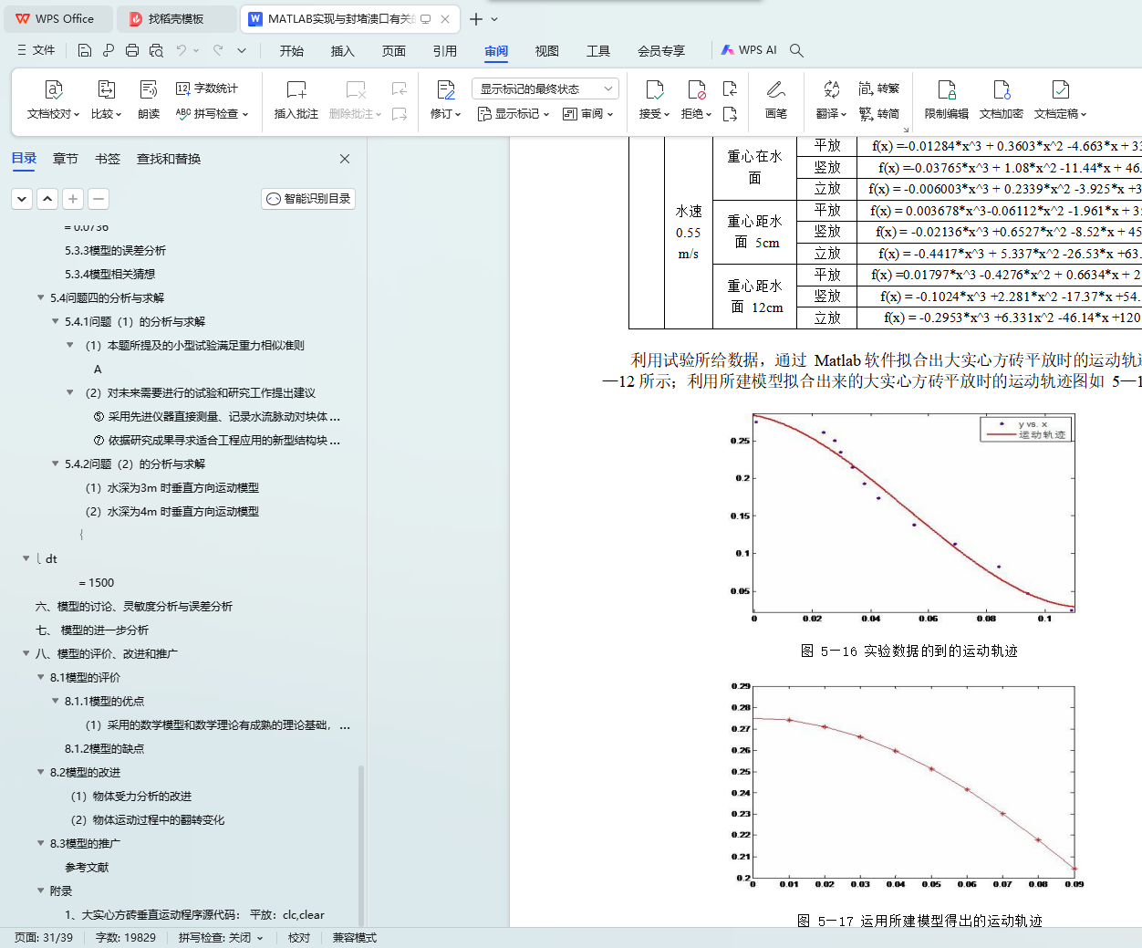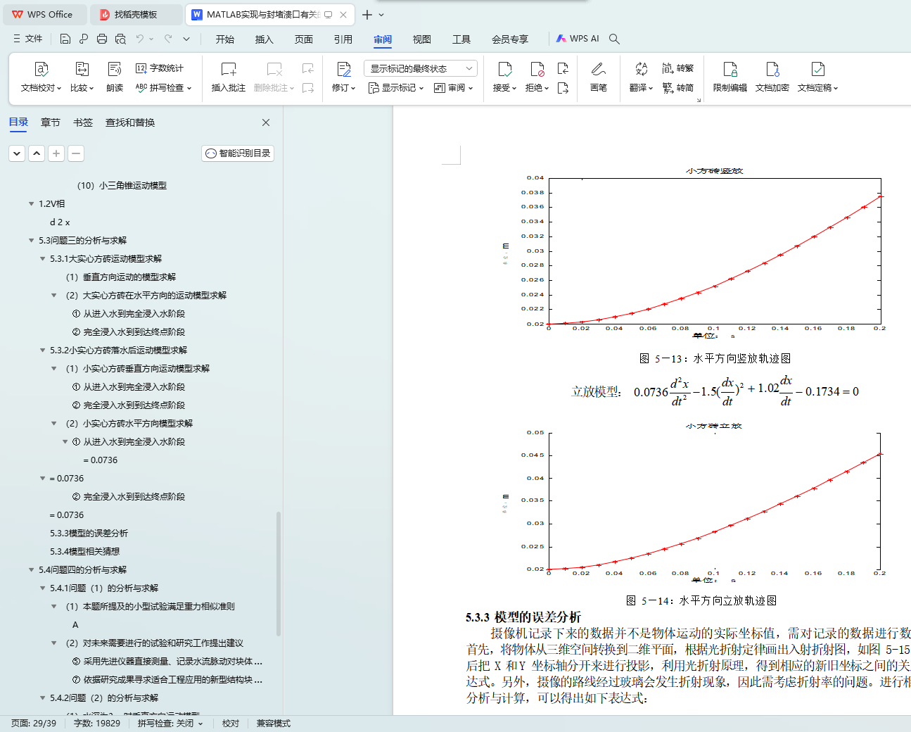 问题 3:在问题二的基础上,利用 Matlab 软件对大实心方砖和小实心方砖的运动模型求解,生成运动轨迹图形。利用光的折射原理对试验数据进行坐标值转换,然后对处理过的数据进行拟合可得到各单件的运动方程。以大实心方砖为例进行分析,对比拟合试验数据得到的和所建模型得到的运动方程,从而可以计算出离散时间点的相对误差, 其值大约为 8%~13%,符合容许条件,证明所建模型还是比较合理的。