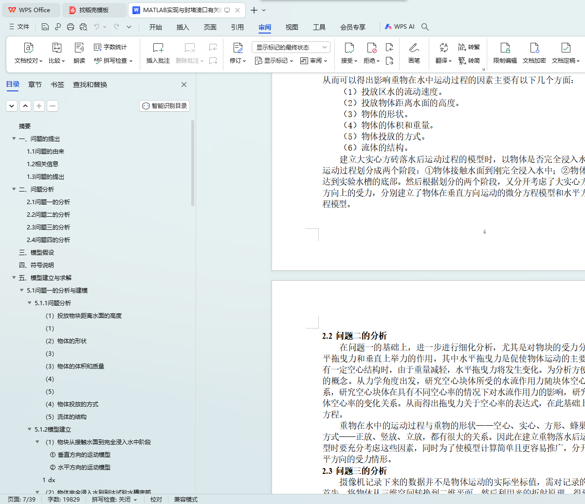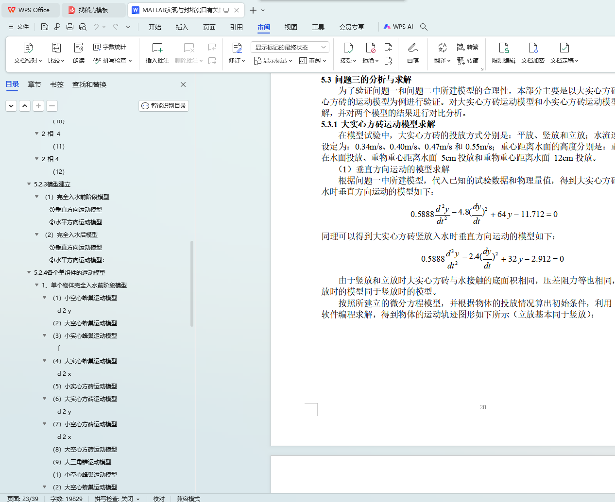 问题 1:在合理假设的前提下,通过对试验模型中各单件相关数据进行分析并参考相关资料,得出影响重物在水中运动的主要因素,包括流速、投放高度、投放方式、物体体积和重量等。然后按照物体是否完全浸入水中把运动过程分成两个阶段,再分别从垂直和水平两个运动方向考虑,建立了大实心方砖落水后运动过程的微分方程模型,详见 7~8 页。