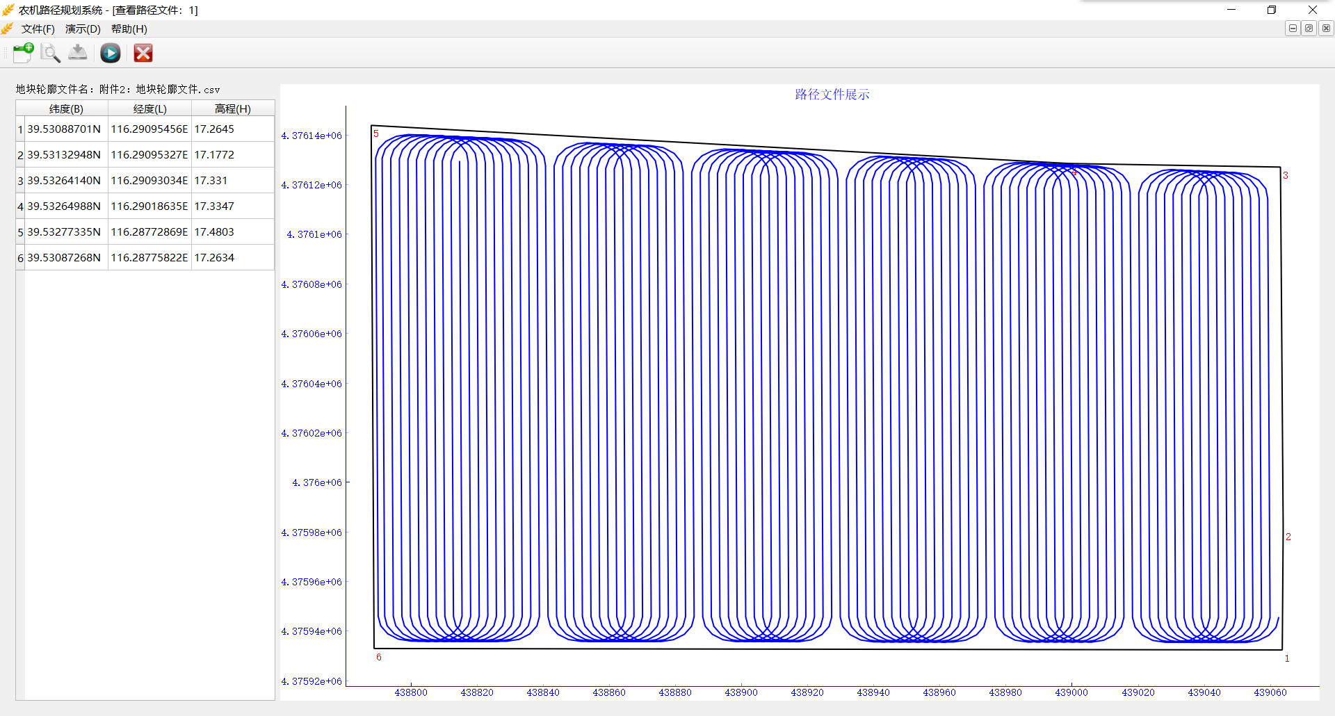 开发了一款以PyQt5为主框架的耙地机全局路径规划软件,用户可以通过简洁、易上手的可交互界面来使用耙地机全局路径规划算法。通过数据可视化技术,对规划出的农机作业路径进行动态仿真,让用户对规划结果有更直观的了解。