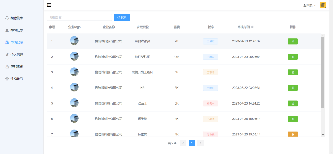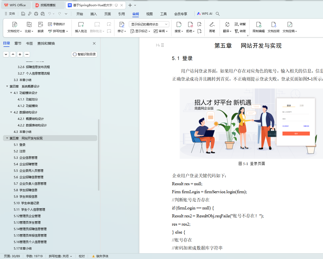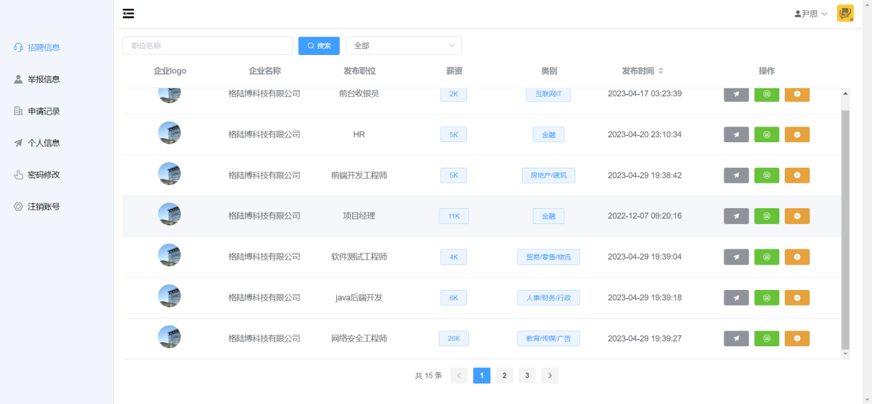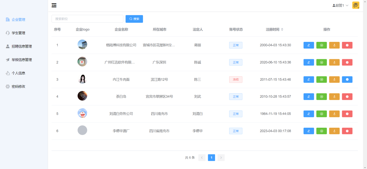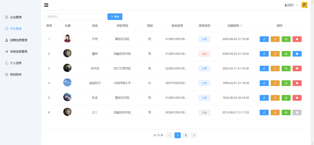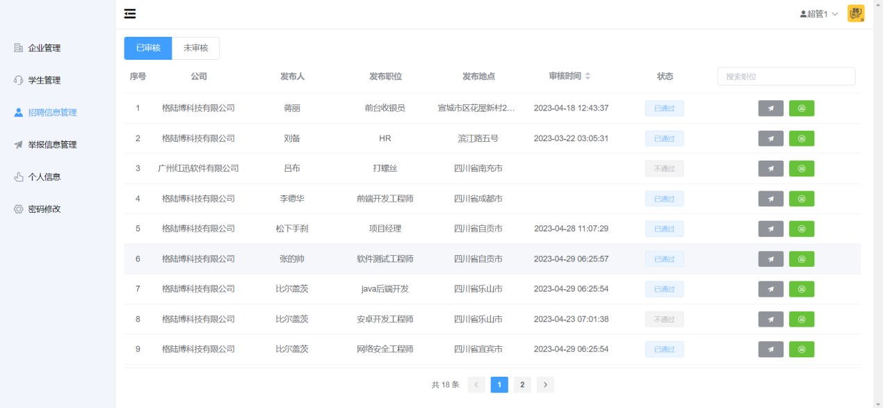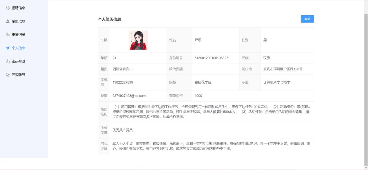 The college student and website is a job-seeking platform specially provided for college students. There are full-time, part-time, winter and summer vacation jobs on the platform. Students can use this platform to find suitable part-time jobs or jobs during their spare time or vacation time to increase their income outside of study. Students can find different types of jobs on the platform: IT Internet, finance, etc. Different companies enter the platform and publish job recruitment information for students to browse, consult and deliver. The platform has student users: login and registration, job application, report information, personal information, job viewing and delivery, etc. Enterprise users: login and registration, recruitment management, employee management, etc. Administrator users: enterprise management, student management, recruitment information management, reporting information management, etc. The website uses MySql relational database, Redis non-relational database, Mybatis, Tomcat server. This website can not only improve the ability of college students to find a job, but also has an indirect relationship with the improvement of the employment rate of the school.