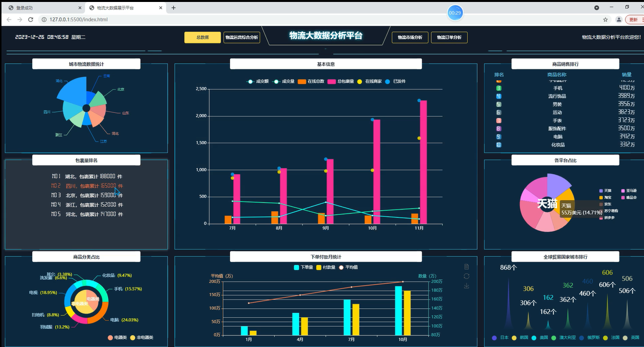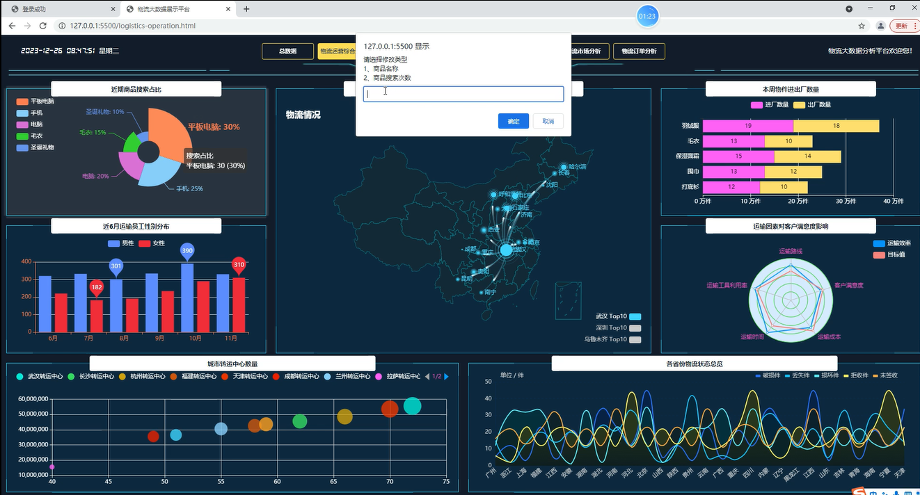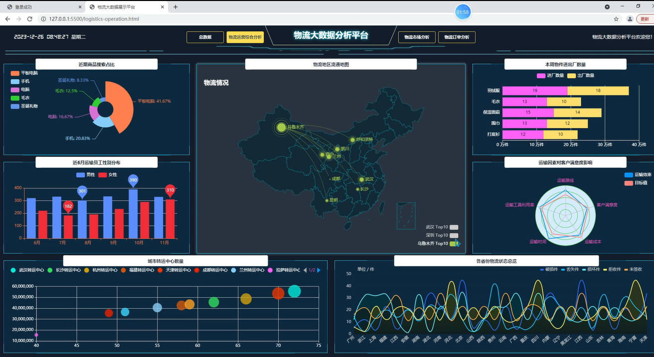 物流大数据分析平台大屏模版源码的开发与实现摘要:随着物流行业的快速发展,对物流数据的分析和可视化需求日益增加。本文介绍了物流大数据分析平台大屏模版源码的开发过程,包括HTML、CSS、JS和JSON等技术的运用,以及如何实现高效的数据可视化。一、引言物流大数据分析平台大屏模版源码是实现物流数据可视化的一种重要手段。通过该模版,可以实时展示物流数据,帮助企业更好地了解物流情况,优化资源配置,提高运营效率。本文将介绍如何使用HTML、CSS、JS和JSON等技术实现物流大数据分析平台大屏模版源码的开发。二、技术实现HTML结构HTML是网页的基础结构,用于定义网页的内容和布局。在物流大数据分析平台大屏模版源码中,我们使用HTML来构建页面的基本框架和元素。CSS样式CSS用于控制网页的样式和布局。通过CSS,我们可以对HTML元素进行样式化,使其更具可读性和美观性。在物流大数据分析平台大屏模版源码中,我们使用CSS来定义图表的颜色、字体等样式。JS交互逻辑JS用于实现网页的交互逻辑。通过JS,我们可以对用户的操作进行响应,并动态地更新网页内容。在物流大数据分析平台大屏模版源码中,我们使用JS来实现图表的数据动态展示和交互功能。JSON数据格式JSON是一种轻量级的数据交换格式,易于阅读和编写。在物流大数据分析平台大屏模版源码中,我们使用JSON来存储和传输数据。三、数据可视化实现数据处理数据处理是数据可视化的重要步骤。在物流大数据分析平台大屏模版源码中,我们使用数据处理技术对原始数据进行清洗、去重和分类等操作,以便更好地进行可视化展示。图表展示图表展示是数据可视化的核心部分。在物流大数据分析平台大屏模版源码中,我们使用了多种图表类型,如折线图、柱状图、饼图等,以更直观地展示物流数据。同时,我们还使用了动态图表技术,以实时更新图表数据。