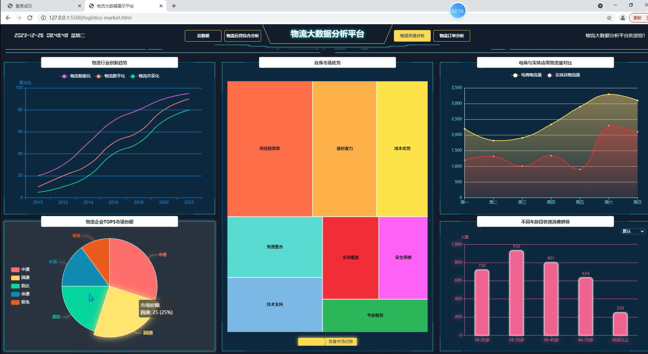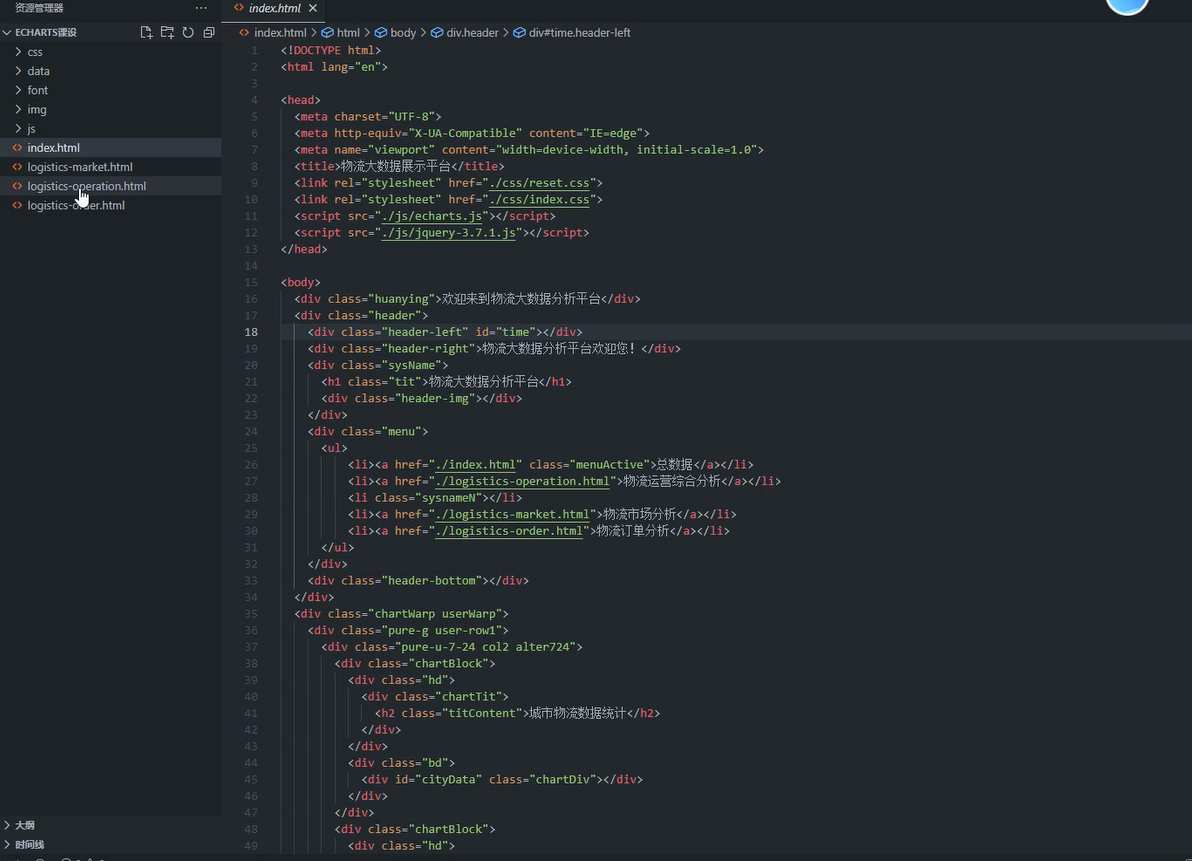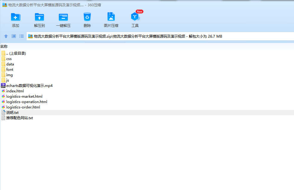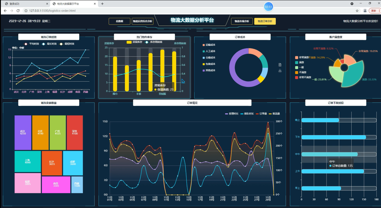 物流大数据分析平台大屏模版源码的开发与实现摘要:随着物流行业的快速发展,对物流数据的分析和可视化需求日益增加。本文介绍了物流大数据分析平台大屏模版源码的开发过程,包括HTML、CSS、JS和JSON等技术的运用,以及如何实现高效的数据可视化。一、引言物流大数据分析平台大屏模版源码是实现物流数据可视化的一种重要手段。通过该模版,可以实时展示物流数据,帮助企业更好地了解物流情况,优化资源配置,提高运营效率。本文将介绍如何使用HTML、CSS、JS和JSON等技术实现物流大数据分析平台大屏模版源码的开发。二、技术实现HTML结构HTML是网页的基础结构,用于定义网页的内容和布局。在物流大数据分析平台大屏模版源码中,我们使用HTML来构建页面的基本框架和元素。CSS样式CSS用于控制网页的样式和布局。通过CSS,我们可以对HTML元素进行样式化,使其更具可读性和美观性。在物流大数据分析平台大屏模版源码中,我们使用CSS来定义图表的颜色、字体等样式。JS交互逻辑JS用于实现网页的交互逻辑。通过JS,我们可以对用户的操作进行响应,并动态地更新网页内容。在物流大数据分析平台大屏模版源码中,我们使用JS来实现图表的数据动态展示和交互功能。JSON数据格式JSON是一种轻量级的数据交换格式,易于阅读和编写。在物流大数据分析平台大屏模版源码中,我们使用JSON来存储和传输数据。三、数据可视化实现数据处理数据处理是数据可视化的重要步骤。在物流大数据分析平台大屏模版源码中,我们使用数据处理技术对原始数据进行清洗、去重和分类等操作,以便更好地进行可视化展示。图表展示图表展示是数据可视化的核心部分。在物流大数据分析平台大屏模版源码中,我们使用了多种图表类型,如折线图、柱状图、饼图等,以更直观地展示物流数据。同时,我们还使用了动态图表技术,以实时更新图表数据。