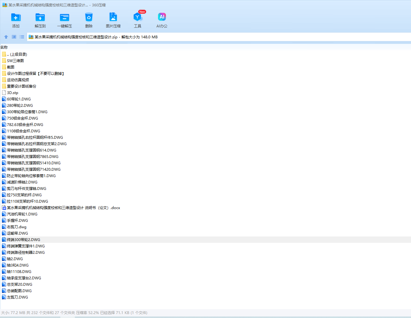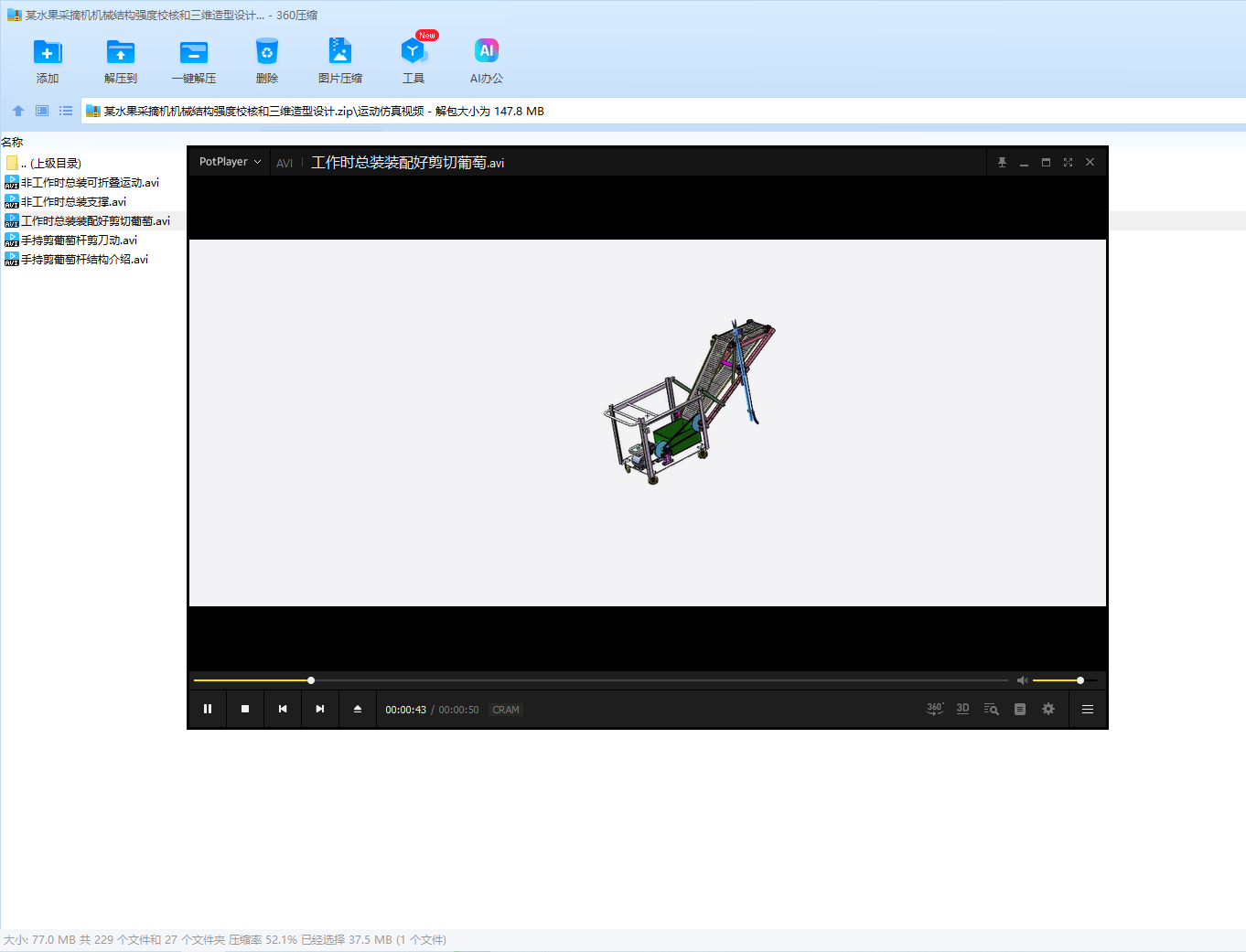 本课题针对国内鲜食葡萄需求量大,而且采摘环节没有机械化的问题设计一种机器,手持杆状剪刀,手握端采用自行车手捏闸形式,工作端设计路径控制器控制剪刀的开,用弹簧控制剪刀的闭。可折叠葡萄输送机构,闲时可折叠。总机架机构的结构形式和结构尺寸,动力传动系统,并确定主要零、部件的结构尺寸及其选型。并进行强度校核和三维造型和装配,为鲜食葡萄采摘提供了一种新的机器。