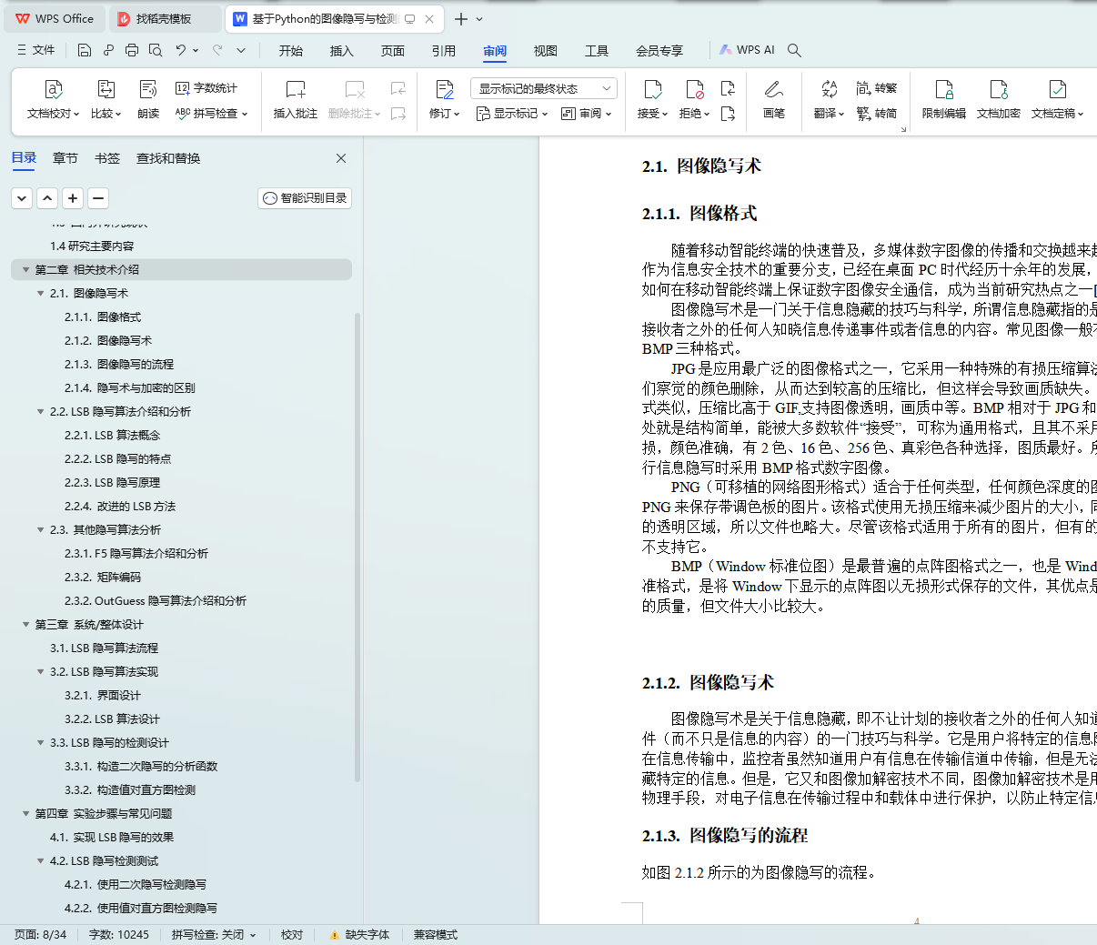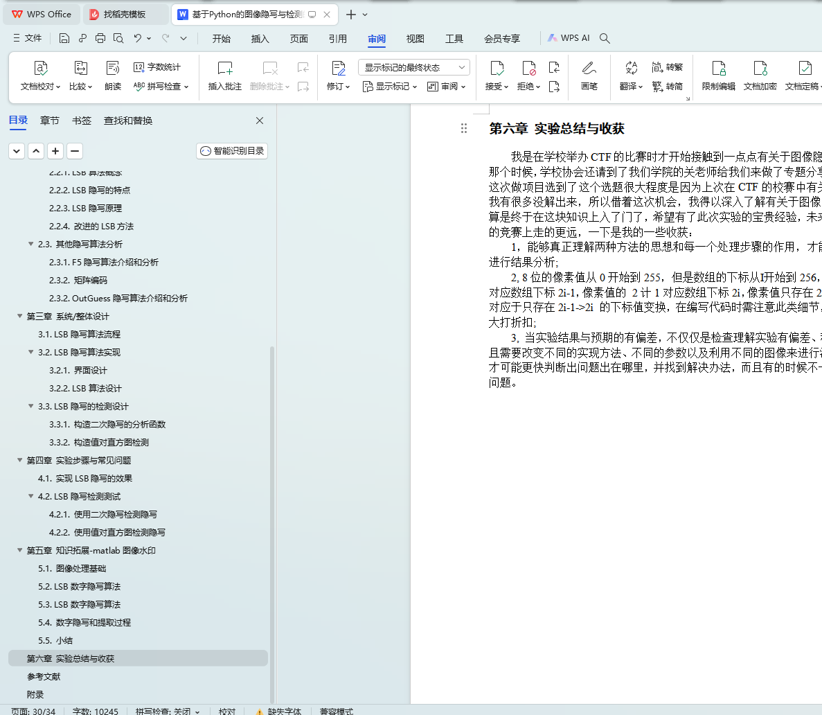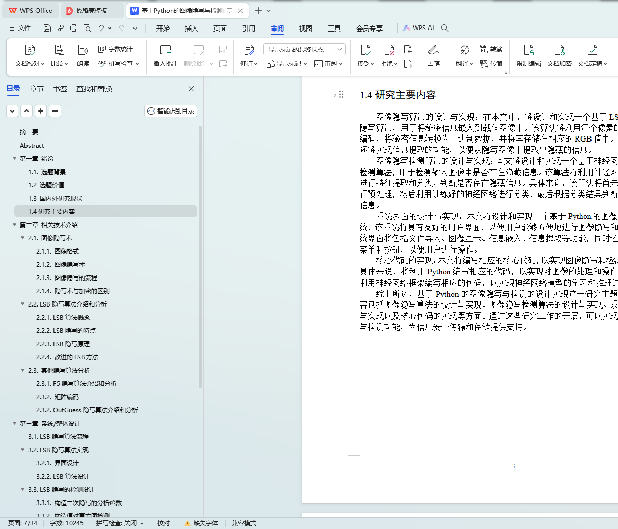 本论文研究了基于Python的图像隐写与检测的设计实现。首先,我们介绍了图像隐写技术的背景和意义,以及现有的图像隐写和检测方法。然后,我们详细介绍了我们的研究内容和贡献,包括图像隐写算法、图像隐写检测算法、系统界面和核心代码的实现。通过实验验证,我们的方法可以有效地实现图像的隐写和检测,同时具有良好的隐蔽性和可靠性。